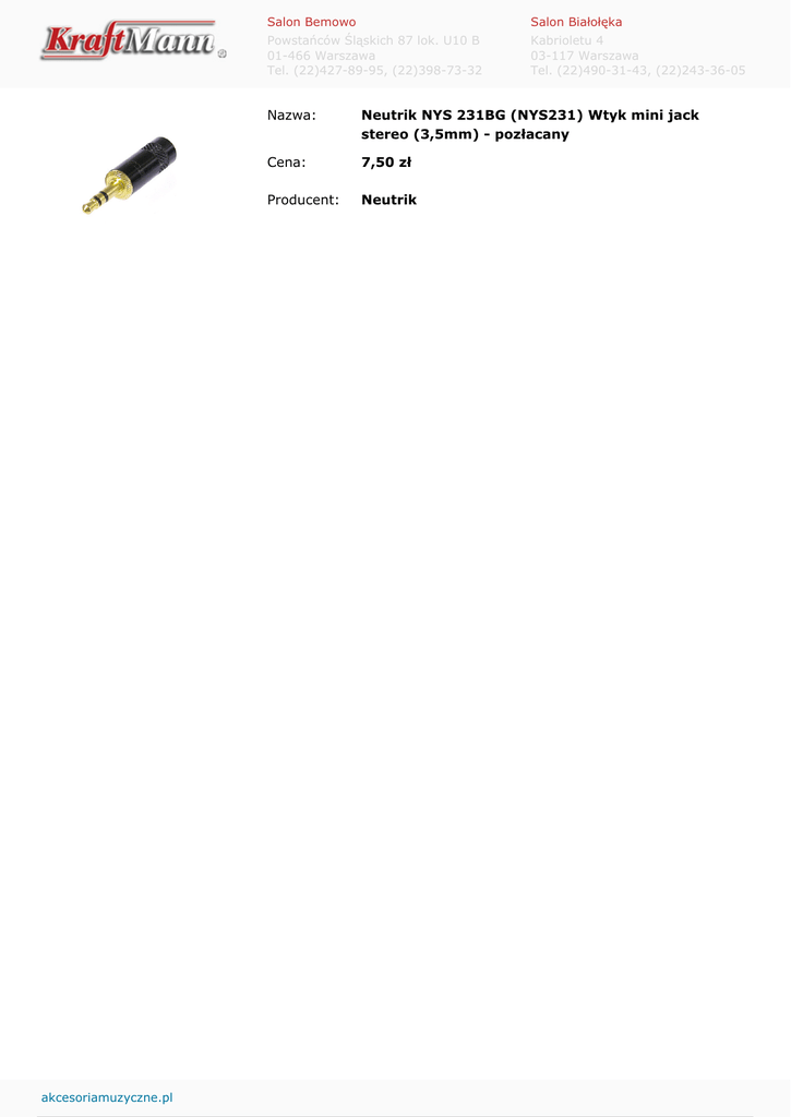 akcesoriamuzyczne.pl Salon Bemowo Salon Białołęka Powstańców Śląskich 87 lok. U10 B 01-466 Warszawa Tel. (22)427-89-95, (22)398-73-32 Kabrioletu 4 03-117 Warszawa Tel. (22)490-31-43, (22)243-36-05 Nazwa: Neutrik NYS 231BG (NYS231) Wtyk mini jack stereo (3,5mm) - pozłacany Cena: 7,50 zł Producent: Neutrik