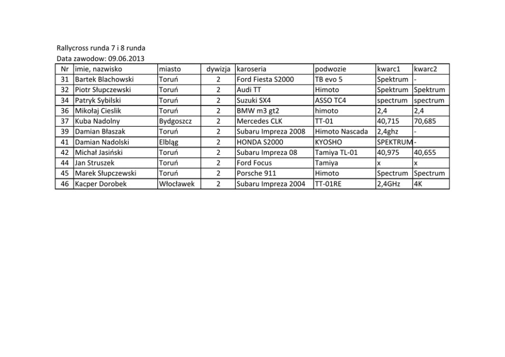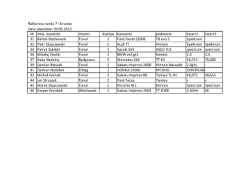 Rallycross runda 7 i 8 runda Data zawodow: 09.06.2013 Nr imie, nazwisko 31 Bartek Blachowski 32 Piotr Słupczewski 34 Patryk Sybilski 36 Mikołaj Cieslik 37 Kuba Nadolny 39 Damian Błaszak 41 Damian Nadolski 42 Michał Jasiński 44 Jan Struszek 45 Marek Słupczewski 46 Kacper Dorobek miasto Toruń Toruń Toruń Toruń Bydgoszcz Toruń Elbląg Toruń Toruń Toruń Włocławek dywizja 2 2 2 2 2 2 2 2 2 2 2 karoseria Ford Fiesta S2000 Audi TT Suzuki SX4 BMW m3 gt2 Mercedes CLK Subaru Impreza 2008 HONDA S2000 Subaru Impreza 08 Ford Focus Porsche 911 Subaru Impreza 2004 podwozie TB evo 5 Himoto ASSO TC4 himoto TT-01 Himoto Nascada KYOSHO Tamiya TL-01 Tamiya Himoto TT-01RE kwarc1 kwarc2 Spektrum Spektrum Spektrum spectrum spectrum 2,4 2,4 40,715 70,685 2,4ghz SPEKTRUM 40,975 40,655 x x Spectrum Spectrum 2,4GHz 4K