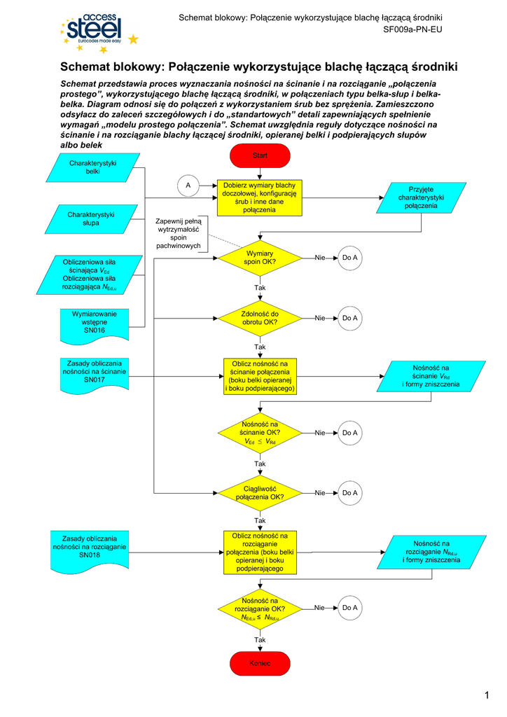 Schemat blokowy: Połączenie wykorzystujące blachę łączącą środniki SF009a-PN-EU Schemat blokowy: Połączenie wykorzystujące blachę łączącą środniki Schemat przedstawia proces wyznaczania nośności na ścinanie i na rozciąganie „połączenia prostego”, wykorzystującego blachę łączącą środniki, w połączeniach typu belka-słup i belkabelka. Diagram odnosi się do połączeń z wykorzystaniem śrub bez spręŜenia. Zamieszczono odsyłacz do zaleceń szczegółowych i do „standartowych” detali zapewniających spełnienie wymagań „modelu prostego połączenia”. Schemat uwzględnia reguły dotyczące nośności na ścinanie i na rozciąganie blachy łączącej środniki, opieranej belki i podpierających słupów albo belek Start Charakterystyki belki A Charakterystyki słupa Obliczeniowa siła ścinająca VEd Obliczeniowa siła rozciągająca NEd,u Wymiarowanie wstępne SN016 Dobierz wymiary blachy doczołowej, konfigurację śrub i inne dane połączenia Przyjęte charakterystyki połączenia Zapewnij pełną wytrzymałość spoin pachwinowych Wymiary spoin OK? Nie Do A Nie Do A Tak Zdolność do obrotu OK? Tak Zasady obliczania nośności na ścinanie SN017 Oblicz nośność na ścinanie połączenia (boku belki opieranej i boku podpierającego) Nośność na ścinanie OK? VEd ≤ VRd Nośność na ścinanie VRd i formy zniszczenia Nie Do A Nie Do A Tak Ciągliwość połączenia OK? Tak Zasady obliczania nośności na rozciąganie SN018 Oblicz nośność na rozciąganie połączenia (boku belki opieranej i boku podpierającego Nośność na rozciąganie OK? NEd,u ≤ NRd,u Nośność na rozciąganie NRd,u i formy zniszczenia Nie Do A Tak Koniec 1 Schemat blokowy: Połączenie wykorzystujące blachę łączącą środniki SF009a-PN-EU Quality Record RESOURCE Title Schemat blokowy: Połączenie wykorzystujące blachę łączącą środniki Reference(s) ORIGINAL DOCUMENT Name Company Date Created by Abdul Malik Steel Construction Institute Mar 2005 Technical content checked by Graham Owens Steel Construction Institute Aug 2005 Editorial content checked by D C Iles SCI 16/9/05 1. UK G W Owens SCI 16/9/05 2. France A Bureau CTICM 16/9/05 3. Sweden A Olsson SBI 15/9/05 4. Germany C Müller RWTH 14/9/05 5. Spain J Chica Labein 16/9/05 G W Owens SCI 5/6/06 Technical content endorsed by the following STEEL Partners: Resource approved by Technical Coordinator TRANSLATED DOCUMENT This translation made and checked by: B. Stankiewicz Translated resource approved by 2 Schemat blokowy: Połączenie wykorzystujące blachę łączącą środniki SF009a-PN-EU Wrapper information Title Schemat blokowy: Połączenie wykorzystujące blachę łączącą środniki Series Description Schemat przedstawia proces wyznaczania nośności na ścinanie i na rozciąganie „połączenia prostego”, wykorzystującego blachę łączącą środniki, w połączeniach typu belka-słup i belka-belka. Diagram odnosi się do połączeń z wykorzystaniem śrub bez spręŜenia. Zamieszczono odsyłacz do zaleceń szczegółowych i do „standartowych” detali zapewniających spełnienie wymagań „modelu prostego połączenia”. Schemat uwzględnia reguły dotyczące nośności na ścinanie i na rozciąganie blachy łączącej środniki, opieranej belki i podpierających słupów albo belek Access Level Expertise Practitioner Identifiers Filename SF009a-PL-EU.vsd Resource Type Schemat blokowy Viewpoint Engineer Subject Application Area(s) Budynki wielokondygnacyjne Dates Created Date 15/03/2005 Format Category Last Modified Date Checked Date Valid From Valid To Languages Polski Contacts Author Abdul Malik, Steel Construction Institute Checked By Graham Owens, Steel Construction Institute Approved By Editor Keywords See Also Last Modified By Blachy węzłowe do łączenia słupów ze środnikami belek, połączenia śrubowe, belki, słupy, wytrzymałość na ścinanie, nośność połączenia belka-słup równolegle do osi belki, ciągliwość Eurocode Reference EN 1993-1-1 : 2005; EN 1993-1-8 : 2005 Worked Examples SX013 Commentary Discussion Coverage Other SN016, SN017, SN018 National Applicability Europe Special Instructions 3