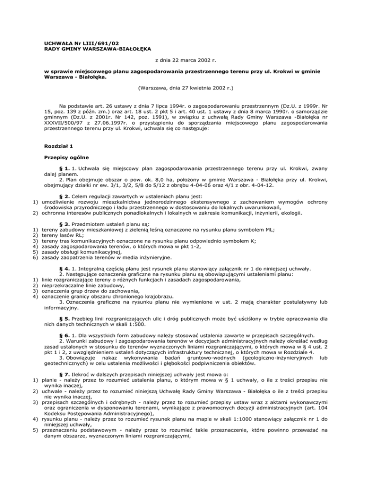 UCHWAŁA Nr LIII/691/02 RADY GMINY WARSZAWA-BIAŁOŁĘKA z dnia 22 marca 2002 r. w sprawie miejscowego planu zagospodarowania przestrzennego terenu przy ul. Krokwi w gminie Warszawa - Białołęka. (Warszawa, dnia 27 kwietnia 2002 r.) Na podstawie art. 26 ustawy z dnia 7 lipca 1994r. o zagospodarowaniu przestrzennym (Dz.U. z 1999r. Nr 15, poz. 139 z późn. zm.) oraz art. 18 ust. 2 pkt 5 i art. 40 ust. 1 ustawy z dnia 8 marca 1990r. o samorządzie gminnym (Dz.U. z 2001r. Nr 142, poz. 1591), w związku z uchwałą Rady Gminy Warszawa -Białołęka nr XXXVII/500/97 z 27.06.1997r. o przystąpieniu do sporządzania miejscowego planu zagospodarowania przestrzennego terenu przy ul. Krokwi, uchwala się co następuje: Rozdział 1 Przepisy ogólne § 1. 1. Uchwala się miejscowy plan zagospodarowania przestrzennego terenu przy ul. Krokwi, zwany dalej planem. 2. Plan obejmuje obszar o pow. ok. 8,0 ha, połoŜony w gminie Warszawa - Białołęka przy ul. Krokwi, obejmujący działki nr ew. 3/1, 3/2, 5/8 do 5/12 z obrębu 4-04-06 oraz 4/1 z obr. 4-04-12. § 2. Celem regulacji zawartych w ustaleniach planu jest: 1) umoŜliwienie rozwoju mieszkalnictwa jednorodzinnego ekstensywnego z zachowaniem wymogów ochrony środowiska przyrodniczego i ładu przestrzennego w dostosowaniu do lokalnych uwarunkowań, 2) ochronna interesów publicznych ponadlokalnych i lokalnych w zakresie komunikacji, inŜynierii, ekologii. 1) 2) 3) 4) 5) 6) 1) 2) 3) 4) § 3. Przedmiotem ustaleń planu są: tereny zabudowy mieszkaniowej z zielenią leśną oznaczone na rysunku planu symbolem ML; tereny lasów RL; tereny tras komunikacyjnych oznaczone na rysunku planu odpowiednio symbolem K; zasady zagospodarowania terenów, o których mowa w pkt 1-2, zasady obsługi komunikacyjnej, zasady zaopatrzenia terenów w media inŜynieryjne. § 4. 1. Integralną częścią planu jest rysunek planu stanowiący załącznik nr 1 do niniejszej uchwały. 2. Następujące oznaczenia graficzne na rysunku planu są obowiązującymi ustaleniami planu: linie rozgraniczające tereny o róŜnych funkcjach i zasadach zagospodarowania, nieprzekraczalne linie zabudowy, oznaczenia grup drzew do zachowania, oznaczenie granicy obszaru chronionego krajobrazu. 3. Oznaczenia graficzne na rysunku planu nie wymienione w ust. 2 mają charakter postulatywny lub informacyjny. § 5. Przebieg linii rozgraniczających ulic i dróg publicznych moŜe być uściślony w trybie opracowania dla nich danych technicznych w skali 1:500. § 6. 1. Dla wszystkich form zabudowy naleŜy stosować ustalenia zawarte w przepisach szczególnych. 2. Warunki zabudowy i zagospodarowania terenów w decyzjach administracyjnych naleŜy określać według zasad ustalonych w stosunku do terenów wyznaczonych liniami rozgraniczającymi, o których mowa w § 4 ust. 2 pkt 1 i 2, z uwzględnieniem ustaleń dotyczących infrastruktury technicznej, o których mowa w Rozdziale 4. 3. Obowiązuje nakaz wykonywania badań gruntowo-wodnych (geologiczno-inŜynieryjnych lub geotechnicznych) w celu ustalenia moŜliwości i głębokości podpiwniczenia obiektów. § 7. Ilekroć w dalszych przepisach niniejszej uchwały jest mowa o: 1) planie - naleŜy przez to rozumieć ustalenia planu, o którym mowa w § 1 uchwały, o ile z treści przepisu nie wynika inaczej, 2) uchwale - naleŜy przez to rozumieć niniejszą Uchwałę Rady Gminy Warszawa - Białołęka o ile z treści przepisu nie wynika inaczej, 3) przepisach szczególnych i odrębnych - naleŜy przez to rozumieć przepisy ustaw wraz z aktami wykonawczymi oraz ograniczenia w dysponowaniu terenami, wynikające z prawomocnych decyzji administracyjnych (art. 104 Kodeksu Postępowania Administracyjnego), 4) rysunku planu - naleŜy przez to rozumieć rysunek planu na mapie w skali 1:1000 stanowiący załącznik nr 1 do niniejszej uchwały, 5) przeznaczeniu podstawowym - naleŜy przez to rozumieć takie przeznaczenie, które powinno przewaŜać na danym obszarze, wyznaczonym liniami rozgraniczającymi, 6) przeznaczeniu dopuszczalnym - naleŜy przez to rozumieć rodzaje przeznaczenia inne niŜ podstawowe, które uzupełniają lub wzbogacają przeznaczenie podstawowe, 7) obszarze lub terenie - naleŜy przez to rozumieć obszar o określonym rodzaju przeznaczenia podstawowego, wyznaczony na rysunku planu liniami rozgraniczającymi, 8) usługach podstawowych nieuciąŜliwych - naleŜy przez to rozumieć usługi, których celem jest zaspokajanie podstawowych potrzeb miejscowej ludności, a które nie wytwarzają dóbr materialnych bezpośrednimi metodami przemysłowymi, to jest taką działalność detaliczną, jak zakłady usług bytowych np. fryzjerstwo, magiel, naprawa obuwia, naprawa sprzętu gospodarstwa domowego i elektrotechnicznego, drobne ślusarstwo, handel detaliczny itp. 9) wartościowej zieleni - naleŜy przez to rozumieć pojedyncze drzewa lub grupy drzew i krzewów wskazane do zachowania po przeprowadzeniu inwentaryzacji zieleni wraz z jej waloryzacją, objęte ochroną w rozumieniu przepisów o ochronie środowiska, 10) powierzchni biologicznie czynnej - naleŜy przez to rozumieć część działki budowlanej, która pozostaje niezabudowana powierzchniowo lub kubaturowo w głąb gruntu, na nim oraz nad nim; nie stanowiąca nawierzchni dojazdów i dojść pieszych, pokryta trwałą roślinnością lub uŜytkowana rolniczo, 11) planie ogólnym Warszawy - naleŜy rozumieć przez to tekst i rysunek miejscowego planu ogólnego zagospodarowania przestrzennego m.st. Warszawy, zatwierdzonego przez Radę m.st. Warszawy uchwałą nr XXXV/199/92 z dnia 28 września 1992r. 12) warszawskim obszarze chronionego krajobrazu - naleŜy przez to rozumieć obszar, na którym obowiązują ograniczenia i zakazy zgodnie z załącznikiem nr 2 do Rozporządzenia Nr 117 Wojewody Mazowieckiego z dnia 3 sierpnia 2000r. w sprawie zmiany Rozporządzenia Wojewody Warszawskiego z dnia 29 sierpnia 1997r. w sprawie utworzenia obszaru chronionego krajobrazu na terenie województwa w
