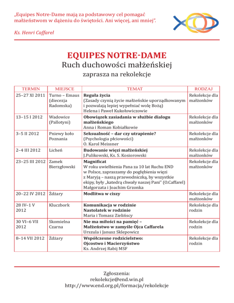 „Equipes Notre-Dame mają za podstawowy cel pomagać małżeństwom w dążeniu do świętości. Ani więcej, ani mniej”. Ks. Henri Caffarel EQUIPES NOTRE DAME Ruch duchowości małżeńskiej zaprasza na rekolekcje TERMIN MIEJSCE TEMAT 25–27 XI 2011 Turno – Emaus Reguła życia (diecezja (Zasady czynią życie małżeńskie uporządkowanym Radomska) i pozwalają lepiej wypełniać wolę Bożą) Helena i Paweł Kukołowiczowie 13–15 I 2012 Wadowice Obowiązek zasiadania w służbie dialogu (Pallotyni) małżeńskiego Anna i Roman Kobiałkowie 3–5 II 2012 Pniewy koło Seksualność – dar czy utrapienie? Poznania (Psychologia płciowości) O. Karol Meissner 2–4 III 2012 Licheń Budowanie więzi małżeńskiej J.Pulikowski, Ks. S. Kosiorowski 23–25 III 2012 Zamek Magni icat Bierzgłowski W roku uwielbienia Pana za 10 lat Ruchu END w Polsce, zapraszamy do pogłębienia więzi z Maryją – naszą przewodniczką, by wszystkie ekipy, były „katedrą chwały naszej Pani” (O.Caffarel) Małgorzata i Joachim Grzonka 20–22 IV 2012 Żdżary Modlitwa w ciszy 28 IV–1 V 2012 Kluczbork 30 VI–6 VII 2012 Skomielna Czarna 8–14 VII 2012 Żdżary Komunikacja w rodzinie Nastolatek w rodzinie Maria i Tomasz Zielińscy Nie ma miłości na pamięć – Małżeństwo w zamyśle Ojca Caffarela Urszula i Janusz Sklepowicz Współczesne rodzicielstwo: Ojcostwo i Macierzyństwo Ks. Andrzej Rabij MSF Zgłoszenia: [email protected] http://www.end.org.pl/formacja/rekolekcje RODZAJ Rekolekcje dla małżonków Rekolekcje dla małżonków Rekolekcje dla małżonków Rekolekcje dla małżonków Rekolekcje dla małżonków Rekolekcje dla małżonków Rekolekcje dla rodzin Rekolekcje dla rodzin Rekolekcje dla rodzin
