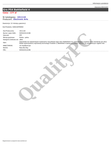 Informacje o produkcie Utworzono 08-03-2017 Gra PS4 Battlefield 4 Cena : 177 zł Nr katalogowy : 1011118 Producent : Electronic Arts Gwarancja: 12 miesięcy gwarancji Kod Produktu: GIAELSGP40002 Kod Producenta: 1011118 Numer części EAN:: 5035223112198 Gatunek: FPP Wersja językowa: Polska - pełna C Kategoria wiekowa od:: 18lat Zapowiada się najważniejsze wydarzenie rozrywkowe tego roku! Battlefield 4 to ustanawiająca zupełnie nowe standardy gra akcji. Dzięki wykorzystaniu najnowszej technologii Frostbite 3, Battlefield 4 dostarcza wrażeń, których nie doświadczysz nigdzie indz KINECT/MOVE: nie współpracuje Nośnik: Płyta Blu-Ray P/N:: 5035223112198 Q ua lit yP Opis: Wygenerowano w programie www.oscGold.com