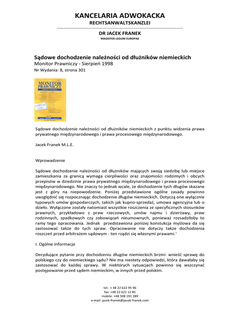 KANCELARIA ADWOKACKA RECHTSANWALTSKANZLEI DR JACEK FRANEK MAGISTER LEGUM EUROPAE Sądowe dochodzenie należności od dłużników niemieckich Monitor Prawniczy - Sierpień 1998 Nr Wydania: 8, strona 301 Sądowe dochodzenie należności od dłużników niemieckich z punktu widzenia prawa prywatnego międzynarodowego i prawa procesowego międzynarodowego. Jacek Franek M.L.E. Wprowadzenie Sądowe dochodzenie należności od dłużników mających swoją siedzibę lub miejsce zamieszkania za granicą wymaga cierpliwości oraz znajomości rodzimych i obcych przepisów w dziedzinie prawa prywatnego międzynarodowego i prawa procesowego międzynarodowego. Nie znaczy to jednak wcale, że dochodzenie tych długów skazane jest z góry na niepowodzenie. Poniżej przedstawione ogólne zasady powinno uwzględnić się rozpocznając dochodzenie długów niemieckich. Dotyczą one wyłącznie typowych umów gospodarczych, takich jak kupno-sprzedaż, umowa agencyjna lub o dzieło. Wyłączone zostały natomiast wszystkie roszczenia ze specyficznych stosunków prawnych, przykładowo z praw rzeczowych, umów najmu i dzierżawy, praw rodzinnych, spadkowych czy zobowiązań nieumownych, ponieważ rozsadziłoby to ramy tego opracowania. Jednak przedstawiona poniżej konstukcja myślowa da się zastosować także do tych spraw. Opracowanie nie dotyczy także dochodzenia roszczeń przed arbitrażem sądowym - ten rządzi się własnymi prawami.1 I. Ogólne informacje Decydujące pytanie przy dochodzeniu długów niemieckich brzmi: wnieść sprawę do polskiego czy do niemieckiego sądu? Nie ma niestety odpowiedzi, która dawałaby się zastosować do każdej sprawy. W niektórych sytuacjach powinno się wszczynać postępowanie przed sądem niemieckim, w innych przed polskim. tel.: + 48 22 622 95 96 fax: +48 22 622 12 85 mobile: +48 508 191 289 e-mail: [email protected] Po pierwsze należy stwierdzić, który z sądów posiada jurysdykcję krajową. Między Polską a Niemcami nie została podpisana żadana umowa międzynarodowa w tej dziedzinie, rozstrzygnięcie tej kwestii następuje więc na podstawie autonomicznego prawa wewnętrznego każdego kraju. Konsekwencją tego jest, że najczęściej sądy obydwu państw posiadają jurysdykcję krajową. Powództwo można więc wnieść - pod warunkiem, że zagwarantowana jest także właściwość miejscowa - w każdym z państw. Pokusa złożenia pozwu przed polski sąd jest w tej sytuacji, z oczywistych względów praktycznych, bardzo duża. Pytanie, które trzeba jednak zadać sobie w tym momencie, brzmi: czy orzeczenie sądu tego państwa, w którym dłużnik nie ma swojej siedziby, może zostać uznane w państwie jego siedziby - tam, gdzie znajduje się jego majątek. Konkretnie mówiąc chodzi o to, jakie przesłanki muszą być spełnione, by orzeczenie polskiego sądu nakazujące niemieckiemu dłużnikowi zapłatę należności wobec polskiego kontrahenta zostało zaakceptowane przez niemieckiego komornika. Problem ten nie istnieje, jeśli wnosi się powództwo w sądzie niemieckim, bo jego wyroki stanowią bezpośrednią podstawę do egzekucji. Tutaj jednak niezbędne będzie z reguły włączenie niemieckiego adwokata. Zamierzając prowadzić sprawę w Niemczech nie należy w każdym bądź razie wnosić wcześniej powództwa przed sąd polski. Zagraniczna zawiłość sporu w tej samej sprawie stanowi w Niemczech uwzględnianą z urzędu przeszkodę procesową, o ile istnieje pozytywna prognoza co do późniejszego uznania zagranicznego wyroku.2 Natomiast przed sądami polskimi ograniczenie takie zdaje się nie istnieć.3 II. Dochodzenie należności przed sądami niemieckimi 1. Jurysdykcja krajowa Oznaczenie krajowej jurysdykcji nie doczekało się do tej pory w Niemczech specjalnego uregulowania, tak jak ma to miejsce w 1100 i nast. kpc. Do ustalenia jej stosuje się odpowiednio przepisy dotyczące właściwości miejscowej sądów cywilnych. 4 Być może z tego względu ukuło się określenie "właściwość międzynarodowa" (internationale Zuständigkeit). Różnicuje się pomiędzy ogólną, przemienną i wyłączną jurysdykcją.5 Szczególnym przypadkiem jest postępowanie upominawcze, o czym w punkcie II 4. Sądy niemieckie posiadają zgodnie z § 13 ZPO6 ogólną jurysdykcję krajową przede wszystkim wtedy, gdy pozwany ma w Niemczech miejsce zamieszkania, a w jego braku miejsce pobytu. Jurysdykcji niemieckiej poddane są zgodnie z § 17 I zd.1 ZPO także roszczenia wobec osób prawnych oraz spółek bez zdolności prawnej posiadających pasywną zdolność sądową,7 jeśli mają one w Niemczech swoją siedzibę. Jeśli statut spółki nie określa jej siedziby, miarodajne jest miejsce rzeczywistego zarządu spółki.8 Stwierdzenie jurysdykcji krajowej sądów niemieckich na podstawie miejsca zamieszkania lub siedziby jest dla potrzeb tego akapitu w zasadzie wystarczalne proces właśnie dlatego prowadzony jest w kraju zamieszkania dłużnika, żeby móc prowadzić bezpośrednią egzekucję z jego majątku. Jednak określenie jeszcze trzech przypadków przemiennej jurysdykcji krajowej sądów niemieckich niezbędne będzie przy przedstawieniu przesłanek do uznania wyroków sądów polskich w Niemczech. Systematycznie muszą te przypadki przedstawione zostać w tym miejscu. tel.: + 48 22 622 95 96 fax: +48 22 622 12 85 mobile: +48 508 191 289 e-mail: [email protected] Jurysdykcji sądów niemieckich poddane są zgodnie z § 38 II ZPO spory, co do których strony ustaliły umownie właściwość tych sądów (prorogacja).9 Prorogacja w umowach międzynarodowych obwarowana jest zgodnie z §§ 38 i 40 ZPO kilkoma ograniczeniami.10 Dwa z nich wymagają przedstawienia.11 Po pierwsze wymagana jest forma pisemna pod rygorem nieważności.12 Wystarczające jest sformułowanie: właściwość sądów niemieckich. Klauzula prorogacyjna musi ponadto dotyczyć konkretnego stosunku prawnego.13 Nieważne są zatem postanowienia, które poddają jurysdykcji