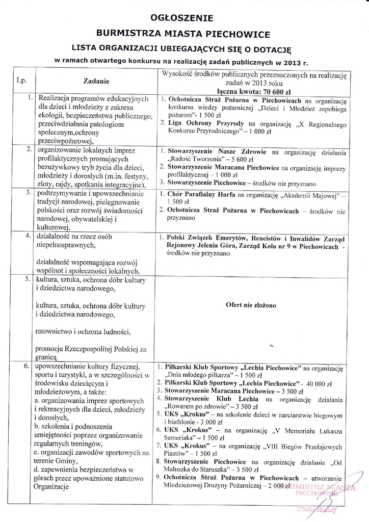 oGŁoszENIE BURMISTRZA MIASTA PIECHOWICE LISTA oRGANIZACJI UBIEGAJĄCYCH sIĘ o DoTAcJĘ w ramach otwartego konkursu na realizację zadań publicznych w 2013 r. Lp. Wysokośćśrodków pubIicznych pr'-ńczonffia reaIi'ację zadań w 2013 roku łączna kwota:10 600 zł 1. Ochotnicza Straz Pozańa w Fiechowicach na olganlzacJę konkursu wiedzy pożarniczej ,,Dzieci i Młodzieżzapobiega pożarom''- 1 500 zł 2. Liga ochrony Prryrody na organizację ',X Regionalnego Konkursu Przyrodniczego'' _ l 000 zł Zarf,anie Realizacja programów edukacyjnych dla dzieci i młodzieżyz zak<resl ekologii, bezpieczeństwa publicznego, prze ciw działania pato l o giom społecznym,ochrony przeciwpożarowej, 2. organizowanie lokalnych imprez profi laktycznych promuj ących bezużyłvkowy tryb zycia dla dzieci, młodzieży i dorosłych (m.in. festyny, zloty, rafiy,spotkania integracyine). 3. podtrzymywanie i upowszechnianie tradycji narodowej. pielęgnowanie polskości oraz rozwój świadomości narodowej, obywatelskiej i kulturowej, 4. działalnośÓ na rzecz osób niepełnosprawnych, ' I ' Stowarryszenie Nasze Zdrowie ,a organi^ąę dirałar^ Tworzenia'' _ 5 600 zł ',Radość Stowarryszenie Maracana Piechowice na organizację imprezy profilaktycznej l 000 zł J. Stowarryszenie Piechowice środków nie przyznano 1 l' Chór Parafialny llarfa na organizację Majowej" ''Akadelnii l 500 zł Ochotnicza Straż Pożarna w Piechowicach - środków nie przyznano 1. Polski Związek Ernerytów, Rencistów i tnwaIiaów zarząa Rejonowy Jelenia Góra, Zarząd Kola nr 9 w Piechowicach środków nie prryznano 5. działalnośówspomagaj ąca rozwój \vspólnot i społeczności lokalnych' kultrrra' sŻuka, ochrona dóbr kultury i dzie dzictw a naro dowe go, Ofert nie złożono kultura, sztuka, ochrona dóbr kultury i dzie dzi ctw a narodowe go, ratownictwo i ochrona Iudności, promocja Rzeczpospolitej Polskiej za granicą 6. upowszechnianie kultury fi zycznej, sportu i turystyki, a w szczególności w środowisku dziecięcym i mło dzieżowym, a tal<Że : a. organizowania imprez sportowych i rekeacyjnych dla dzieci, młodzieży i dorosłych, b. szkolenia i podnoszenia umiejętności poprzez organizorł an ie regulamych treningów, c. organizacji zawodów spońowych na terenie Gminy, d. zapewnienia bezpieczeństwa w górach przez upoważnione statutowo Organizacj e Piłkarski Klub Sportowy ''Dnia młodego piłkarza'' _ ',Lechia 1 500 zł Piechowice'' na oiganizację Piłkarski K|ub Sportowy ,,Lechia Piechowice'' - 40 000 zł 3 Stowarzyszenie Maracana Piechowice _ 3 500 zł 4 Stowłrryszenie Klub Lechia na organizację działania ,,Rowerem po zdrowie'' _ 3 500 zł UKS ,,Krokus" - na szkolenie dzieci w narciarstwie biegowym 2 ibiathlonie-3000zł _ na organizację ''Krokus'' ''V Memoriału Łukasza Semeriaka''_1500zł UKS na organizację ,,VIII Biegów Przełajowych ''Krokus'' Piastów'' _ 1 500 zł UKS Stowarzyszenie Piechowice na organizację działania ,,od Maluszka do Staruszka'' _ 3 500 zł Ochotnicza Straż Pożarna w Piechowicach _ MłodzieżowejDrużyny Pożamiczej _ Ż 000 dl< !jli:, i ]i.a ".7r'