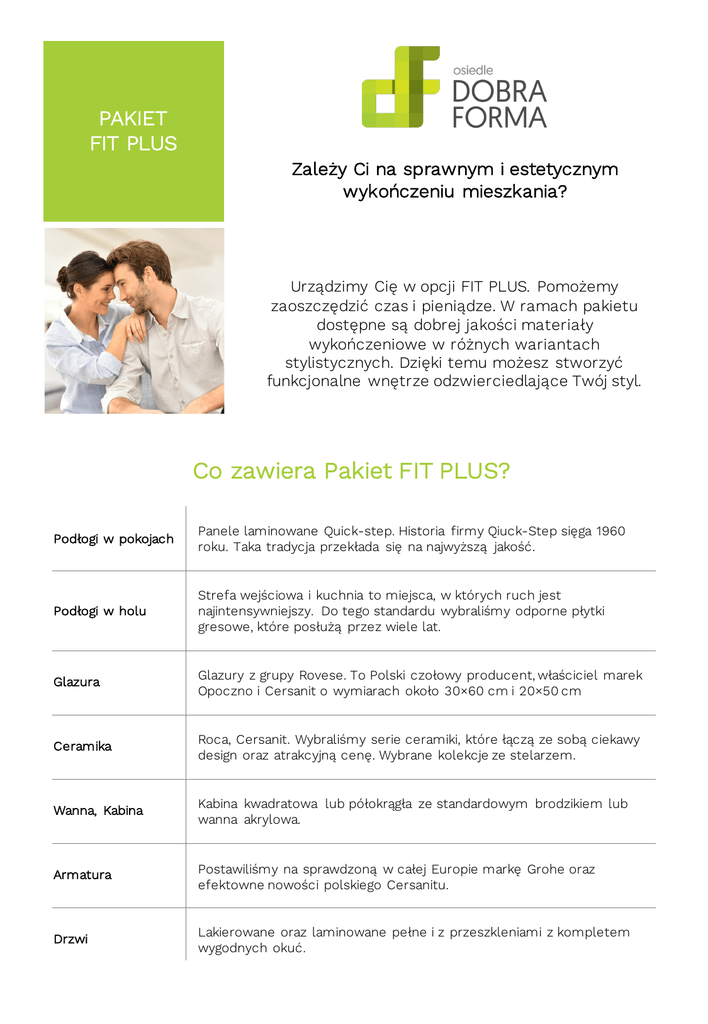 PAKIET FIT PLUS Zależy Ci na sprawnym i estetycznym wykończeniu mieszkania? Urządzimy Cię w opcji FIT PLUS. Pomożemy zaoszczędzić czas i pieniądze. W ramach pakietu dostępne są dobrej jakości materiały wykończeniowe w różnych wariantach stylistycznych. Dzięki temu możesz stworzyć funkcjonalne wnętrze odzwierciedlające Twój styl. Co zawiera Pakiet FIT PLUS? Podłogi w pokojach Panele laminowane Quick-step. Historia firmy Qiuck-Step sięga 1960 roku. Taka tradycja przekłada się na najwyższą jakość. Podłogi w holu Strefa wejściowa i kuchnia to miejsca, w których ruch jest najintensywniejszy. Do tego standardu wybraliśmy odporne płytki gresowe, które posłużą przez wiele lat. Glazura Glazury z grupy Rovese. To Polski czołowy producent, właściciel marek Opoczno i Cersanit o wymiarach około 30×60 cm i 20×50 cm Ceramika Roca, Cersanit. Wybraliśmy serie ceramiki, które łączą ze sobą ciekawy design oraz atrakcyjną cenę. Wybrane kolekcje ze stelarzem. Wanna, Kabina Kabina kwadratowa lub półokrągła ze standardowym brodzikiem lub wanna akrylowa. Armatura Postawiliśmy na sprawdzoną w całej Europie markę Grohe oraz efektowne nowości polskiego Cersanitu. Drzwi Lakierowane oraz laminowane pełne i z przeszkleniami z kompletem wygodnych okuć. TWOJE KORZYŚCI najlepszej jakości panele i gresy sprawdzone rozwiązania w dobrej cenie sprawny przebieg prac budżet bez niespodzianek oszczędność 15% VAT odbiór w ustalonym terminie ZAKRES PAKIETU § Materiały wraz z pracami wykończeniowymi § Chemię budowlaną (kleje, fugi, zaprawy) § Materiały pomocnicze (taśmy, walki, pędzle, folie i inne) § Koordynację zamówień i dostaw oraz koszty transportu § Kompleksowe sprzątanie z myciem łazienki, podłóg i okien § Gwarancja na prace wykończeniowe, produkty i materiały § Terminową realizację www.urzadzamypodklucz.pl/dobraforma [email protected]