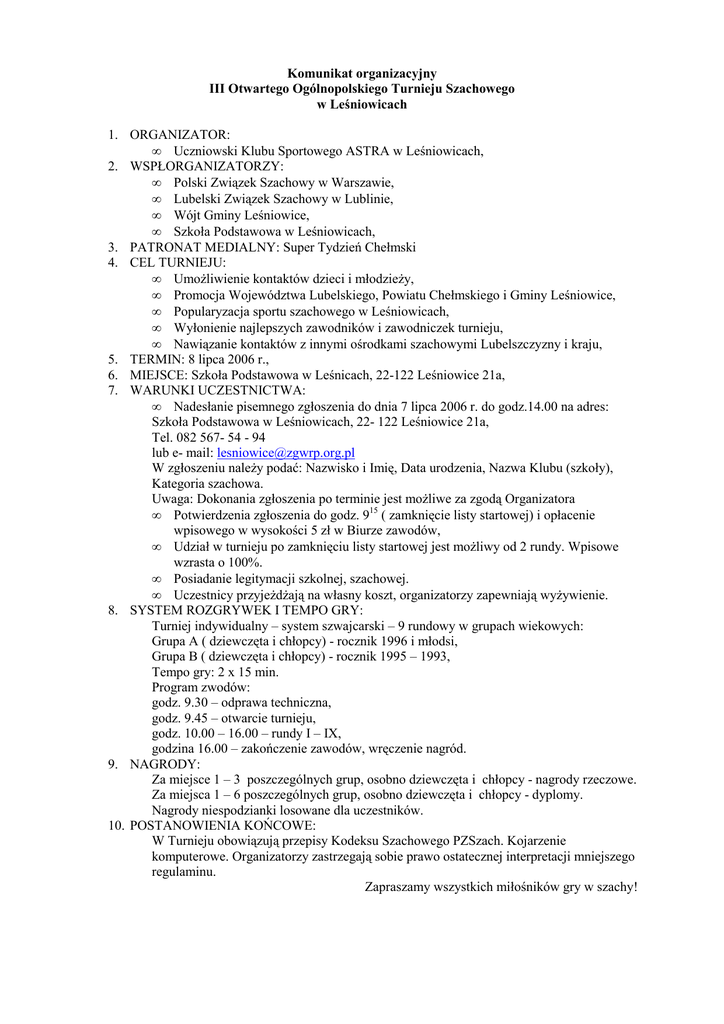 Komunikat organizacyjny III Otwartego Ogólnopolskiego Turnieju Szachowego w Leśniowicach 1. ORGANIZATOR: • Uczniowski Klubu Sportowego ASTRA w Leśniowicach, 2. WSPŁORGANIZATORZY: • Polski Związek Szachowy w Warszawie, • Lubelski Związek Szachowy w Lublinie, • Wójt Gminy Leśniowice, • Szkoła Podstawowa w Leśniowicach, 3. PATRONAT MEDIALNY: Super Tydzień Chełmski 4. CEL TURNIEJU: • UmoŜliwienie kontaktów dzieci i młodzieŜy, • Promocja Województwa Lubelskiego, Powiatu Chełmskiego i Gminy Leśniowice, • Popularyzacja sportu szachowego w Leśniowicach, • Wyłonienie najlepszych zawodników i zawodniczek turnieju, • Nawiązanie kontaktów z innymi ośrodkami szachowymi Lubelszczyzny i kraju, 5. TERMIN: 8 lipca 2006 r., 6. MIEJSCE: Szkoła Podstawowa w Leśnicach, 22-122 Leśniowice 21a, 7. WARUNKI UCZESTNICTWA: • Nadesłanie pisemnego zgłoszenia do dnia 7 lipca 2006 r. do godz.14.00 na adres: Szkoła Podstawowa w Leśniowicach, 22- 122 Leśniowice 21a, Tel. 082 567- 54 - 94 lub e- mail: [email protected] W zgłoszeniu naleŜy podać: Nazwisko i Imię, Data urodzenia, Nazwa Klubu (szkoły), Kategoria szachowa. Uwaga: Dokonania zgłoszenia po terminie jest moŜliwe za zgodą Organizatora • Potwierdzenia zgłoszenia do godz. 915 ( zamknięcie listy startowej) i opłacenie wpisowego w wysokości 5 zł w Biurze zawodów, • Udział w turnieju po zamknięciu listy startowej jest moŜliwy od 2 rundy. Wpisowe wzrasta o 100%. • Posiadanie legitymacji szkolnej, szachowej. • Uczestnicy przyjeŜdŜają na własny koszt, organizatorzy zapewniają wyŜywienie. 8. SYSTEM ROZGRYWEK I TEMPO GRY: Turniej indywidualny – system szwajcarski – 9 rundowy w grupach wiekowych: Grupa A ( dziewczęta i chłopcy) - rocznik 1996 i młodsi, Grupa B ( dziewczęta i chłopcy) - rocznik 1995 – 1993, Tempo gry: 2 x 15 min. Program zwodów: godz. 9.30 – odprawa techniczna, godz. 9.45 – otwarcie turnieju, godz. 10.00 – 16.00 – rundy I – IX, godzina 16.00 – zakończenie zawodów, wręczenie nagród. 9. NAGRODY: Za miejsce 1 – 3 poszczególnych grup, osobno dziewczęta i chłopcy - nagrody rzeczowe. Za miejsca 1 – 6 poszczególnych grup, osobno dziewczęta i chłopcy - dyplomy. Nagrody niespodzianki losowane dla uczestników. 10. POSTANOWIENIA KOŃCOWE: W Turnieju obowiązują przepisy Kodeksu Szachowego PZSzach. Kojarzenie komputerowe. Organizatorzy zastrzegają sobie prawo ostatecznej interpretacji mniejszego regulaminu. Zapraszamy wszystkich miłośników gry w szachy!