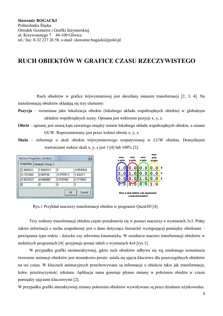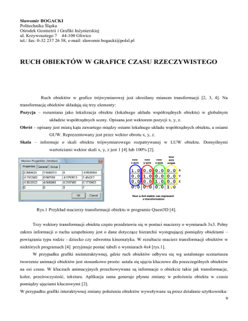 Sławomir BOGACKI Politechnika Śląska Ośrodek Geometrii i Grafiki Inżynierskiej ul. Krzywoustego 7 44-100 Gliwice tel./ fax: 0-32 237 26 58, e-mail: [email protected] RUCH OBIEKTÓW W GRAFICE CZASU RZECZYWISTEGO Ruch obiektów w grafice trójwymiarowej jest określany mianem transformacji [2, 3, 4]. Na transformację obiektów składają się trzy elementy: Pozycja – rozumiana jako lokalizacja obiektu (lokalnego układu współrzędnych obiektu) w globalnym układzie współrzędnych sceny. Opisana jest wektorem pozycji x, y, z. Obrót – opisany jest miarą kąta zawartego między osiami lokalnego układu współrzędnych obiektu, a osiami GUW. Reprezentowany jest przez wektor obrotu x, y, z. Skala – informuje o skali obiektu trójwymiarowego rozpatrywanej w LUW obiektu. Domyślnymi wartościami wektor skali x, y, z jest 1 [4] lub 100% [2]. Rys.1 Przykład macierzy transformacji obiektu w programie Quest3D [4]. Trzy wektory transformacji obiektu często przedstawia się w postaci macierzy o wymiarach 3x3. Pełny zakres informacji o ruchu uzupełniony jest o dane dotyczące hierarchii występującej pomiędzy obiektami – powiązania typu rodzic - dziecko czy odwrotna kinematyka. W rezultacie macierz transformacji obiektów w niektórych programach [4] przyjmuje postać tabeli o wymiarach 4x4 [rys.1]. W przypadku grafiki nieinteraktywnej, gdzie ruch obiektów odbywa się wg ustalonego scenariusza tworzenie animacji obiektów jest stosunkowo proste: ustala się ujęcia kluczowe dla poszczególnych obiektów na osi czasu. W kluczach animacyjnych przechowywane są informacje o obiekcie takie jak transformacje, kolor, przeźroczystość, tekstura. Aplikacja sama generuje płynne zmiany w położeniu obiektu w czasie pomiędzy ujęciami kluczowymi [2]. W przypadku grafiki interaktywnej zmiany położenia obiektów wywoływane są przez działanie użytkownika: 9 naciśnięcie klawisza na klawiaturze, kliknięcie myszą, ruch joystickiem. wystąpienie kolizji pomiędzy obiektami (np. zderzenie), spełnieniu warunków logicznych (odległość między obiektami, relacje wysokości itp). Parametry ruchu obiektów opisywane są równaniami, które przekształcają sygnał wystąpienia zdarzenia (najczęściej jest to wartość logiczna: 1 lub 0) na konkretną wartość przesunięcia, obrotu czy wartość prędkości. W celu podniesienia realności ruchu należy dodatkowo rozwiązać następujące zagadnienia: Płynność zmian prędkości ruchu (np. od prędkości zerowej do ustalonej) uwzględniającą np. bezwładność obiektu, Ustalenie wartości brzegowych – zasięgów ruchu, Definiowanie kolizyjności obiektów – ruch ograniczony występowaniem innych obiektów na drodze, Odtworzenie dźwięku podczas ruchu (skrzypienie drzwi). W prezentacji zostaną przedstawione przykłady rozwiązań powyższych zagadnień związanych z ruchem. Przykłady te opracowane zostały przy użyciu środowiska programowania obiektowego Quest3D. Omówione zostaną zasady tworzenia algorytmów sterujących ruchem obiektów oraz możliwości ich wykorzystania w interaktywnych wizualizacjach [1]. References 1. Bogacki S. Terczyńska E.: Visualization of architectural objects – new tools and new possibilities. 10th International Conference on Geometry and Engineering Graphics BALTGRAF. Vilnius, Lithuania, June 2009. 2. Bousquet M. Ross A.: Harnessing 3ds max 5. Wydawnictwo Helion, Gliwice 2004. 3. Hast A.: Understanding rotations and their applications. Proceeding of 5th International Conference, Ustroń, June 2007. Silesian University of Technology. Geometry and Engineering Graphics Centre. Internet websites: 4. 10 Act-3D www.quest3d.pl