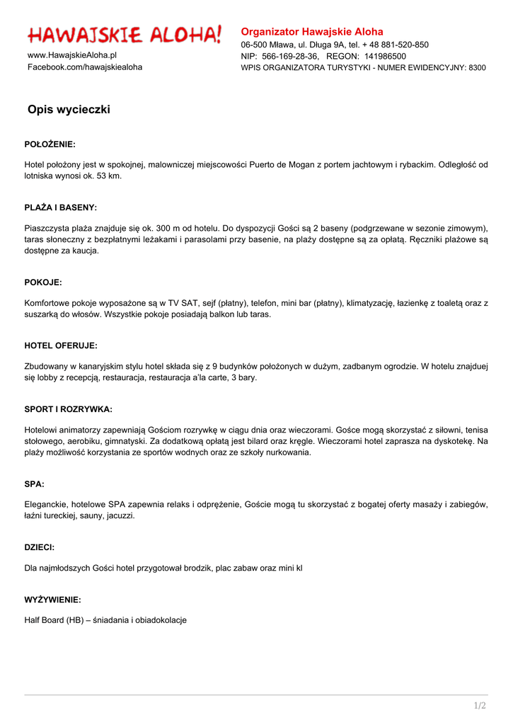 Organizator Hawajskie Aloha www.HawajskieAloha.pl Facebook.com/hawajskiealoha 06-500 Mława, ul. Długa 9A, tel. + 48 881-520-850 NIP: 566-169-28-36, REGON: 141986500 WPIS ORGANIZATORA TURYSTYKI - NUMER EWIDENCYJNY: 8300 Opis wycieczki POŁOŻENIE: Hotel położony jest w spokojnej, malowniczej miejscowości Puerto de Mogan z portem jachtowym i rybackim. Odległość od lotniska wynosi ok. 53 km. PLAŻA I BASENY: Piaszczysta plaża znajduje się ok. 300 m od hotelu. Do dyspozycji Gości są 2 baseny (podgrzewane w sezonie zimowym), taras słoneczny z bezpłatnymi leżakami i parasolami przy basenie, na plaży dostępne są za opłatą. Ręczniki plażowe są dostępne za kaucja. POKOJE: Komfortowe pokoje wyposażone są w TV SAT, sejf (płatny), telefon, mini bar (płatny), klimatyzację, łazienkę z toaletą oraz z suszarką do włosów. Wszystkie pokoje posiadają balkon lub taras. HOTEL OFERUJE: Zbudowany w kanaryjskim stylu hotel składa się z 9 budynków położonych w dużym, zadbanym ogrodzie. W hotelu znajduej się lobby z recepcją, restauracja, restauracja a’la carte, 3 bary. SPORT I ROZRYWKA: Hotelowi animatorzy zapewniają Gościom rozrywkę w ciągu dnia oraz wieczorami. Gośce mogą skorzystać z siłowni, tenisa stołowego, aerobiku, gimnatyski. Za dodatkową opłatą jest bilard oraz kręgle. Wieczorami hotel zaprasza na dyskotekę. Na plaży możliwość korzystania ze sportów wodnych oraz ze szkoły nurkowania. SPA: Eleganckie, hotelowe SPA zapewnia relaks i odprężenie, Goście mogą tu skorzystać z bogatej oferty masaży i zabiegów, łaźni tureckiej, sauny, jacuzzi. DZIECI: Dla najmłodszych Gości hotel przygotował brodzik, plac zabaw oraz mini kl WYŻYWIENIE: Half Board (HB) – śniadania i obiadokolacje 1/2 Half Board Plus (HB+) – śniadania i obiadokolacje, wybrane napoje w trakcie posiłków. Full Board (FB) – śniadania, obiady i kolacje Full board Plus (FB+) – śniadania, obiady i kolacje, wybrane napoje w trakcie posiłków. Posiłki serwowane są w formie bufetu. Napoje płatne są dodatkowo. INTERNET: Kawiarenka internetowa za opłata, bezprzewodowy internet na terenie całego hotelu bezpłatnie. Biuro Podróży Hawajskie Aloha posiada pozwolenie Organizatora Imprez Turystycznych na cały świat, numer ewidencyjny 8300, zaświadczenie 1399 dokument wydany przez Urząd Marszałkowski woj. Mazowieckiego. Posiadamy również aktualną gwarancje ubezpieczeniową spełniająca rozporządzenie Ministra Finansów z dnia 16.12.2010r. w sprawie sumy gwarancji ubezpieczeniowej wymaganej w związku z prowadzoną działalnością gospodarczą jako Organizator Usług Turystycznych. Dokumenty firmy są dostępne na stronie internetowej www.hawajskiealoha.pl zakładka firma / dokumenty. 2/2