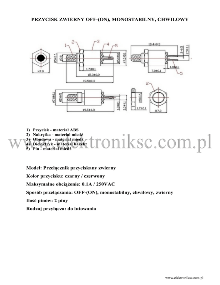 PRZYCISK ZWIERNY OFF-(ON), MONOSTABILNY, CHWILOWY 1) 2) 3) 4) 5) Przycisk - materiał ABS Nakrętka - materiał miedź Obudowa - materiał miedź Dielektryk - materiał bakelit Pin - materiał miedź Model: Przełącznik przyciskany zwierny Kolor przycisku: czarny / czerwony Maksymalne obciążenie: 0.1A / 250VAC Sposób przełączania: OFF-(ON), monostabilny, chwilowy, zwierny Ilość pinów: 2 piny Rodzaj przyłącza: do lutowania www.elektroniksc.com.pl