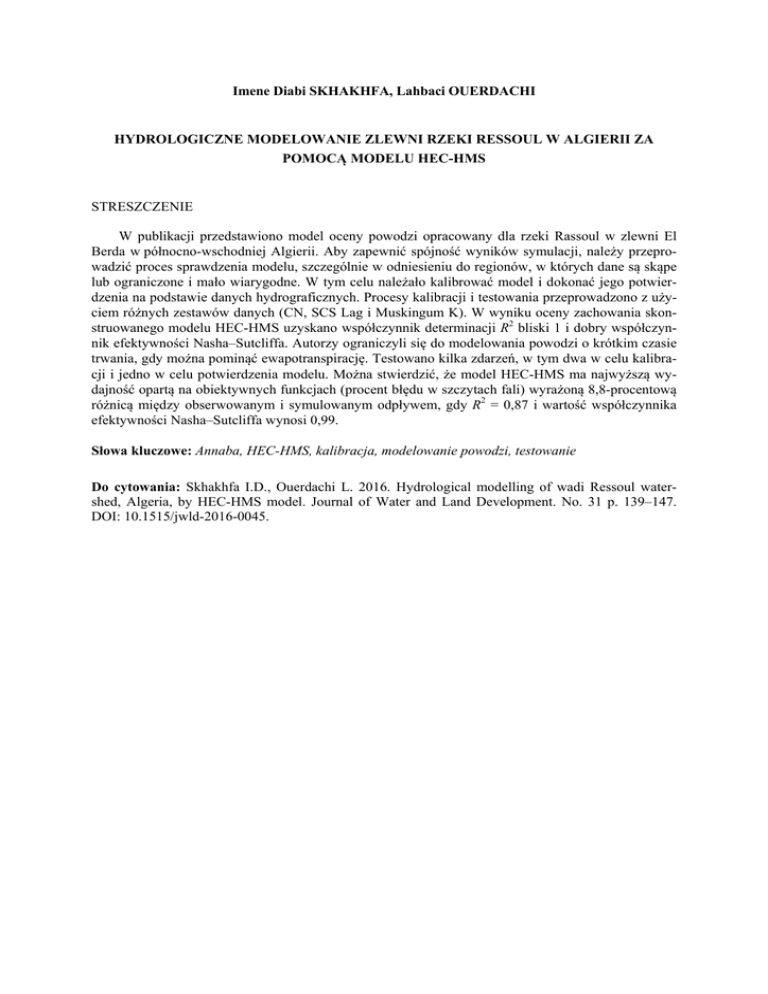 Imene Diabi SKHAKHFA, Lahbaci OUERDACHI HYDROLOGICZNE MODELOWANIE ZLEWNI RZEKI RESSOUL W ALGIERII ZA POMOCĄ MODELU HEC-HMS STRESZCZENIE W publikacji przedstawiono model oceny powodzi opracowany dla rzeki Rassoul w zlewni El Berda w północno-wschodniej Algierii. Aby zapewnić spójność wyników symulacji, należy przeprowadzić proces sprawdzenia modelu, szczególnie w odniesieniu do regionów, w których dane są skąpe lub ograniczone i mało wiarygodne. W tym celu należało kalibrować model i dokonać jego potwierdzenia na podstawie danych hydrograficznych. Procesy kalibracji i testowania przeprowadzono z użyciem różnych zestawów danych (CN, SCS Lag i Muskingum K). W wyniku oceny zachowania skonstruowanego modelu HEC-HMS uzyskano współczynnik determinacji R2 bliski 1 i dobry współczynnik efektywności Nasha–Sutcliffa. Autorzy ograniczyli się do modelowania powodzi o krótkim czasie trwania, gdy można pominąć ewapotranspirację. Testowano kilka zdarzeń, w tym dwa w celu kalibracji i jedno w celu potwierdzenia modelu. Można stwierdzić, że model HEC-HMS ma najwyższą wydajność opartą na obiektywnych funkcjach (procent błędu w szczytach fali) wyrażoną 8,8-procentową różnicą między obserwowanym i symulowanym odpływem, gdy R2 = 0,87 i wartość współczynnika efektywności Nasha–Sutcliffa wynosi 0,99. Słowa kluczowe: Annaba, HEC-HMS, kalibracja, modelowanie powodzi, testowanie Do cytowania: Skhakhfa I.D., Ouerdachi L. 2016. Hydrological modelling of wadi Ressoul watershed, Algeria, by HEC-HMS model. Journal of Water and Land Development. No. 31 p. 139–147. DOI: 10.1515/jwld-2016-0045.