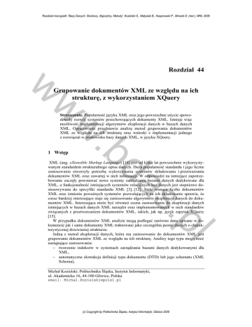 Rozdział monografii: 'Bazy Danych: Struktury, Algorytmy, Metody', Kozielski S., Małysiak B., Kasprowski P., Mrozek D. (red.), WKŁ 2006 Rozdział 44 w Grupowanie dokumentów XML ze względu na ich strukturę, z wykorzystaniem XQuery w 1 Wstęp da .b w Streszczenie. Popularność języka XML oraz jego powszechne użycie spowodowały rozwój systemów przechowujących dokumenty XML. Istnieje więc możliwość implementacji algorytmów eksploracji danych w bazach danych XML. Opracowanie przedstawia analizę metod grupowania dokumentów XML ze względu na ich strukturę oraz wnioski z implementacji jednego z rozwiązań w środowisku bazy danych XML, w języku XQuery. pl s. XML (ang. eXtensible Markup Language) [14] jest od kilku lat powszechnie wykorzystywanym standardem strukturalnego opisu danych. Duża popularność standardu i jego liczne zastosowania stworzyły potrzebę wykorzystania systemów składowania i przetwarzania dokumentów XML oraz zawartej w nich informacji. W odpowiedzi na istniejące zapotrzebowanie zaczęły powstawać nowe systemy zarządzania bazami danych dedykowane dla XML, a funkcjonalność istniejących systemów relacyjnych baz danych jest stopniowo dostosowywana do specyfiki standardu XML [3], [12]. Stale rosnąca liczba dokumentów XML oraz istnienie poważnych systemów pozwalających na ich składowanie sprawia, że coraz bardziej interesujące staje się zastosowanie algorytmów eksploracji danych do dokumentów XML. Interesująca może być również ocena zastosowania do eksploracji danych istniejących w bazach danych XML narzędzi oraz implementowanych w nich standardów związanych z przetwarzaniem dokumentów XML, takich, jak np. język zapytań XQuery [15]. W przypadku dokumentów XML analizie mogą podlegać zarówno dane opisane w dokumencie jak i same dokumenty XML traktowane jako szczególna postać danych o charakterystycznej drzewiastej strukturze. Jedną z metod eksploracji danych, która ma zastosowanie do dokumentów XML jest grupowanie dokumentów XML ze względu na ich strukturę. Analizy tego typu mogą mieć następujące zastosowania: − tworzenie indeksów w systemach zarządzania bazami danych dedykowanymi dla XML, − automatyczna ekstrakcja definicji typu dokumentu (DTD) lub jego schematu (XML Schema), Michał Kozielski: Politechnika Śląska, Instytut Informatyki, ul. Akademicka 16, 44-100 Gliwice, Polska email: [email protected] (c) Copyright by Politechnika Śląska, Instytut Informatyki, Gliwice 2006 Rozdział monografii: 'Bazy Danych: Struktury, Algorytmy, Metody', Kozielski S., Małysiak B., Kasprowski P., Mrozek D. (red.), WKŁ 2006 M. Kozielski w − podniesienie efektywności transformacji danych ze struktury dokumentu XML do struktury relacyjnej bazy danych [10], − wstępne grupowanie dokumentów XML wyszukiwanych w sieci Internet w celu ich dalszego przetworzenia, − wyszukiwanie źródeł takiej samej informacji w sieci Internet, − analiza struktur proteinowych, danych geoprzestrzennych lub innych danych o strukturze hierarchicznej opisanych, w drzewiastej strukturze dokumentu XML. W dalszej części rozdziału przedstawione są metody stosowane do grupowania dokumentów XML względem ich struktury (podrozdział 2) oraz szersze omówienie metody wybranej do implementacji z wykorzystaniem języka XQuery (podrozdział 3). Przedstawioną analizę kończą wyniki przeprowadzonych badań oraz wyciągnięte wnioski. w 2 Grupowanie dokumentów XML ze względu na ich strukturę da .b w Rezultat wykonanego grupowania dokumentów XML względem ich struktury zależy od następujących czynników: − od metody wyznaczania podobieństwa lub odległości między dokumentami, − od metody grupowania wykorzystanej do wyznaczenia grup dokumentów XML. Kolejne punkty przedstawiają metody wykorzystywane do realizacji wymienionych zagadnień. 2.1 Wyznaczanie podobieństwa struktury dokumentów XML ∑∑ δ (doc Ci dist (Ci , C j ) = Cj Ci k k =1 l =1 Ci C j pl s. Metody wyznaczania podobieństwa struktury dokumentów XML można podzielić na wykorzystujące odległość transformacji (ang. edit distance) pomiędzy dokumentami XML oraz wykorzystujące odległość wyznaczaną na podstawie kodowania dokumentów XML. Odległość między dwoma dokumentami XML, zwana odległością transformacji (ang. edit distance) [11], wyznaczana jest poprzez określenie, jaka liczba i jaki rodzaj modyfikacji jednego z dokumentów jest potrzebna do stworzenia dokumentów sobie równoważnych. Dla tej metody wartość odległości między dwiema grupami dokumentów, która może być wykorzystana w algorytmie grupowania wyznaczana jest zgodnie ze wzorem: Cj , docl ) (1) gdzie δ oznacza sumaryczny koszt wykonanych operacji dla porównywanych dokumentów, dockCi określa k-ty dokument w grupie Ci, |Ci| oznacza liczbę dokumentów w grupie Ci. Metody podobne lub rozwijające podejście zaprezentowane w [11] przedstawione są w [1], [8] Przykładem odmiennego podejścia do wyznaczania odległości między dokumentami XML są prezentowane w literaturze [4], [10], [18] metody wykorzystujące analizę wektora cech odzwierciedlającego strukturę dokumentu. Metoda zaprezentowana w [4] sprowadza grupowanie dokumentów XML względem struktury do analizy porównawczej sygnałów. Wektor cech charakteryzujący strukturę do438 (c) Copyright by Politechnika Śląska, Instytut Informatyki, Gliwice 2006 Rozdział monografii: 'Bazy Danych: Struktury, Algorytmy, Metody', Kozielski S., Małysiak B., Kasprowski P., Mrozek D. (red.), WKŁ 2006 Grupowanie dokumentów XML ze względu na ich strukturę, z wykorzystaniem XQuery w kumentu XML wyznaczany jest jako szereg czasowy zawierający wartości odpowiadające kolejno pojawiającym się w dokumencie elementom. Postać wektora cech jest wynikiem złożenia dwóch funkcji, z których jedna definiuje sposób kodowania na poziomie znaczników, druga określa sposób kodowania na poziomie dokumentu. Podejście to pozwal