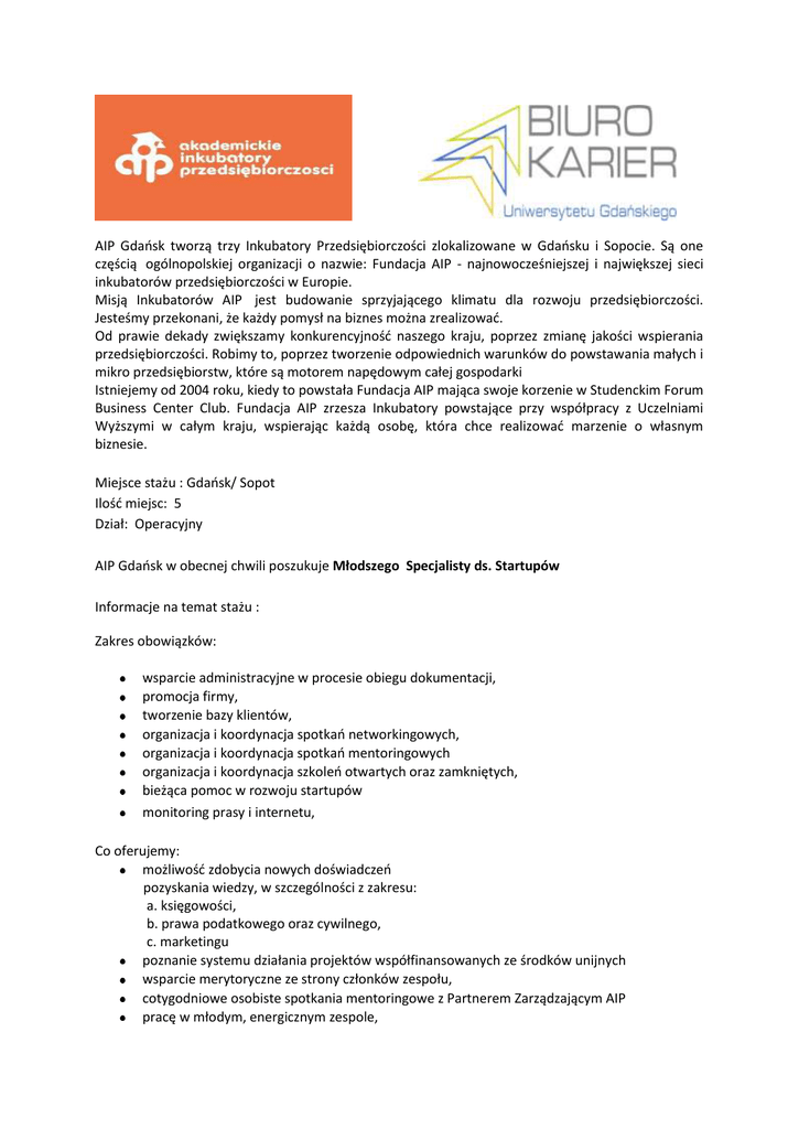 AIP Gdańsk tworzą trzy Inkubatory Przedsiębiorczości zlokalizowane w Gdańsku i Sopocie. Są one częścią ogólnopolskiej organizacji o nazwie: Fundacja AIP - najnowocześniejszej i największej sieci inkubatorów przedsiębiorczości w Europie. Misją Inkubatorów AIP jest budowanie sprzyjającego klimatu dla rozwoju przedsiębiorczości. Jesteśmy przekonani, że każdy pomysł na biznes można zrealizować. Od prawie dekady zwiększamy konkurencyjność naszego kraju, poprzez zmianę jakości wspierania przedsiębiorczości. Robimy to, poprzez tworzenie odpowiednich warunków do powstawania małych i mikro przedsiębiorstw, które są motorem napędowym całej gospodarki Istniejemy od 2004 roku, kiedy to powstała Fundacja AIP mająca swoje korzenie w Studenckim Forum Business Center Club. Fundacja AIP zrzesza Inkubatory powstające przy współpracy z Uczelniami Wyższymi w całym kraju, wspierając każdą osobę, która chce realizować marzenie o własnym biznesie. Miejsce stażu : Gdańsk/ Sopot Ilość miejsc: 5 Dział: Operacyjny AIP Gdańsk w obecnej chwili poszukuje Młodszego Specjalisty ds. Startupów Informacje na temat stażu : Zakres obowiązków: wsparcie administracyjne w procesie obiegu dokumentacji, promocja firmy, tworzenie bazy klientów, organizacja i koordynacja spotkań networkingowych, organizacja i koordynacja spotkań mentoringowych organizacja i koordynacja szkoleń otwartych oraz zamkniętych, bieżąca pomoc w rozwoju startupów monitoring prasy i internetu, Co oferujemy: możliwość zdobycia nowych doświadczeń pozyskania wiedzy, w szczególności z zakresu: a. księgowości, b. prawa podatkowego oraz cywilnego, c. marketingu poznanie systemu działania projektów współfinansowanych ze środków unijnych wsparcie merytoryczne ze strony członków zespołu, cotygodniowe osobiste spotkania mentoringowe z Partnerem Zarządzającym AIP pracę w młodym, energicznym zespole, Od kandydatów oczekujemy: zaangażowania, umiejętności pracy w zespole, komunikatywności, wysokiej kultury osobistej, zapału i dużej dawki pozytywnej energii Studenci zainteresowani wzięciem udziału w programie składają następujące dokumenty aplikacyjne: a) deklarację uczestnictwa w programie (załącznik 1, dostępny na bk.ug.edu.pl) b) CV i list motywacyjny, c) zaświadczenie o średniej ocen z całego toku studiów wystawione przez dziekanat. Aplikacje z dopiskiem: STAŻ_AIP wysyłamy na adres mailowy [email protected] lub składamy osobiście w Biurze Karier : Biuro Karier UG Sopot, Armii Krajowej 110/203 Na aplikacje czekamy do 30 września 2014 Do aplikacji uprzejmie prosimy dołączyć następującą klauzulę: „Wyrażam zgodę na przetwarzanie moich danych osobowych zawartych w mojej ofercie pracy dla potrzeb niezbędnych do realizacji procesu rekrutacji zgodnie z ustawą z dnia 29 sierpnia 1997 r. o ochronie danych osobowych (Dz. U. z 2002 r. Nr 101, poz. 926, ze zm.)”