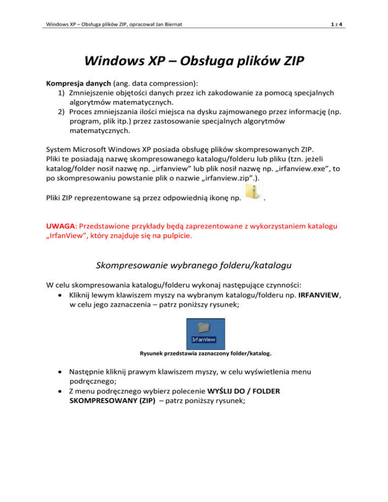 Windows XP – Obsługa plików ZIP, opracował Jan Biernat 1z4 Windows XP – Obsługa plików ZIP Kompresja danych (ang. data compression): 1) Zmniejszenie objętości danych przez ich zakodowanie za pomocą specjalnych algorytmów matematycznych. 2) Proces zmniejszania ilości miejsca na dysku zajmowanego przez informację (np. program, plik itp.) przez zastosowanie specjalnych algorytmów matematycznych. System Microsoft Windows XP posiada obsługę plików skompresowanych ZIP. Pliki te posiadają nazwę skompresowanego katalogu/folderu lub pliku (tzn. jeżeli katalog/folder nosił nazwę np. „irfanview” lub plik nosił nazwę np. „irfanview.exe”, to po skompresowaniu powstanie plik o nazwie „irfanview.zip”.). Pliki ZIP reprezentowane są przez odpowiednią ikonę np. . UWAGA: Przedstawione przykłady będą zaprezentowane z wykorzystaniem katalogu „IrfanView”, który znajduje się na pulpicie. Skompresowanie wybranego folderu/katalogu W celu skompresowania katalogu/folderu wykonaj następujące czynności: Kliknij lewym klawiszem myszy na wybranym katalogu/folderu np. IRFANVIEW, w celu jego zaznaczenia – patrz poniższy rysunek; Rysunek przedstawia zaznaczony folder/katalog. Następnie kliknij prawym klawiszem myszy, w celu wyświetlenia menu podręcznego; Z menu podręcznego wybierz polecenie WYŚLIJ DO / FOLDER SKOMPRESOWANY (ZIP) – patrz poniższy rysunek; Windows XP – Obsługa plików ZIP, opracował Jan Biernat 2z4 Rysunek przedstawia wyświetlone menu podręczne z wybranym poleceniem FOLDER SKOMPRESOWANY(ZIP). Po tych czynnościach rozpocznie się kompresowanie wybranego folderu/katalogu – patrz poniższy rysunek; Rysunek przedstawia okno informacyjne informujące o postępach w kompresji wybranego folderu/katalogu. Wybrany folder/katalog został skompresowany – patrz poniższy rysunek; Rysunek przedstawia skompresowany plik ZIP, który zawiera folder/katalog o takiej samej nazwie. - Windows XP – Obsługa plików ZIP, opracował Jan Biernat Rozpakowanie skompresowanego pliku ZIP W celu rozpakowania skompresowanego pliku ZIP wykonaj następujące czynności: Kliknij dwukrotnie lewym klawiszem myszy w skompresowany plik IRFANVIEW.ZIP (plik znajduje się np. na pulpicie), co spowoduje wyświetlenie jego zawartości – patrz poniższy rysunek; Rysunek przedstawia wnętrze skompresowanego pliku IRFANVIEW.ZIP. Kliknij lewym klawiszem myszy na nazwie katalogu/folderu IRFANVIEW, co spowoduje jego zaznaczenie – patrz poniższy rysunek; Rysunek przedstawia zaznaczony katalog/folder „IrfanView” wewnątrz skompresowanego pliku IRFANVIEW.ZIP. Przytrzymując wciśnięty lewy klawisz myszy przeciągnij katalog/folder IRFANVIEW na pulpit – patrz poniższy rysunek; 3z4 Windows XP – Obsługa plików ZIP, opracował Jan Biernat 4z4 Rysunek przedstawia początek przeciągania katalogu/folderu „IrfanView” z wnętrza skompresowanego pliku IRFANVIEW.ZIP na pulpit. Gdy kursor myszy znajdzie się nad wolnym obszarem pulpitu, to zwolnij lewy klawisz myszy, co spowoduje rozpoczęcie wypakowywania katalogu/folderu – patrz poniższy rysunek; Rysunek przedstawia okno informujące o postępach w wypakowaniu katalogu „IrfanView” z pliku IRFANVIEW.ZIP. Katalog IRFANVIEW został wypakowany – patrz poniższy rysunek; Rysunek przedstawia wypakowany katalog „IrfanView”. -