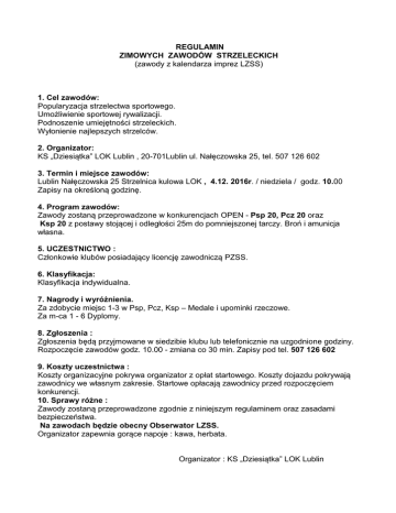 REGULAMIN ZIMOWYCH ZAWODÓW STRZELECKICH (zawody z kalendarza imprez LZSS) 1. Cel zawodów: Popularyzacja strzelectwa sportowego. Umożliwienie sportowej rywalizacji. Podnoszenie umiejętności strzeleckich. Wyłonienie najlepszych strzelców. 2. Organizator: KS „Dziesiątka” LOK Lublin , 20-701Lublin ul. Nałęczowska 25, tel. 507 126 602 3. Termin i miejsce zawodów: Lublin Nałęczowska 25 Strzelnica kulowa LOK , 4.12. 2016r. / niedziela / godz. 10.00 Zapisy na określoną godzinę. 4. Program zawodów: Zawody zostaną przeprowadzone w konkurencjach OPEN - Psp 20, Pcz 20 oraz Ksp 20 z postawy stojącej i odległości 25m do pomniejszonej tarczy. Broń i amunicja własna. 5. UCZESTNICTWO : Członkowie klubów posiadający licencję zawodniczą PZSS. 6. Klasyfikacja: Klasyfikacja indywidualna. 7. Nagrody i wyróżnienia. Za zdobycie miejsc 1-3 w Psp, Pcz, Ksp – Medale i upominki rzeczowe. Za m-ca 1 - 6 Dyplomy. 8. Zgłoszenia : Zgłoszenia będą przyjmowane w siedzibie klubu lub telefonicznie na uzgodnione godziny. Rozpoczęcie zawodów godz. 10.00 - zmiana co 30 min. Zapisy pod tel. 507 126 602 9. Koszty uczestnictwa : Koszty organizacyjne pokrywa organizator z opłat startowego. Koszty dojazdu pokrywają zawodnicy we własnym zakresie. Startowe opłacają zawodnicy przed rozpoczęciem konkurencji. 10. Sprawy różne : Zawody zostaną przeprowadzone zgodnie z niniejszym regulaminem oraz zasadami bezpieczeństwa. Na zawodach będzie obecny Obserwator LZSS. Organizator zapewnia gorące napoje : kawa, herbata. Organizator : KS „Dziesiątka” LOK Lublin