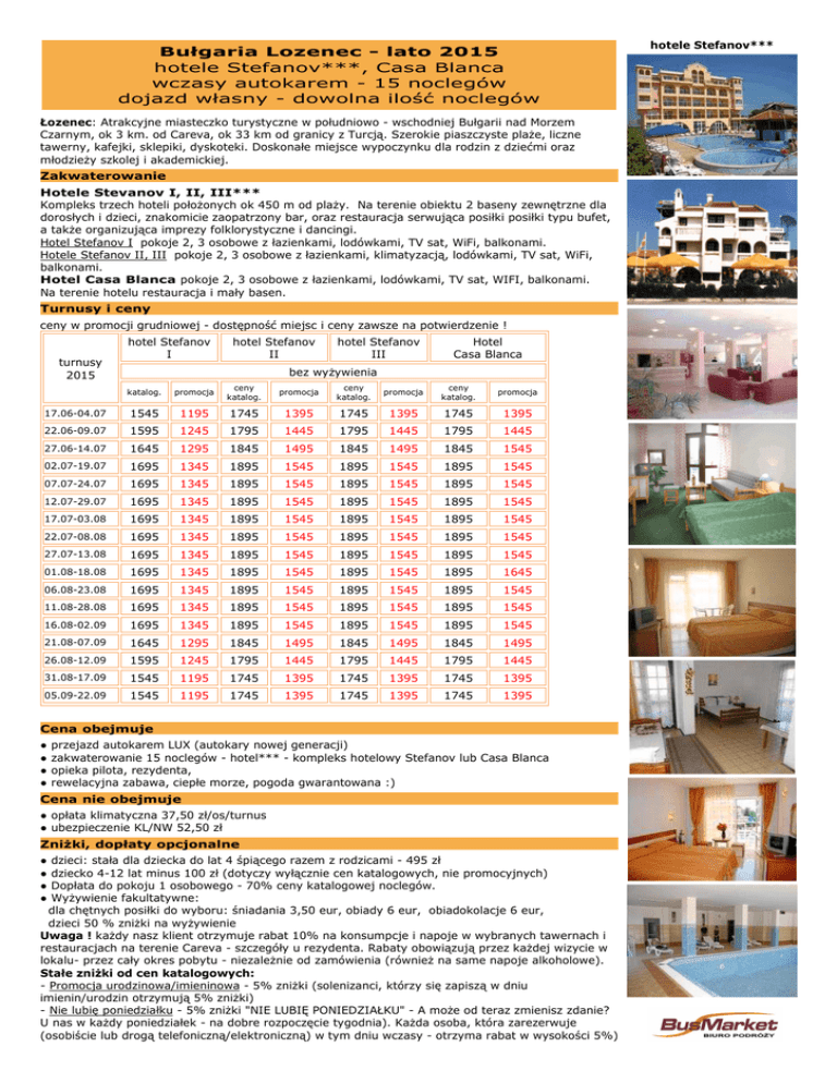 Bułgaria Lozenec - lato 2015 hotele Stefanov***, Casa Blanca wczasy autokarem - 15 noclegów dojazd własny - dowolna ilość noclegów Łozenec: Atrakcyjne miasteczko turystyczne w południowo - wschodniej Bułgarii nad Morzem Czarnym, ok 3 km. od Careva, ok 33 km od granicy z Turcją. Szerokie piaszczyste plaże, liczne tawerny, kafejki, sklepiki, dyskoteki. Doskonałe miejsce wypoczynku dla rodzin z dziećmi oraz młodzieży szkolej i akademickiej. Zakwaterowanie Hotele Stevanov I, II, III*** Kompleks trzech hoteli położonych ok 450 m od plaży. Na terenie obiektu 2 baseny zewnętrzne dla dorosłych i dzieci, znakomicie zaopatrzony bar, oraz restauracja serwująca posiłki posiłki typu bufet, a także organizująca imprezy folklorystyczne i dancingi. Hotel Stefanov I pokoje 2, 3 osobowe z łazienkami, lodówkami, TV sat, WiFi, balkonami. Hotele Stefanov II, III pokoje 2, 3 osobowe z łazienkami, klimatyzacją, lodówkami, TV sat, WiFi, balkonami. Hotel Casa Blanca pokoje 2, 3 osobowe z łazienkami, lodówkami, TV sat, WIFI, balkonami. Na terenie hotelu restauracja i mały basen. Turnusy i ceny ceny w promocji grudniowej - dostępność miejsc i ceny zawsze na potwierdzenie ! turnusy 2015 hotel Stefanov I hotel Stefanov II hotel Stefanov III Hotel Casa Blanca bez wyżywienia katalog. promocja ceny katalog. promocja ceny katalog. promocja ceny katalog. promocja 17.06-04.07 1545 1195 1745 1395 1745 1395 1745 1395 22.06-09.07 1595 1245 1795 1445 1795 1445 1795 1445 27.06-14.07 1645 1295 1845 1495 1845 1495 1845 1545 02.07-19.07 1695 1345 1895 1545 1895 1545 1895 1545 07.07-24.07 1695 1345 1895 1545 1895 1545 1895 1545 12.07-29.07 1695 1345 1895 1545 1895 1545 1895 1545 17.07-03.08 1695 1345 1895 1545 1895 1545 1895 1545 22.07-08.08 1695 1345 1895 1545 1895 1545 1895 1545 27.07-13.08 1695 1345 1895 1545 1895 1545 1895 1545 01.08-18.08 1695 1345 1895 1545 1895 1545 1895 1645 06.08-23.08 1695 1345 1895 1545 1895 1545 1895 1545 11.08-28.08 1695 1345 1895 1545 1895 1545 1895 1545 16.08-02.09 1695 1345 1895 1545 1895 1545 1895 1545 21.08-07.09 1645 1295 1845 1495 1845 1495 1845 1495 26.08-12.09 1595 1245 1795 1445 1795 1445 1795 1445 31.08-17.09 1545 1195 1745 1395 1745 1395 1745 1395 05.09-22.09 1545 1195 1745 1395 1745 1395 1745 1395 aa Cena obejmuje ● ● ● ● przejazd autokarem LUX (autokary nowej generacji) zakwaterowanie 15 noclegów - hotel*** - kompleks hotelowy Stefanov lub Casa Blanca opieka pilota, rezydenta, rewelacyjna zabawa, ciepłe morze, pogoda gwarantowana :) Cena nie obejmuje ● opłata klimatyczna 37,50 zł/os/turnus ● ubezpieczenie KL/NW 52,50 zł Zniżki, dopłaty opcjonalne ● ● ● ● dzieci: stała dla dziecka do lat 4 śpiącego razem z rodzicami - 495 zł dziecko 4-12 lat minus 100 zł (dotyczy wyłącznie cen katalogowych, nie promocyjnych) Dopłata do pokoju 1 osobowego - 70% ceny katalogowej noclegów. Wyżywienie fakultatywne: dla chętnych posiłki do wyboru: śniadania 3,50 eur, obiady 6 eur, obiadokolacje 6 eur, dzieci 50 % zniżki na wyżywienie Uwaga ! każdy nasz klient otrzymuje rabat 10% na konsumpcje i napoje w wybranych tawernach i restauracjach na terenie Careva - szczegóły u rezydenta. Rabaty obowiązują przez każdej wizycie w lokalu- przez cały okres pobytu - niezależnie od zamówienia (również na same napoje alkoholowe). Stałe zniżki od cen katalogowych: - Promocja urodzinowa/imieninowa - 5% zniżki (solenizanci, którzy się zapiszą w dniu imienin/urodzin otrzymują 5% zniżki) - Nie lubię poniedziałku - 5% zniżki "NIE LUBIĘ PONIEDZIAŁKU" - A może od teraz zmienisz zdanie? U nas w każdy poniedziałek - na dobre rozpoczęcie tygodnia). Każda osoba, która zarezerwuje (osobiście lub drogą telefoniczną/elektroniczną) w tym dniu wczasy - otrzyma rabat w wysokości 5%) hotele Stefanov*** - Stali klienci - 5% zniżki - wyjedź z nami choć na jedną wycieczkę/wczasy - a otrzymasz 5% zniżkę na kolejne imprezy - Rodzinna - 5% zniżki (przy założeniu - że jadą 2 osoby dorosłe i co najmniej 1 dziecko (nie musi to być pokrewieństwo 1 stopnia) - Emeryci i renciści - 5% zniżki - Studenci/nauczyciele - 5% zniżki (bez ograniczeń wiekowych) Zasady łączenia promocji. SUMARYCZNA WARTOŚĆ PROMOCJI - do 10% (w przypadku promocji dla stałych klientów - sumaryczna wartość promocji do 15%) wybieramy promocji wg własnego uznania. Pormocje obliczamy wg. aktualnej ceny w tabeli CEN KATALOGOWYCH. Powyższe promocje zwykłe nie mogą być łączone z super promocjami. Informacje dodatkowe Wycieczki fakultatywne Warna ok 25 eur, Nesebar - Słoneczny Brzeg - Sozopol ok 18 eur, Istambuł (wiza turecka) ok 63 eur, plaże pd Bułgarii: Achtopol - Sinemorec - Rezowo 5 eur pływanie jachtem (6 godzin plus obiad) ok 21 eur, wieczór integracyjny ok 8 eur, wieczór bułgarski ok 10 eur ** Wszystkie ceny/dopłaty dotyczą 1 osoby. Ceny wycieczek ustala lokalny operator bułgarski. Harmonogram zaliczek: ◦ Zaliczka tylko 100 zł/os płatna do dnia 12.12.2014 ◦ Druga wpłata do 15 maja 2015 - 100 zł/os ◦ Dopłata do całości na 21 dni przed wyjazdem. UWAGA!!!! Istnieje możliwość zmiany wykupionego turnusu (zmiana możliwa do wyczerpania miejsc na dany turnus) - korekta ceny na inny turnus wg tabeli z dnia rezerwacji. Bez dodatkowych opłat za zmianę. Informacje transportowe: Miasta wyjazdowe bez dopłat: Kraków, Jaworzno, Katowice, Pszczyna, Bielsko - Biała Informujemy, że godziny odjazdu autobusów na poszczególne kierunki, są dopasowane do rozkładów PKP z większych miast Polski. Miejsca odjazdów autobusów z terenu Katowice - Kraków, znajdują się w bezpośredniej (lub b. bliskiej) odległości od dworców PKP. Przejazdy antenowe (minimum 10 osób z danego miasta. W przypadku mniejszej grup - uzgodnij z biurem warunki. UWAGA! W przypadku mniejszych grup transfer z/do miejsca wskazanego przez grupę na terenie danego miasta). antenki i dopłaty: Warszawa - Katowice - Warszawa - 120 zł (ul. E. Plater - Sal