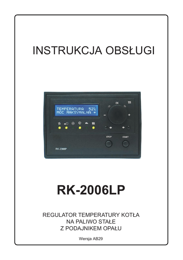 INSTRUKCJA OBSŁUGI RK-2006LP REGULATOR TEMPERATURY KOTŁA NA PALIWO STAŁE Z PODAJNIKEM OPAŁU Wersja AB29 1. Przeznaczenie. Regulator RK-2006LP przeznaczony jest do regulacji temperatury kotłów wodnych opalanych paliwem stałym, wyposażonych w: - podajnik zasypowy lub podajnik dozujący współpracujący z wbudowanym podajnikiem wewnętrznym (stokerem), - wentylator nadmuchowy, - świecę żarową zapalającą opał, - pompę CO, - pompę CWU lub pompę mieszającą (opcja), - sygnalizator alarmów (opcja), - termostat pokojowy (opcja). 2. Podłączenie. Przed włączeniem zasilania regulatora należy podłączyć odpowiednio do gniazd z tyłu regulatora: przewody zasilające: regulatora, wentylatora nadmuchu, pomp CO i CWU oraz podajnika opału. Czujniki temperatury należy umieścić w odpowiednio przygotowanych miejscach pomiarowych, które powinny być suche. Schematy podłączenia regulatora przedstawia rysunek 2. Do podłączenia stokera i sygnalizatora alarmów należy zastosować moduł dodatkowy UM-1. UWAGA! Przed podłączeniem regulatora należy sprawdzić poprawność uziemienia w instalacji sieciowej oraz dokręcić śruby zaciskowe złącza wyjściowego. UWAGA! Do wyjść wentylatora i pomp można podłączyć urządzenia o łącznej mocy do 900W. Wyjścia niewykorzystane mogą pozostać niepodłączone. UWAGA!!! Wyjścia sterujące podajnikiem i zapalarką nie są zabezpieczone i WYMAGAJĄ zastosowania odpowiednich bezpieczników. UWAGA! Regulator został wyposażony w odpowiednio zabezpieczone półprzewodnikowe czujniki temperatury, pomimo tego miejsca pomiarowe, w których są umieszczone czujniki powinny być suche. 3 3. Obsługa. Po włączeniu zasilania regulator wyświetla nazwę urządzenia i wersję oprogramowania oraz zapala wszystkie lampki sygnalizacyjne w celu ich sprawdzenia. Następnie przechodzi do stanu w jakim znajdował się przed wyłączeniem lub przed zanikiem zasilania. Regulator na płycie czołowej (rysunek 1) posiada: 1 - wyświetlacz, 2 - kontrolkę załączenia wentylatora, 3 - kontrolkę załączenia podajnika opału, 4 - kontrolkę załączenia świecy żarowej - zapalarki, 5 - kontrolkę załączenia pompy obiegu CO, 6 - kontrolkę załączenia pompy ładującej CWU lub pompy mieszającej, 7 - kontrolkę zadziałania termostatu pokojowego oraz wskaźnika ustawiania temperatury zadanej kotła. 8 - przycisk wyboru poprzedniego parametru, 9 - przycisk STOP, kasowania alarmów oraz anulowania wprowadzonych zmian, 10- przycisk START, 11- przycisk wyboru następnego parametru, 12- gałkę termostatu kotła i ustawiania parametrów zawierającą przycisk OK zatwierdzający zmiany. Rysunek 1. Płyta czołowa regulatora RK-2006LP. 4 3.1. Okno główne, tryb regulacji i stan urządzeń wyjściowych. Po włączeniu zasilania regulator wyświetla okno główne. W górnej linii wyświetlacza (1) pokazana jest temperatura wody w kotle, w dolnej tryb pracy. Symbol „*” wyświetlany w prawym dolnym rogu informuje o wykryciu płomienia w palniku. Lampki poniżej wyświetlacza przyporządkowane są do odpowiednich wyjść, a ciągłym świeceniem wskazują stan ich załączenia. T EMPRA TURA STOP 6 7 c * Podstawowa obsługa urządzenia polega na ustawieniu temperatury zadanej kotła. W tym celu należy obracając gałką termostatu kotła (12) ustawić właściwą wartość i zatwierdzić ją za pomocą przycisku OK (naciśnięcie gałki). T EMPRA TURA Z A D A A K O T Ł A→ 5 8 c UWAGA! Jeżeli instalacja grzewcza posiada zasobnik CWU, to temperatura wody w kotle utrzymywana przez regulator w czasie podgrzewania zasobnika może być wyższa niż temperatura zadana gałką termostatu. 3.2. Tryby pracy urządzenia. Tabela 1. Wykaz trybów pracy. Tryb pracy. STOP CZUWANIE ROZPALANIE MOC MAKSYMALNA MOC MODULOWANA MOC MINIMALNA PRZEDMUCHY WYGASZANIE NAPEŁNIANIE GASZENIE ALARMY Opis Sterowanie kotłem zatrzymane. Regulator steruje pracą pomp CO i CWU, ale nie podejmuje automatycznego rozpalania. Regulator steruje pracą pomp CO i CWU. W przypadku zapotrzebowania na ciepło podejmuje próbę automatycznego rozpalenia kotła. Regulator znajduje się w trakcie automatycznego rozpalania kotła. Sterowanie wentylatorem i podajnikiem w sposób umożliwiający osiągnięcie mocy maksymalnej kotła. Regulator zmniejsza ilość podawanego paliwa w miarę zbliżania się temperatury wody w kotle do wartości zadanej. Sterowanie wentylatorem i podajnikiem paliwa w sposób umożliwiający podtrzymanie palenia. Regulator wykonuje przedmuch w celu usunięcia nagromadzonych gazów. Brak zapotrzebowania na ciepło. Regulator wygasza palenisko w kotle. Ręcznie napełnianie podajnika paliwa. Sterowanie kotłem zatrzymane. Regulator steruje pracą pomp CO i CWU, ale nie podejmuje automatycznego rozpalania. Nastąpił zapłon podajnika paliwa. Regulator opróżnia stoker. Alarmy bezpieczeństwa i uszkodzeń czujników temperatury. Tryb STOP. W trybie tym regulator steruje wyłącznie pompami CO i CWU oraz chroni kocioł przed przegrzaniem i zapłonem podajnika. Zwarcie styków termostatu pokojowego i spadek temperatury CWU nie powodują żadnego działania. Naciśnięcie przycisku START (10) powoduje przełączenie regulatora w tryb CZUWANIE. 5 Tryb CZUWANIE. W trybie tym regulator nie podejmuje żadnych dodatkowych działań, do momentu zwarcia styków termostatu pokojowego lub spadku temperatury wody użytkowej. Zwarcie styków termostatu oznacza, że kocioł będzie dążył do osiągnięcia i utrzymania temperatury zadanej gałką termostatu. W przypadku konieczności podgrzewania zasobnika CWU, temperatura zadana kotła jest wyższa od temperatury zadanej CWU o wartość zaprogramowaną w parametrze „Podwyższenie temperatury kotła podczas grzania CWU”. W przypadku jednoczesnego zadziałania termostatu pokojowego i podgrzewania zasobnika CWU regulator będzie dążył do utrzymania na kotle wyższej z tych temperatur. Naciśnięcie przycisku STOP (9) powoduje prz