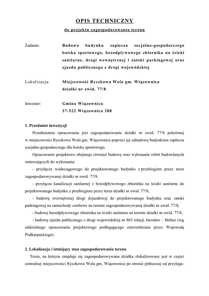 OPIS TECHNICZNY do projektu zagospodarowania terenu Zadanie: Budowa budynku zaplecza socjalno-gospodarczego boiska sportowego, bezodpływowego zbiornika na ścieki sanitarne, drogi wewnętrznej i zatoki parkingowej oraz zjazdu publicznego z drogi wojewódzkiej Lokalizacja: Miejscowość Ryszkowa Wola gm. Wiązownica działki nr ewid. 77/8 Inwestor: Gmina Wiązownica 37-522 Wiązownica 208 1. Przedmiot inwestycji Przedmiotem opracowania jest zagospodarowanie działki nr ewid. 77/8 położonej w miejscowości Ryszkowa Wola gm. Wiązownica poprzez jej zabudowę budynkiem zaplecza socjalno-gospodarczego dla boiska sportowego. Opracowanie projektowe obejmuje również budowę oraz wykonanie robót budowlanych zmierzających do wykonania: - przyłącza wodociągowego do projektowanego budynku z przebiegiem przez teren zagospodarowywanej działki nr ewid. 77/8, - przyłącza kanalizacji sanitarnej z bezodpływowego zbiornika na ścieki sanitarne do projektowanego budynku z przebiegiem przez teren działki nr ewid. 77/8, - budowę wewnętrznej drogi dojazdowej do projektowanego budynku oraz zatoki parkingowej na samochody osobowe na terenie zagospodarowywanej działki nr ewid. 77/8, - budowę bezodpływowego zbiornika na ścieki sanitarne na terenie działki nr ewid. 77/8, - budowę zjazdu publicznego z drogi wojewódzkiej nr 865 relacji Jarosław – Bełżec (wg oddzielnego opracowania projektowego podlegającego zatwierdzeniu przez Wojewodę Podkarpackiego). 2. Lokalizacja i istniejący stan zagospodarowania terenu Teren, na którym znajduje się zagospodarowywana działka zlokalizowany jest w części centralnej miejscowości Ryszkowa Wola gm. Wiązownica po stronie północnej od przylega- jącej do zagospodarowywanej działki drogi kategorii wojewódzkiej nr 865 relacji Jarosław – Bełżec oznaczonej jako działka nr ewid. 925/1. Zagospodarowywany teren - działka nr ewid. 77/8 w chwili obecnej użytkowany jest jako tereny rekreacyjno-sportowe. W części zachodniej działki zlokalizowana jest płyta boiska sportowego do gier zespołowych o nawierzchni trawiastej. Po stronie południowo-wschodniej działki urządzony jest plac zabaw dla dzieci który jest ogrodzony ogrodzeniem trwały z siatki podwieszonej do słupków stalowych. Po stronie południowej zlokalizowany jest tymczasowy budynek gospodarczy. Ponadto przez teren zagospodarowywanej działki przebiega sieć uzbrojenia podziemnego w postaci: sieci kanalizacji sanitarnej tłocznej φ 125 zlokalizowanej po stronie południowej − działki, sieci wodociągowej φ 125 zlokalizowanej po stronie południowej i południowo- − wschodniej działki, − sieci energetycznej i telekomunikacyjnej przebiegającej przez południową stronę działki. Ukształtowanie terenu działki z niewielkim spadkiem w kierunku północnym. 3. Projektowane zagospodarowanie terenu 3.1. Projektowany budynek zaplecza socjalno-gospodarczego boiska sportowego. Projektuje się budowę budynku spełniającego funkcję zaplecza socjalno- gospodarczego boiska sportowego, który zlokalizowany zostanie na terenie działki nr ewid. 77/8. Projektowany budynek zlokalizowany zostanie w odległości: - 55,33 m od granicy działki nr ewid. 77/8 z działką sąsiednią nr ewid. 925/1 stanowiącą drogę wojewódzką a zlokalizowaną po stronie południowej zagospodarowywanego terenu., - 24,10 m od granicy działki nr 77/8 po stronie wschodniej z działką sąsiednią nr ewid. 79/2, -9,80 m od ogrodzenia placu zabaw dla dzieci po stronie północnej. Wymiary zewnętrzne projektowanego budynku stanowiącego zaplecze boiska sportowego: - szerokość 8,15 m (tj. 5,75 + 2,40 m), - długość 13,95 m. Projektowany poziom zerowy budynku: +/-0,00 = 190,40 m n.p.m. Projektowany budynek zaplecza socjalno-gospodarczego boiska sportowego posiada niezależne wejścia na poziom zerowy budynku od strony frontowej - południowej tj. od drogi wojewódzkiej do poszczególnych pomieszczeń szatni, oraz pomieszczenia przeznaczonego dla sędziów, niezależne wejście na poziom zerowy budynku do części gospodarczej od strony wschodniej, niezależne wejście na poziom zerowy budynku od strony północnej do części ogólnodostępnych sanitariatów, oraz jedno niezależne wejście na poziom zerowy budynku od strony zachodniej do pomieszczenia gospodarczego przeznaczonego na kotłownię. Wokół budynku projektuje się wykonanie odbojówki w postaci chodnika o szerokości 2,0 m o nawierzchni utwardzonej z kostki betonowej gr. 6 cm na podsypce cementowopiaskowej. 3.2. Bezodpływowy zbiornik na ścieki sanitarne. W celu zapewnienia odbioru ścieków bytowo-sanitarnych z projektowanego budynku zaplecza boiska sportowego, zgodnie z warunkami technicznymi przyłączenia budynku zaplecza boiska sportowego do sieci wodnokanalizacyjnej określonymi pismem znak. ZGK 7033/51/2011 z dnia 10.05.2011 r. projektuje się budowę bezodpływowego zbiornika na ścieki sanitarne. Projektowany zbiornik na ścieki ma pojemność 10 m3 o rzucie prostokątnym o wymiarach 3,40x3,40 m. Zbiornik będzie całkowicie zagłębiony w gruncie. Wejście do zbiornika umożliwia otwór włazowy φ 600 zamykany żeliwna pokrywą. Zbiornik usytuowano w odległości: − 10,0 m od północnej ściany projektowanego budynku zaplecza boiska sportowego, − 25,60 m od wschodniej granicy działki nr ewid. 77/8 z działką sąsiednią nr ewid. 79/2 − 67,73 m od granicy południowej działki nr ewid. 77/8 z działką sąsiednią nr ewid. 925/1 stanowiącą drogę wojewódzką. 3.3. Przyłącz kanalizacji sanitarnej projektowanego budynku W celu zapewnienia odbioru ścieków bytowo-sanitarnych z projektowanego budynku zaplecza boiska sportowego projektuje się wykonanie przyłącza kanalizacji sanitarnej do bezodpływowego zbiornika na ścieki sanitarne zgodnie z warunkami technicznymi przyłączenia budynku zaplecza boiska sportowego do sieci wodnokanalizacyjnej pismem znak. ZGK 7033/51/2011 z dnia 10.05.2011 r. Projektowany przył