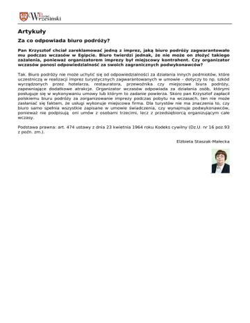 Artykuły Za co odpowiada biuro podróży? Pan Krzysztof chciał zareklamować jedną z imprez, jaką biuro podróży zagwarantowało mu podczas wczasów w Egipcie. Biuro twierdzi jednak, że nie może on złożyć takiego zażalenia, ponieważ organizatorem imprezy był miejscowy kontrahent. Czy organizator wczasów ponosi odpowiedzialność za swoich zagranicznych podwykonawców? Tak. Biuro podróży nie może uchylić się od odpowiedzialności za działania innych podmiotów, które uczestniczą w realizacji imprez turystycznych zagwarantowanych w umowie – dotyczy to np. szkód wyrządzonych przez hotelarza, restauratora, przewoźnika czy miejscowe biura podróży, zapewniające dodatkowe atrakcje. Organizator wczasów odpowiada za działania osób, którymi posługuje się w wykonywaniu umowy lub którym to zadanie powierza. Skoro pan Krzysztof zapłacił polskiemu biuru podróży za zorganizowanie imprezy podczas pobytu na wczasach, ten nie może zasłaniać się faktem, że usługi wykonuje miejscowa firma. Dla turystów nie ma znaczenia to, czy biuro samo spełnia wszystkie zapisane w umowie świadczenia, czy wynajmuje podwykonawców, ponieważ nie podpisują oni umów z osobami trzecimi, lecz z przedsiębiorcą organizującym całe wczasy. Podstawa prawna: art. 474 ustawy z dnia 23 kwietnia 1964 roku Kodeks cywilny (Dz.U. nr 16 poz.93 z poźn. zm.). Elżbieta Staszak-Małecka