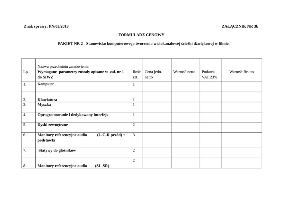 Znak sprawy: PN/03/2013 ZAŁĄCZNIK NR 3b FORMULARZ CENOWY PAKIET NR 2 - Stanowisko komputerowego tworzenia wielokanałowej ścieżki dźwiękowej w filmie. Lp. Nazwa przedmiotu zamówienia Wymagane parametry zostały opisane w zał. nr 1 do SIWZ Ilość szt. 1. Komputer 1 2. 3. Klawiatura Myszka 1 1 4. Oprogramowanie i dedykowany interfejs 1 5. Dyski zewnętrzne 2 6. Monitory referencyjne audio podstawki 7. Statywy do głośników (L-C-R przód) + 3 2 2 8. Monitory referencyjne audio (SL-SR) Cena jedn. netto Wartość netto Podatek VAT 23% Wartość Brutto 1 9. Subwoofer 2 10. 11. Monitory komputerowe kable i adaptery 1 12. Jednopunktowy regulator głośności 1 13. Oprogramowanie dodatkowe 1 14. Oprogramowanie dodatkowe 15. instalacja, kalibracja odsłuchu, szkolenie WARTOŚĆ OGÓŁEM: ………………………..dnia………………………. ……………………………………………………………………….. (Podpis upoważnionego przedstawiciela Wykonawcy)