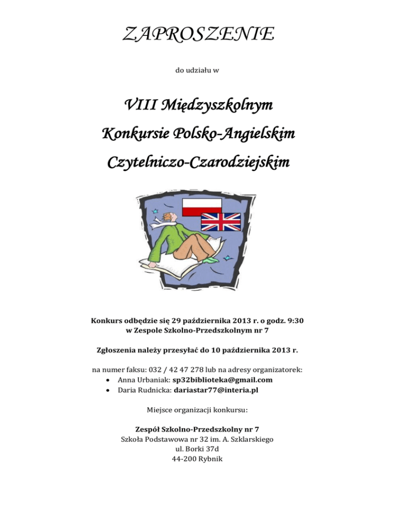 ZAPROSZENIE do udziału w VIII Międzyszkolnym Konkursie Polsko-Angielskim Czytelniczo-Czarodziejskim Konkurs odbędzie się 29 października 2013 r. o godz. 9:30 w Zespole Szkolno-Przedszkolnym nr 7 Zgłoszenia należy przesyłać do 10 października 2013 r. na numer faksu: 032 / 42 47 278 lub na adresy organizatorek:  Anna Urbaniak: [email protected]  Daria Rudnicka: [email protected] Miejsce organizacji konkursu: Zespół Szkolno-Przedszkolny nr 7 Szkoła Podstawowa nr 32 im. A. Szklarskiego ul. Borki 37d 44-200 Rybnik ZAŁOŻENIA REGULAMINOWE VIII Międzyszkolnego Konkursu Polsko-Angielskiego Czytelniczo-Czarodziejskiego 1. Celem konkursu jest: a) motywowanie uczniów do nauki języka angielskiego b) doskonalenie umiejętności wyszukiwania informacji c) popularyzacja czytelnictwa w ramach Międzynarodowego Miesiąca Bibliotek Szkolnych d) promowanie dzieci uzdolnionych e) edukacja kulturalna i europejska f) wpajanie zasad współdziałania w grupie, kształcenie postaw pożądanych społecznie 2. W konkursie mogą wziąć udział uczniowie klas 4, 5 i 6 szkół podstawowych z Rybnika i powiatu rybnickiego. W zmaganiach biorą udział 3-osobowe drużyny, po jednej z każdej zgłoszonej szkoły. 3. Warunki uczestnictwa w konkursie: a) znajomość życiorysów i tytułów innych książek pisarzy: Joanne K. Rowling, J.R.R. Tolkiena, Clive’a Staplesa Lewisa b) znajomość języka angielskiego na poziomie szkoły podstawowej oraz słownictwa dotyczącego podanej literatury c) ocenie podlegają stroje drużyn (związane z treścią podanych książek) d) znajomość treści książek:  „Harry Potter i więzień Azkabanu”, J.K. Rowling  „Hobbit”, J.R.R. Tolkien  „Książę Kaspian”, C.S. Lewis  „Srebrne krzesło”, C.S. Lewis  „Podróż Wędrowca do Świtu”, C.S. Lewis 4. Zgłoszenia (karty zgłoszenia – załącznik 1 do regulaminu) należy nadsyłać do 10 października 2013 r. Można to uczynić w następujący sposób: a) osobiście lub drogą listowną (decyduje data stempla) na adres: Zespół Szkolno-Przedszkolny nr 7 ul. Borki 37d 44-200 Rybnik b) faksem na numer: 0 32 / 42 47 278 c) na adresy e-mail: [email protected] (Anna Urbaniak), [email protected] (Daria Rudnicka) 5. Na laureatów konkursu czekają atrakcyjne nagrody. 6. Wszystkie aktualne informacje, a w przyszłości także zdjęcia uczestników i podziękowania wszystkim, którzy wesprą naszą inicjatywę, zostaną zamieszczone na stronie: sp32.rybnik.pl oraz biblioteka.sp32.rybnik.pl. 7. Udział w konkursie jest równoznaczny ze zgodą na bezpłatną publikację na stronie internetowej organizatora oraz w prasie wizerunków uczestników oraz nazwisk zwycięzców. Załącznik nr 1 do regulaminu VIII Międzyszkolnego Konkursu Polsko-Angielskiego Czytelniczo-Czarodziejskiego KARTA ZGŁOSZENIA DO UDZIAŁU W KONKURSIE Nazwa szkoły: …………………………………………………………………………………………………………………………………. Adres szkoły: …………………………………………………………………………………………………………………………………… Opiekun: …………………………………………………………………………………………………………………………………………. Kontakt do opiekuna: Telefon: …………………………………………………………………….. Adres e-mail: …………………………………………………………….. L.p. 1 2 3 Imię i nazwisko ucznia Klasa