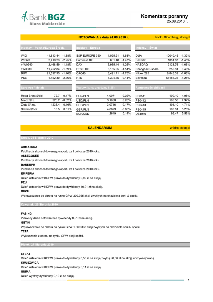 Komentarz poranny 25.08.2010 r. NOTOWANIA z dnia 24.08.2010 r. Indeksy – Polska/Europa Środk. WIG 41,813.44 -1.88% Indeksy – Europa S&P EUROPE 350 źródło: Bloomberg, stooq.pl Indeksy – Świat 1,025.91 -1.63% 631.48 -1.47% DJIA 10040.45 -1.32% WIG20 2,410.23 -2.25% Euronext 100 mWIG40 2,468.59 -1.18% DAX 5,935.44 -1.26% sWIG80 11,752.84 -1.59% FTSE 100 5,155.95 -1.51% Shanghai B-share BUX 21,597.95 -1.46% CAC40 3,491.11 -1.75% Nikkei 225 8,845.39 -1.66% PSE 1,152.30 -2.36% RTS 1,394.85 -0.14% Bovespa 65156.36 -1.25% Surowce / Metale Waluty (kursy z godziny 8.25) Ropa Brent $/bbl. Miedź $/lb. Złoto $/t oz. 72.7 S&P500 1051.87 -1.45% NASDAQ 2123.76 -1.66% 255.81 0.40% Rentowność obligacji 0.47% EUR/PLN 4.0071 0.02% PS0511 100.10 4.08% 325.2 -0.32% USD/PLN 3.1680 0.20% PS0412 100.50 4.37% CHF/PLN 3.0716 0.17% PS0413 101.10 4.71% GBP/PLN 4.8829 -0.08% PS0415 100.81 5.20% EUR/USD 1.2649 0.14% DS1019 96.47 5.56% 1235.4 0.16% 18.5 0.61% Srebro $/t oz. KALENDARIUM źródło: stooq.pl Środa, 25 Sierpnia 2010 ARMATURA Publikacja skonsolidowanego raportu za I półrocze 2010 roku. ASSECOSEE Publikacja skonsolidowanego raportu za I półrocze 2010 roku. BANKBPH Publikacja skonsolidowanego raportu za I półrocze 2010 roku. EMPERIA Dzień ustalenia w KDPW prawa do dywidendy 0,92 zł na akcję. PZU Dzień ustalenia w KDPW prawa do dywidendy 10,91 zł na akcję. RUCH Wprowadzenie do obrotu na rynku GPW 209.025 akcji zwykłych na okaziciela serii G spółki. Czwartek, 26 Sierpnia 2010 FASING Pierwszy dzień notowań bez dywidendy 0,51 zł na akcję. GETIN Wprowadzenie do obrotu na rynku GPW 1.369.338 akcji zwykłych na okaziciela serii N spółki. TETA Wykluczenie z obrotu na rynku GPW akcji spółki. Piątek, 27 Sierpnia 2010 EFEKT Dzień ustalenia w KDPW prawa do dywidendy 0,55 zł na akcję zwykłą i 0,66 zł na akcję uprzywilejowaną. KRUSZWICA Dzień ustalenia w KDPW prawa do dywidendy 3,11 zł na akcję. UNIMA Dzień wypłaty dywidendy 0,19 zł na akcję. 1 NEUCA Publikacja raportu rocznego za 2008 rok oraz skonsolidowanego raportu rocznego za 2008 rok. Komentarz poranny, 22.04.2009 Komentarz poranny, 25.08.2010 r. ANALIZA TECHNICZNA Marcin Lachowski WIG20 WIG20 Do poniedziałku WIG20 wyglądał dobrze, ale we wtorek wszystko się rozsypało. Indeks wyraźnie wybił się z formacji RGR generując negatywny sygnał zapowiadający spadek do około 2325. NajbliŜszym wsparciem jest stara linia znajdująca się obecnie na poziomie 2400. Oporem jest wtorkowe otwarcie na poziomie 2450. G 2550 2550 WYKRES DZIENNY SKALA LOGARYTMICZNA R R 2500 2500 2450 OPÓR 2450 2400 2400 2350 2350 POZIOM DOCELOWY 2300 2300 2250 2250 30000 30000 Obroty 25000 25000 20000 20000 15000 15000 10000 10000 5000 5000 x100 x100 31 7 14 21 28 June 5 12 19 26 2 August July 9 16 23 mWIG40 MWIG40 2550 MWIG40 zamknął się poniŜej wsparcia wyznaczonego przez ostatni dołek (2469). Wprawdzie skala przełamania jest niewielka, ale fakt, Ŝe jeden dzień spadku zniwelował wzrost z kilku sesji pokazuje która strona ma przewagę. 2550 OPÓR WYKRES DZIENNY SKALA ARYTMETYCZNA 2500 2500 WSPARCIE 2450 2450 2400 2400 2350 2350 Obroty 30000 30000 25000 25000 20000 20000 15000 15000 10000 10000 x10 5000 x105000 14 21 28 5 July 12 19 26 2 August 9 16 23 30 2 Komentarz poranny, 22.04.2009 Komentarz poranny, 25.08.2010 r. ANALIZA TECHNICZNA Marcin Lachowski S&P500 S&P500 S&P500 w ciągu jednej sesji przełamał wsparcia wyznaczone przez piątkowy młotek oraz przez lokalny dołek z połowy lipca. Zamknięcie wypadło blisko poziomu dziennego minimum, co nie wygląda dobrze zwłaszcza w połączeniu z luką bessy. Ta luka stanowi obecnie najbliŜszy opór (1067). Wsparciem jest dopiero okolica lipcowego dołka (1011). 1180 1180 WYKRES DZIENNY SKALA ARYTMETYCZNA 1170 1170 1160 1160 1150 1150 1140 1140 1130 1130 1120 1120 1110 1110 1100 1100 1090 1090 1080 1080 1070 1070 OPÓR 1060 1060 1050 1050 1040 1040 1030 1030 1020 1020 1010 1010 WSPARCIE 1000 1000 10 17 24 1 June 7 14 21 28 6 12 19 26 2 August July 9 16 23 DAX DAX 6500 Na wykresie DAXa powstała pozytywna formacja młota. Być moŜe jest to początek końca spadków zwłaszcza, Ŝe indeks jest coraz bliŜej długoterminowej linii wsparcia oraz poziomu docelowego wynikającego z formacji RGR. Nie naleŜy jednak przesadzać z optymizmem, poniewaŜ odbicie w końcówce sesji widoczne jako dolny knot było wywołane chwilową poprawą w USA. Poza tym pozytywna wymowa młota jest w jakimś stopniu niwelowana przez negatywną wymowę luki bessy. Górne ograniczenie tej luki znajduje się na poziomie 5995. Jest to najbliŜszy opór. 6500 G WYKRES DZIENNY SKALA LOGARYTMICZNA 6400 6400 R 6300 6300 R 6200 6200 6100 6100 6000 OPÓR 5900 6000 5900 WSPARCIE 5800 5800 WSPARCIE 5700 5700 5600 5600 5500 5500 5400 5400 5300 5300 5200 5200 5100 5100 August September October November December 2010 February March April May June July August September 3 ul. śurawia 6/12, 00–503 Warszawa tel. (22) 32 94 300, fax (22) 32 94 303 e-mail: [email protected] www.bgz.pl Doradztwo Inwestycyjne telefon adres email Tomasz Dumała (022) 329 43 40 Marcin Lachowski (022) 329 43 84 Grzegorz Kujawski (022) 329 43 46 Tomasz Manowiec (022) 329 43 44 tomasz.dumał[email protected] [email protected] [email protected] [email protected] Operacje Brokerskie telefon adres email Jarosław Duszczyk Klienci instytucjonalni (022) 329 43 23 Marek Niewiadomski Klienci instytucjonalni (022) 329 43 26 Grzegorz Leszek Klienci instytucjonalni (022) 329 43 25 Monika Dudek Klienci detaliczni (022) 329 43 24/20 Przemysław Borycki Klienci detaliczni (022) 329 43 22 [email protected] [email protected] [email protected] [email protected] przemysł[email protected] telefon adres email [email protected] bogusł[email protected] Oferty Publiczne (IPO) Marek Jaczewski Główny specjalista (022) 329 43 53 Bogusław Bączyk Główny specjalista (022) 329 43 42 Internetowe serwisy transakcyjne strona www Zlecenia na GPW i New Connect http: