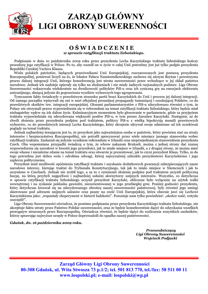 ZARZĄD GŁÓWNY LIGI OBRONY SUWERENNOŚCI OŚWIADCZENIE w sprawie ratyfikacji traktatu lizbońskiego. Podpisanie w dniu 10 października 2009 roku przez prezydenta Lecha Kaczyńskiego traktatu lizbońskiego kończy procedurę jego ratyfikacji w Polsce. Po to, aby wszedł on w życie w całej Unii potrzebny jest już tylko podpis prezydenta Republiki Czeskiej Vaclava Klausa. Wielu polskich patriotów, będących przeciwnikami Unii Europejskiej, rozczarowanych jest postawą prezydenta Rzeczpospolitej, ponieważ liczyli na to, że lokator Pałacu Namiestnikowskiego zachowa się niczym Reytan i powstrzyma proces dalszej integracji Unii, którego konsekwencją jest utrata suwerenności przez wchodzące w jej skład państwa narodowe. Jednak ich nadzieje opierały się tylko na złudzeniach i nie miały żadnych racjonalnych podstaw. Liga Obrony Suwerenności wskazywała wielokrotnie na dwulicowość polityków PiS-u oraz ich cyniczną grę na emocjach elektoratu antyunijnego, służącą jedynie do poprawienia wyników wyborczych tego ugrupowania. Tymczasem fakty świadczyły o prawdziwym stosunku partii braci Kaczyńskich do Unii i procesu jej dalszej integracji. Od samego początku wpisywali się oni w nurt oficjalnej prounijnej propagandy tumaniącej i oszukującej Polaków, co do prawdziwych skutków tzw. integracji europejskiej. Głosami parlamentarzystów z PiS-u zdecydowano również o tym, że Polacy nie otrzymali prawa wypowiedzenia się w referendum na temat ratyfikacji traktatu lizbońskiego, który będzie miał niebagatelny wpływ na ich dalsze życie. Kulminacyjnym momentem było głosowanie w parlamencie, gdzie za przyjęciem traktatu wypowiedziała się zdecydowana większość posłów PiS-u, w tym prezes Jarosław Kaczyński. Następnie, aż do chwili złożenia przez prezydenta podpisu pod traktatem, politycy PiS-u z wielką hipokryzją mamili prawicowych wyborców, co do prawdziwych intencji Lecha Kaczyńskiego, który skrzętnie ukrywał swoje odmienne od ich oczekiwań poglądy na temat traktatu. Jednak najbardziej żenującym jest to, że prezydent jako najważniejsza osoba w państwie, który powinien stać na straży interesów i bezpieczeństwa Rzeczpospolitej, nie potrafił sprecyzować przez wiele miesięcy jasnego stanowiska wobec ratyfikacji traktatu. Zasłaniał się jedynie wynikiem referendum w Irlandii oraz nieprzejednanym stanowiskiem prezydenta Czech. Oba wspomniane przypadki świadczą o tym, że wbrew nakazom Brukseli, można z jednej strony dać szansę wypowiedzenia się narodowi w kwestii jego przyszłości, jak to miało miejsce w Irlandii, a z drugiej strony, że można mieć swoje własne i niezależne zdanie na temat traktatu oraz otwarcie je prezentować, jak to czyni prezydent Klaus. Tylko, że do tego potrzebna jest dobra wola i odrobina odwagi, której najwyraźniej zabrakło prezydentowi Kaczyńskiemu i jego zapleczu politycznemu. Prezydent miał możliwość opóźnienia ratyfikacji traktatu i uzyskania dodatkowych gwarancji zabezpieczających nasze narodowe interesy, kierując traktat do Trybunału Konstytucyjnego, tak jak to miało miejsce w Niemczech i jak to uczyniono w Czechach. Jednak nie zrobił tego, a za to z ceremonii złożenia podpisu pod traktatem uczynił polityczną hucpę, na którą przybyli najgorliwsi i najbardziej usłużni akwizytorzy unijnych interesów. Wszystko, co dotychczas w sprawie ratyfikacji traktatu lizbońskiego uczynił prezydent Kaczyński, obliczone było wyłącznie na użytek walki wewnętrznej i na zyskanie poklasku gawiedzi, niezorientowanej w jego przebiegłej grze. Poniżej godności prezydenta, który dotychczas kreował się na zdecydowanego obrońcę naszej suwerenności państwowej, były również jego umizgi skierowane pod adresem unijnych salonów oraz peany na cześć Unii Europejskiej, która obecnie jawi się Lechowi Kaczyńskiemu jako: „wspaniały eksperyment w historii ludzkości”. Pozostaje nam tylko powiedzieć: „skończ waść, wstydu oszczędź!”. Liga Obrony Suwerenności oświadcza, że pomimo podpisania przez prezydenta Kaczyńskiego traktatu lizbońskiego, nie akceptuje faktu utraty przez Państwo Polskie suwerenności, oraz że będzie konsekwentnie dążyć do odzyskania wszelkich prerogatyw utraconych przez Rzeczpospolitą. Oświadcza również, że będzie dążyć do rozliczenia wszystkich osobników, którzy sprawując najwyższe urzędy w Polsce doprowadzili do upadku naszej państwowości. Gdańsk, dn. 16 października 2009 roku. Przewodniczący Ligi Obrony Suwerenności Wojciech Podjacki Zarząd Główny Ligi Obrony Suwerenności 80-308 Gdańsk, ul. Wita Stwosza 73 p.1/2; tel. 501 813 770, tel./fax: 58 511 00 11 www.lospolski.pl; e-mail: [email protected]