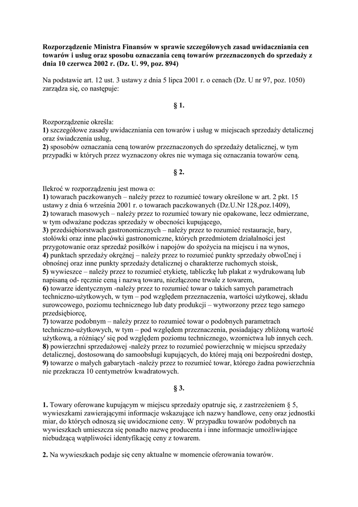 Rozporządzenie Ministra Finansów w sprawie szczegółowych zasad uwidaczniania cen towarów i usług oraz sposobu oznaczania ceną towarów przeznaczonych do sprzedaŜy z dnia 10 czerwca 2002 r. (Dz. U. 99, poz. 894) Na podstawie art. 12 ust. 3 ustawy z dnia 5 lipca 2001 r. o cenach (Dz. U nr 97, poz. 1050) zarządza się, co następuje: § 1. Rozporządzenie określa: 1) szczegółowe zasady uwidaczniania cen towarów i usług w miejscach sprzedaŜy detalicznej oraz świadczenia usług, 2) sposobów oznaczania ceną towarów przeznaczonych do sprzedaŜy detalicznej, w tym przypadki w których przez wyznaczony okres nie wymaga się oznaczania towarów ceną. § 2. Ilekroć w rozporządzeniu jest mowa o: 1) towarach paczkowanych – naleŜy przez to rozumieć towary określone w art. 2 pkt. 15 ustawy z dnia 6 września 2001 r. o towarach paczkowanych (Dz.U.Nr 128,poz.1409), 2) towarach masowych – naleŜy przez to rozumieć towary nie opakowane, lecz odmierzane, w tym odwaŜane podczas sprzedaŜy w obecności kupującego, 3) przedsiębiorstwach gastronomicznych – naleŜy przez to rozumieć restauracje, bary, stołówki oraz inne placówki gastronomiczne, których przedmiotem działalności jest przygotowanie oraz sprzedaŜ posiłków i napojów do spoŜycia na miejscu i na wynos, 4) punktach sprzedaŜy okręŜnej – naleŜy przez to rozumieć punkty sprzedaŜy obwoĽnej i obnośnej oraz inne punkty sprzedaŜy detalicznej o charakterze ruchomych stoisk, 5) wywieszce – naleŜy przez to rozumieć etykietę, tabliczkę lub plakat z wydrukowaną lub napisaną od- ręcznie ceną i nazwą towaru, niezłączone trwale z towarem, 6) towarze identycznym -naleŜy przez to rozumieć towar o takich samych parametrach techniczno-uŜytkowych, w tym – pod względem przeznaczenia, wartości uŜytkowej, składu surowcowego, poziomu technicznego lub daty produkcji – wytworzony przez tego samego przedsiębiorcę, 7) towarze podobnym – naleŜy przez to rozumieć towar o podobnych parametrach techniczno-uŜytkowych, w tym – pod względem przeznaczenia, posiadający zbliŜoną wartość uŜytkową, a róŜniący' się pod względem poziomu technicznego, wzornictwa lub innych cech. 8) powierzchni sprzedaŜowej -naleŜy przez to rozumieć powierzchnię w miejscu sprzedaŜy detalicznej, dostosowaną do samoobsługi kupujących, do której mają oni bezpośredni dostęp, 9) towarze o małych gabarytach -naleŜy przez to rozumieć towar, którego Ŝadna powierzchnia nie przekracza 10 centymetrów kwadratowych. § 3. 1. Towary oferowane kupującym w miejscu sprzedaŜy opatruje się, z zastrzeŜeniem § 5, wywieszkami zawierającymi informacje wskazujące ich nazwy handlowe, ceny oraz jednostki miar, do których odnoszą się uwidocznione ceny. W przypadku towarów podobnych na wywieszkach umieszcza się ponadto nazwę producenta i inne informacje umoŜliwiające niebudzącą wątpliwości identyfikację ceny z towarem. 2. Na wywieszkach podaje się ceny aktualne w momencie oferowania towarów. 3. Przy towarach wystawionych w miejscu ekspozycji handlowej, takim jak: okno (witryna), gablota i innym podobnym miejscu wystawowym, wewnątrz lub na zewnątrz przestrzeni związanej z miejscem sprzedaŜy, powinny być uwidocznione ceny. JeŜeli zamiast towarów oryginalnych przedsiębiorca wystawia ich atrapy, imitacje lub wzory, powinien uwidocznić ceny w taki sam sposób i taką samą czcionką, jak ceny towarów oryginalnych. 4. Przy wystawianiu na sprzedaŜ większej ilości określonego towaru cenę uwaŜa się za uwidocznioną, jeŜeli wywieszkę umieści się tylko przy jednej sztuce identycznego towaru. § 4. Wywieszki umieszcza się w miejscu ogólnodostępnym i widocznym dla kaŜdego kupującego, bezpośrednio przy towarach lub w bliskości towarów, których dotyczą, w taki sposób, aby nie moŜna było pomylić ceny określonego towaru z ceną innego, a w szczególności podobnego towaru. Napisy na wywieszkach powinny być wyraĽne i czytelne, tak aby nie budziły wątpliwości kupujących. § 5. 1. Ceny towarów przeznaczonych do sprzedaŜy, lecz umieszczonych w miejscu niedostępnym i niewidocznym dla kupujących, a w szczególności na zapleczu, uwidacznia się w zestawieniach cen, zwanych dalej “cennikami”. 2. Cenniki wywiesza się, wykłada lub w inny sposób udostępnia w miejscu sprzedaŜy towarów tak, aby były one czytelne dla kupujących. 3. Ceny towarów oferowanych w punktach sprzedaŜy okręŜnej uwidacznia się w cenniku wywieszonym w miejscu dostępnym dla kupujących. 4. Ceny potraw lub wyrobów oferowanych w przedsiębiorstwach gastronomicznych uwidacznia się w sposób czytelny w cenniku, wywieszonym w miejscu ogólnodostępnym dla kupujących wewnątrz lub na zewnątrz lokalu, w pobliŜu drzwi wejściowych. Cennik powinien ponadto zawierać aktualne informacje dodatkowe umoŜliwiające łatwą identyfikację ceny z towarem, w szczególności: datę wystawienia, pełną nazwę potrawy lub wyrobu, określenie ilości nominalnej potrawy lub wyrobu, wyraŜonej w legalnej jednostce miary, zawartej w jednej porcji, w tym zwłaszcza ilości głównego składnika (mięsa, drobiu, ryb), dodatków uzupełniających (przystawek, deserów) i napojów. W przypadku towarów, które ze swej natury mogą być sprzedawane na sztuki, dopuszcza się określenie ilości nominalnej oferowanej porcji w sztukach. § 6. 1. Ceny porcji wyrobów garmaŜeryjnych uwidacznia się na wywieszkach przy poszczególnych towarach, wraz z pełną ich nazwą, określeniem ilości nominalnej oferowanej porcji kaŜdego wyrobu, wyraŜonej w legalnej jednostce miary. W przypadku towarów, które ze swej natury mogą być sprzedawane na sztuki, dopuszcza się określenie ilości nominalnej oferowanej porcji w sztukach. 2. Przedsiębiorcy prowadzący działalność usługową w zakresie gastronomii lub hotelarstwa: 1) zapewniają wystarczającą ilość cenników oferowanych potraw lub wyrobów i napojów, aby udos