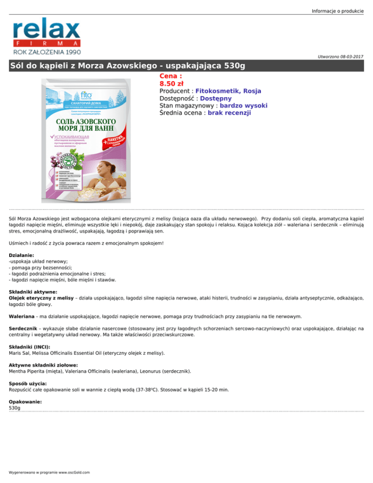 Informacje o produkcie Utworzono 08-03-2017 Sól do kąpieli z Morza Azowskiego - uspakajająca 530g Cena : 8.50 zł Producent : Fitokosmetik, Rosja Dostępność : Dostępny Stan magazynowy : bardzo wysoki Średnia ocena : brak recenzji Sól Morza Azowskiego jest wzbogacona olejkami eterycznymi z melisy (kojąca oaza dla układu nerwowego). Przy dodaniu soli ciepła, aromatyczna kąpiel łagodzi napięcie mięśni, eliminuje wszystkie lęki i niepokój, daje zaskakujący stan spokoju i relaksu. Kojąca kolekcja ziół – waleriana i serdecznik – eliminują stres, emocjonalną drażliwość, uspakajają, łagodzą i poprawiają sen. Uśmiech i radość z życia powraca razem z emocjonalnym spokojem! Działanie: -uspokaja układ nerwowy; - pomaga przy bezsenności; - łagodzi podrażnienia emocjonalne i stres; - łagodzi napięcie mięśni, bóle mięśni i stawów. Składniki aktywne: Olejek eteryczny z melisy – działa uspokajająco, łagodzi silne napięcia nerwowe, ataki histerii, trudności w zasypianiu, działa antyseptycznie, odkażająco, łagodzi bóle głowy. Waleriana – ma działanie uspokajające, łagodzi napięcie nerwowe, pomaga przy trudnościach przy zasypianiu na tle nerwowym. Serdecznik – wykazuje słabe działanie nasercowe (stosowany jest przy łagodnych schorzeniach sercowo-naczyniowych) oraz uspokajające, działając na centralny i wegetatywny układ nerwowy. Ma także właściwości przeciwskurczowe. Składniki (INCI): Maris Sal, Melissa Officinalis Essential Oil (eteryczny olejek z melisy). Aktywne składniki ziołowe: Mentha Piperita (mięta), Valeriana Officinalis (waleriana), Leonurus (serdecznik). Sposób użycia: Rozpuścić całe opakowanie soli w wannie z ciepłą wodą (37-38⁰C). Stosować w kąpieli 15-20 min. Opakowanie: 530g Wygenerowano w programie www.oscGold.com