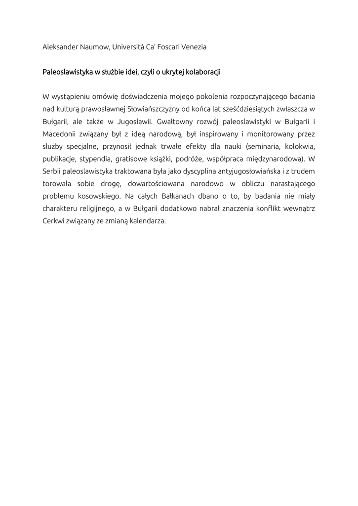 Aleksander Naumow, Università Ca’ Foscari Venezia Paleoslawistyka w służbie idei, czyli o ukrytej kolaboracji W wystąpieniu omówię doświadczenia mojego pokolenia rozpoczynającego badania nad kulturą prawosławnej Słowiańszczyzny od końca lat sześćdziesiątych zwłaszcza w Bułgarii, ale także w Jugosławii. Gwałtowny rozwój paleoslawistyki w Bułgarii i Macedonii związany był z ideą narodową, był inspirowany i monitorowany przez służby specjalne, przynosił jednak trwałe efekty dla nauki (seminaria, kolokwia, publikacje, stypendia, gratisowe książki, podróże, współpraca międzynarodowa). W Serbii paleoslawistyka traktowana była jako dyscyplina antyjugosłowiańska i z trudem torowała sobie drogę, dowartościowana narodowo w obliczu narastającego problemu kosowskiego. Na całych Bałkanach dbano o to, by badania nie miały charakteru religijnego, a w Bułgarii dodatkowo nabrał znaczenia konflikt wewnątrz Cerkwi związany ze zmianą kalendarza.