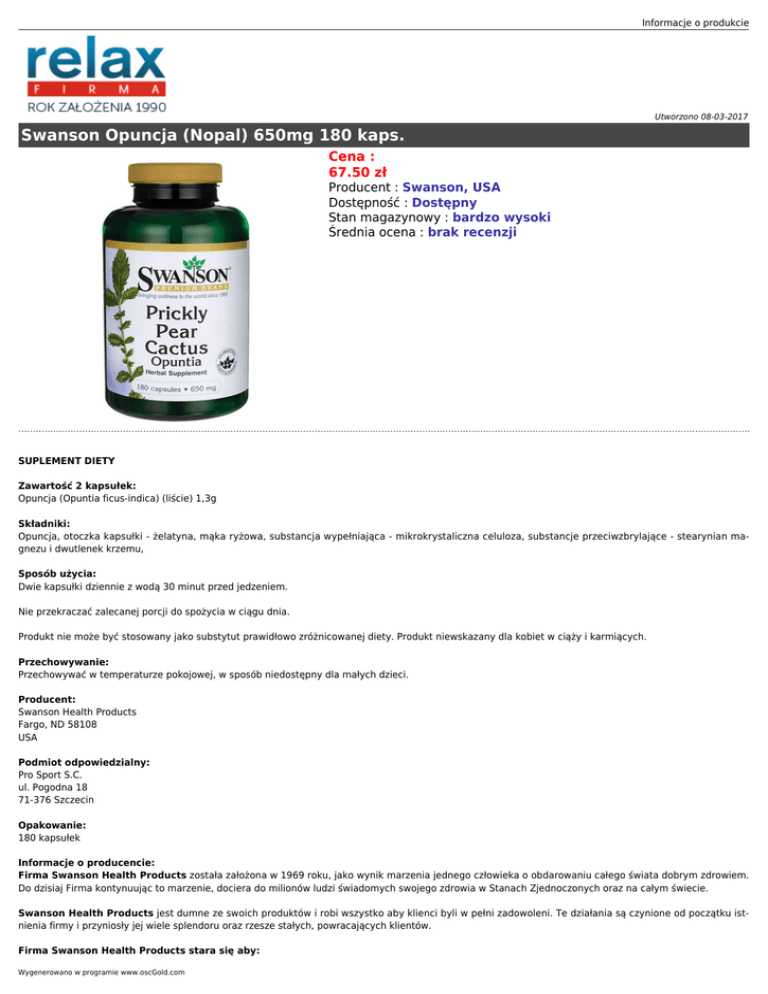 Informacje o produkcie Utworzono 08-03-2017 Swanson Opuncja (Nopal) 650mg 180 kaps. Cena : 67.50 zł Producent : Swanson, USA Dostępność : Dostępny Stan magazynowy : bardzo wysoki Średnia ocena : brak recenzji SUPLEMENT DIETY Zawartość 2 kapsułek: Opuncja (Opuntia ficus-indica) (liście) 1,3g Składniki: Opuncja, otoczka kapsułki - żelatyna, mąka ryżowa, substancja wypełniająca - mikrokrystaliczna celuloza, substancje przeciwzbrylające - stearynian magnezu i dwutlenek krzemu, Sposób użycia: Dwie kapsułki dziennie z wodą 30 minut przed jedzeniem. Nie przekraczać zalecanej porcji do spożycia w ciągu dnia. Produkt nie może być stosowany jako substytut prawidłowo zróżnicowanej diety. Produkt niewskazany dla kobiet w ciąży i karmiących. Przechowywanie: Przechowywać w temperaturze pokojowej, w sposób niedostępny dla małych dzieci. Producent: Swanson Health Products Fargo, ND 58108 USA Podmiot odpowiedzialny: Pro Sport S.C. ul. Pogodna 18 71-376 Szczecin Opakowanie: 180 kapsułek Informacje o producencie: Firma Swanson Health Products została założona w 1969 roku, jako wynik marzenia jednego człowieka o obdarowaniu całego świata dobrym zdrowiem. Do dzisiaj Firma kontynuując to marzenie, dociera do milionów ludzi świadomych swojego zdrowia w Stanach Zjednoczonych oraz na całym świecie. Swanson Health Products jest dumne ze swoich produktów i robi wszystko aby klienci byli w pełni zadowoleni. Te działania są czynione od początku istnienia firmy i przyniosły jej wiele splendoru oraz rzesze stałych, powracających klientów. Firma Swanson Health Products stara się aby: Wygenerowano w programie www.oscGold.com Cena produktu była możliwie najniższa. Czystość i Skuteczność była na jak najwyższym poziomie. Od kiedy firma szczyci się certyfikatem Dobrej Praktyki Wytwarzania (GMP) składniki są testowane na różnych etapach całego procesu produkcji w celu sprawdzenia czystości i mocy a gotowe produkty są badane przez niezależne laboratoria w celu potwierdzenia że, to co na etykiecie to jest w produkcie.