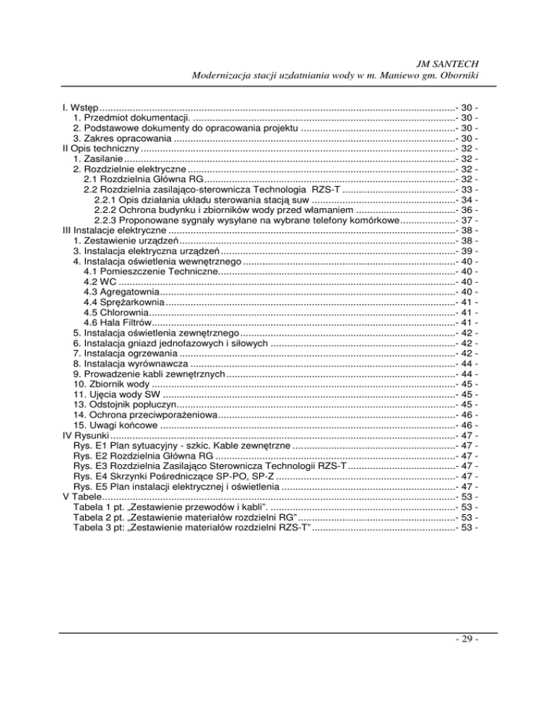 JM SANTECH Modernizacja stacji uzdatniania wody w m. Maniewo gm. Oborniki I. Wstęp.................................................................................................................................- 30 1. Przedmiot dokumentacji. ...............................................................................................- 30 2. Podstawowe dokumenty do opracowania projektu ........................................................- 30 3. Zakres opracowania ......................................................................................................- 30 II Opis techniczny ..................................................................................................................- 32 1. Zasilanie ........................................................................................................................- 32 2. Rozdzielnie elektryczne .................................................................................................- 32 2.1 Rozdzielnia Główna RG...........................................................................................- 32 2.2 Rozdzielnia zasilająco-sterownicza Technologia RZS-T .........................................- 33 2.2.1 Opis działania układu sterowania stacją suw ....................................................- 34 2.2.2 Ochrona budynku i zbiorników wody przed włamaniem ....................................- 36 2.2.3 Proponowane sygnały wysyłane na wybrane telefony komórkowe....................- 37 III Instalacje elektryczne ........................................................................................................- 38 1. Zestawienie urządzeń....................................................................................................- 38 3. Instalacja elektryczna urządzeń .....................................................................................- 39 4. Instalacja oświetlenia wewnętrznego .............................................................................- 40 4.1 Pomieszczenie Techniczne......................................................................................- 40 4.2 WC ..........................................................................................................................- 40 4.3 Agregatownia...........................................................................................................- 40 4.4 Sprężarkownia .........................................................................................................- 41 4.5 Chlorownia...............................................................................................................- 41 4.6 Hala Filtrów..............................................................................................................- 41 5. Instalacja oświetlenia zewnętrznego..............................................................................- 42 6. Instalacja gniazd jednofazowych i siłowych ...................................................................- 42 7. Instalacja ogrzewania ....................................................................................................- 42 8. Instalacja wyrównawcza ................................................................................................- 44 9. Prowadzenie kabli zewnętrznych ...................................................................................- 44 10. Zbiornik wody ..............................................................................................................- 45 11. Ujęcia wody SW ..........................................................................................................- 45 13. Odstojnik popłuczyn.....................................................................................................- 45 14. Ochrona przeciwporażeniowa......................................................................................- 46 15. Uwagi końcowe ...........................................................................................................- 46 IV Rysunki .............................................................................................................................- 47 Rys. E1 Plan sytuacyjny - szkic. Kable zewnętrzne ...........................................................- 47 Rys. E2 Rozdzielnia Główna RG .......................................................................................- 47 Rys. E3 Rozdzielnia Zasilająco Sterownicza Technologii RZS-T .......................................- 47 Rys. E4 Skrzynki Pośredniczące SP-PO, SP-Z .................................................................- 47 Rys. E5 Plan instalacji elektrycznej i oświetlenia ...............................................................- 47 V Tabele................................................................................................................................- 53 Tabela 1 pt. „Zestawienie przewodów i kabli”. ...................................................................- 53 Tabela 2 pt. „Zestawienie materiałów rozdzielni RG” .........................................................- 53 Tabela 3 pt: „Zestawienie materiałów rozdzielni RZS-T” ....................................................- 53 - - 29 - JM SANTECH Modernizacja stacji uzdatniania wody w m. Maniewo gm. Oborniki I. Wstęp 1. Przedmiot dokumentacji. Przedmiotem dokumentacji jest instalacja siły, sterowania i automatyki dla Stacji Uzdatniania Wody w m. Maniewo. 2. Podstawowe dokumenty do opracowania projektu 2.1 Zlecenie inwestora 2.2 Plan zagospodarowania terenu 2.3 Projektu technologicznego 2.4 Dokumentacji techniczno – ruchowych 2.5 Aktualnych norm min : − PN-IEC 60364 „Instalacje elektryczne w obiektach budowlanych” − PN-86/E-05003/01,02 „Ochrona odgromowa obiektów budowlanych – wymagania ogólne, ochrona podstawowa” − PN-IEC 61024-1 „Ochrona odgromowa obiektów budowlanych. Zasady ogólne. Wybór