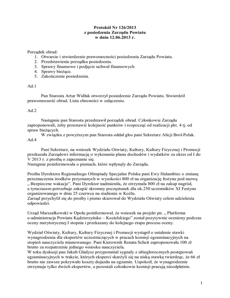Protokół Nr 126/2013 z posiedzenia Zarządu Powiatu w dniu 12.06.2013 r. Porządek obrad: 1. Otwarcie i stwierdzenie prawomocności posiedzenia Zarządu Powiatu. 2. Przedstawienie porządku posiedzenia. 3. Sprawy finansowe i podjęcie uchwał finansowych 4. Sprawy bieżące. 5. Zakończenie posiedzenia. Ad.1 Pan Starosta Artur Widłak otworzył posiedzenie Zarządu Powiatu. Stwierdził prawomocność obrad. Lista obecności w załączeniu. Ad.2 Następnie pan Starosta przedstawił porządek obrad. Członkowie Zarządu zaproponowali, żeby przestawić kolejność punktów i rozpocząć od realizacji pkt. 4 tj. od spraw bieżących. W związku z powyższym pan Starosta oddał głos pani Sekretarz Alicji Brol-Polak. Ad.4 Pani Sekretarz, na wniosek Wydziału Oświaty, Kultury, Kultury Fizycznej i Promocji przekazała Zarządowi informację o wykonaniu planu dochodów i wydatków za okres od I do V 2013 r. z prośbą o zapoznanie się. Następnie poinformowała o pismach, które wpłynęły do Zarządu. Prośba Dyrektora Regionalnego Olimpiady Specjalne Polska pani Ewy Hałambiec o zmianę przeznaczenia środków przyznanych w wysokości 800 zł na organizację festynu pod nazwą „ Bezpieczne wakacje”. Pani Dyrektor nadmieniła, że otrzymała 800 zł na zakup nagród, a tymczasem potrzebuje zakupić skromny poczęstunek dla ok.250 uczestników XI Festynu organizowanego w dniu 25 czerwca na stadionie w Koźlu. Zarząd przychylił się do prośby i pismo skierował do Wydziału Oświaty celem udzielenia odpowiedzi. Urząd Marszałkowski w Opolu poinformował, że wniosek na projekt pn. „ Platforma e-administracja Powiatu Kędzierzyńsko – Kozielskiego” został pozytywnie oceniony podczas oceny merytorycznej I stopnia i przekazany do kolejnego etapu procesu oceny. Wydział Oświaty, Kultury, Kultury Fizycznej i Promocji wystąpił o ustalenie stawki wynagrodzenia dla ekspertów uczestniczących w pracach komisji egzaminacyjnych na stopień nauczyciela mianowanego. Pani Kierownik Renata Scheit zaproponowała 100 zł brutto za rozpatrzenie jednego wniosku nauczyciela. W toku dyskusji pan Jakub Gładysz przypomniał sygnały z ubiegłorocznych postępowań egzaminacyjnych w trakcie, których eksperci skarżyli się na niską stawkę twierdząc, że 66 zł brutto nie zawsze pokrywało koszty dojazdu na egzamin. Uspokoił, że wynagrodzenie otrzymuje tylko dwóch ekspertów, a pozostali członkowie komisji pracują nieodpłatnie. 1 Zarząd zaakceptował propozycję Wydziału i ustalił, że ekspert otrzyma 100 zł za jeden rozpatrzony wniosek nauczyciela. Wydział Oświaty, Kultury, Kultury Fizycznej i Promocji zawnioskował, żeby Zarząd uruchomił kwotę 1.000,00 zł na organizację uroczystego oddania do użytku nowych pracowni do kształcenia zawodowego w Centrum Kształcenia Praktycznego i Ustawicznego w dniu 14 czerwca 2013 r. Zarząd zgodził się i przyznano 1.000,00 zł z rezerwy ogólnej. Na posiedzenie Zarządu przybyły panie: Kierownik Wydziału Renata Scheit i podinspektor Alicja Pałosz. Pan Starosta poprosił p. Pałosz o informację na temat finansowania szkół niepublicznych. Pani Alicja Pałosz przystępując do przedstawienia informacji o stopniu realizacji dotacji dla szkół niepublicznych o uprawnieniach szkół publicznych poinformowała, że subwencja oświatowa została naliczona dla 1729 uczniów, a w okresie od I do V 2013 50 % frekwencją na zajęciach wykazało się 1 073 uczniów. Dotacje przekazano w wysokości 22,21 % planu. Zwróciła też uwagę, że w oświacie publicznej jest niedoszacowany plan w § 4260 energia i trzeba będzie w miesiącu wrześniu, tj. po zakończeniu naboru do szkół dokonać zmian w ramach środków zaplanowanych na oświatę. Pani Kierownik Renata Scheit z kolei przypomniała, że nie jest rozstrzygnięta sprawa wykonania zaleceń SANEPIDU w ZS Nr 1 i ZS Nr 3. Pani Kierownik nie posiada żadnych informacji z Wydziału Gospodarczego o wynikach przeprowadzonego przetargu na wykonanie tych zadań. Wobec powyższego pan Starosta poprosił pana Piotra Kmiecia o informację. Pan Piotr Kmieć poinformował, że w dniu wczorajszym był w ZS Nr 1 gdzie wspólnie z panią Dyrektor określił zakres robót. Ostatecznie zrezygnowano z pomalowania dwóch korytarzy, co pozwoliło zmniejszyć koszty. Natomiast w ZS Nr 3 zakres robót pozostaje na poziomie ok.54.000,00 zł. Pan Starosta polecił panu Piotrowi, żeby zorientował się w ZS Nr 3 ile szkoła może wykonać własnymi siłami, żeby obniżyć koszty remontu sali gimnastycznej. Pani R. Scheit poinformowała, że przecieka dach na sali gimnastycznej w Zespole Szkól Specjalnych. Zarząd przesunął na kolejne posiedzenie sprawę wymiany c.o w ZS Nr 1, ponieważ w dalszym ciągu oczekuje na wyszacowanie kosztów realizacji zadania przez ZS Nr 1. Pani Sekretarz poprosiła o wytypowanie przedstawicieli do Komisji Konkursowej do przeprowadzenia konkursu w sprawie wyłonienia kandydata na stanowisko dyrektora Publicznego Ogniska Artystycznego w Kędzierzynie – Koźlu. Zarząd postanowił, że w skład komisji konkursowej wejdą: p. Dorota Tomala, p. Renata Scheit oraz jeden przedstawiciel Komisji Edukacji i Promocji. Postanowiono wystąpić do Komisji Edukacji i Promocji o wytypowanie przedstawiciela. Dyrektor II LO pani Zofia Wyrozumska wystąpiła z wnioskiem o uruchomienie kwoty 12.895,00 zł na wykonanie instalacji odgromowej, ponieważ w czasie terminowych badań 2 okazało się, że istniejąca instalacja odgromowa nie nadaje się do eksploatacji. Do wniosku dołączyła Protokół nr 12/05/2013 oraz kosztorys robót. Ponieważ z pisma Dyrektora szkoły nie wynika czy przeprowadzono postępowanie przetargowe w wyniku, którego ustalono żądaną kwotę Zarząd postanowił skierować pismo do Wydziału Oświaty celem pozyskania dokładnej informacji o zebranych przez szkołę ofertach. Pan Ryszard Więcek – Dyrektor I LO przekazał Protokół Ewaluacji Wskaźników Rezultatu P
