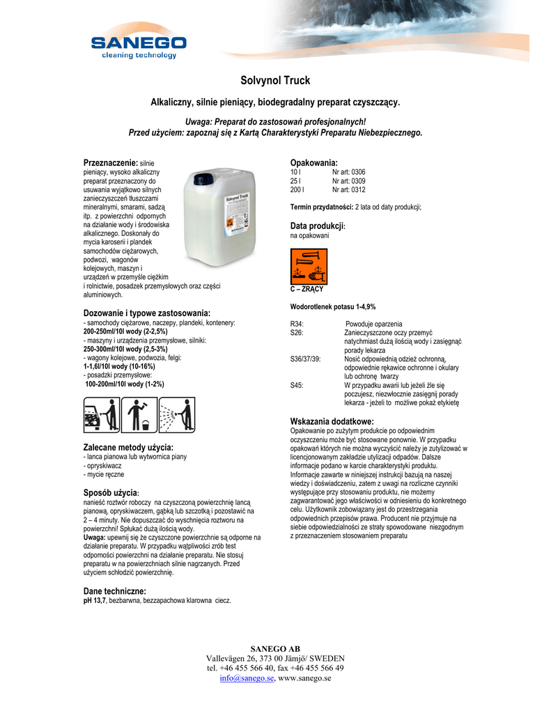 Solvynol Truck Alkaliczny, silnie pieniący, biodegradalny preparat czyszczący. Uwaga: Preparat do zastosowań profesjonalnych! Przed użyciem: zapoznaj się z Kartą Charakterystyki Preparatu Niebezpiecznego. Przeznaczenie: silnie pieniący, wysoko alkaliczny preparat przeznaczony do usuwania wyjątkowo silnych zanieczyszczeń tłuszczami mineralnymi, smarami, sadzą itp. z powierzchni odpornych na działanie wody i środowiska alkalicznego. Doskonały do mycia karoserii i plandek samochodów ciężarowych, podwozi, wagonów kolejowych, maszyn i urządzeń w przemyśle ciężkim i rolnictwie, posadzek przemysłowych oraz części aluminiowych. Dozowanie i typowe zastosowania: - samochody ciężarowe, naczepy, plandeki, kontenery: 200-250ml/10l wody (2-2,5%) - maszyny i urządzenia przemysłowe, silniki: 250-300ml/10l wody (2,5-3%) - wagony kolejowe, podwozia, felgi: 1-1,6l/10l wody (10-16%) - posadzki przemysłowe: 100-200ml/10l wody (1-2%) Opakowania: 10 l 25 l 200 l Nr art: 0306 Nr art: 0309 Nr art: 0312 Termin przydatności: 2 lata od daty produkcji; Data produkcji: na opakowani C – ŻRĄCY Wodorotlenek potasu 1-4,9% R34: S26: S36/37/39: S45: Powoduje oparzenia Zanieczyszczone oczy przemyć natychmiast dużą ilością wody i zasięgnąć porady lekarza Nosić odpowiednią odzież ochronną, odpowiednie rękawice ochronne i okulary lub ochronę twarzy W przypadku awarii lub jeżeli źle się poczujesz, niezwłocznie zasięgnij porady lekarza - jeżeli to możliwe pokaż etykietę Wskazania dodatkowe: Zalecane metody użycia: - lanca pianowa lub wytwornica piany - opryskiwacz - mycie ręczne Sposób użycia: nanieść roztwór roboczy na czyszczoną powierzchnię lancą pianową, opryskiwaczem, gąbką lub szczotką i pozostawić na 2 – 4 minuty. Nie dopuszczać do wyschnięcia roztworu na powierzchni! Spłukać dużą ilością wody. Uwaga: upewnij się że czyszczone powierzchnie są odporne na działanie preparatu. W przypadku wątpliwości zrób test odporności powierzchni na działanie preparatu. Nie stosuj preparatu w na powierzchniach silnie nagrzanych. Przed użyciem schłodzić powierzchnię. Opakowanie po zużytym produkcie po odpowiednim oczyszczeniu może być stosowane ponownie. W przypadku opakowań których nie można wyczyścić należy je zutylizować w licencjonowanym zakładzie utylizacji odpadów. Dalsze informacje podano w karcie charakterystyki produktu. Informacje zawarte w niniejszej instrukcji bazują na naszej wiedzy i doświadczeniu, zatem z uwagi na rozliczne czynniki występujące przy stosowaniu produktu, nie możemy zagwarantować jego właściwości w odniesieniu do konkretnego celu. Użytkownik zobowiązany jest do przestrzegania odpowiednich przepisów prawa. Producent nie przyjmuje na siebie odpowiedzialności ze straty spowodowane niezgodnym z przeznaczeniem stosowaniem preparatu Dane techniczne: pH 13,7, bezbarwna, bezzapachowa klarowna ciecz. SANEGO AB Vallevägen 26, 373 00 Jämjö/ SWEDEN tel. +46 455 566 40, fax +46 455 566 49 [email protected], www.sanego.se