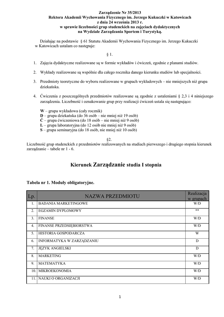 Zarządzenie Nr 35/2013 Rektora Akademii Wychowania Fizycznego im. Jerzego Kukuczki w Katowicach z dnia 24 września 2013 r. w sprawie liczebności grup studenckich na zajęciach dydaktycznych na Wydziale Zarządzania Sportem i Turystyką. Działając na podstawie § 61 Statutu Akademii Wychowania Fizycznego im. Jerzego Kukuczki w Katowicach ustalam co następuje: § 1. 1. Zajęcia dydaktyczne realizowane są w formie wykładów i ćwiczeń, zgodnie z planami studiów. 2. Wykłady realizowane są wspólnie dla całego rocznika danego kierunku studiów lub specjalności. 3. Przedmioty teoretyczne do wyboru realizowane w grupach wykładowych – nie mniejszych niż grupa dziekańska. 4. Ćwiczenia z poszczególnych przedmiotów realizowane są zgodnie z ustaleniami § 2,3 i 4 niniejszego zarządzenia. Liczebność i oznakowanie grup przy realizacji ćwiczeń ustala się następująco: W – grupa wykładowa (cały rocznik) D – grupa dziekańska (do 36 osób – nie mniej niż 19 osób) Ć – grupa ćwiczeniowa (do 18 osób – nie mniej niż 9 osób) L – grupa laboratoryjna (do 12 osób nie mniej niż 9 osób) S – grupa seminaryjna (do 18 osób, nie mniej niż 10 osób) §2. Liczebność grup studenckich z przedmiotów realizowanych na studiach pierwszego i drugiego stopnia kierunek zarządzanie – tabele nr 1 - 6. Kierunek Zarządzanie studia I stopnia Tabela nr 1. Moduły obligatoryjne. Lp. NAZWA PRZEDMIOTU Realizacja w grupach 1. BADANIA MARKETINGOWE W/D 2. EGZAMIN DYPLOMOWY 3. FINANSE W/D 4. FINANSE PRZEDSIĘBIORSTWA W/D 5. HISTORIA GOSPODARCZA W 6. INFORMATYKA W ZARZĄDZANIU D 7. JĘZYK ANGIELSKI D 8. MARKETING W/D 9. MATEMATYKA W/D 10. MIKROEKONOMIA W/D 11. NAUKI O ORGANIZACJI W/D ** 1 12. PODSTAWY ZARZĄDZANIA W/D 13. PRAWO W/D 14. PSYCHOLOGIA W 15. RACHUNKOWOŚĆ FINANSOWA W/D 16. SEMINARIUM DYPLOMOWE D/S 17. SOCJOLOGIA W 18. STATYSTYKA OPISOWA W/D 19. TECHNOLOGIA INFORMACYJNA D 20. WYCHOWANIE FIZYCZNE D 21. ZACHOWANIA ORGANIZACYJNE W/D 22. ZARZĄDZANIE JAKOŚCIĄ W/D 23. ZARZĄDZANIE PROJEKTAMI W/D 24. ZARZĄDZANIE ZASOBAMI LUDZKIMI W/D **zgodnie z uchwałą Senatu Tabela nr 2. Moduły do wyboru z różnych obszarów kształcenia. Lp. NAZWA PRZEDMIOTU Realizacja w grupach 1. MODUŁ JĘZYKOWY – JĘZYK OBCY DRUGI DO WYBORU D 2. MODUŁ Z OBSZARU NAUK HUMANISTYCZNYCH W 3. MODUŁ Z OBSZARU NAUK SPOŁECZNYCH W 4. MODUŁ Z OBSZARU NAUK O KULTURZE FIZYCZNEJ D Tabela nr 3. Grupa treści programowych do wyboru Lp. NAZWA PRZEDMIOTU Realizacja w grupach 1. AQUA FITNESS D 2. JĘZYK OBCY – DRUGI DO WYBORU D 3. KONWERSATORIUM LUB ZAJĘCIA REKREACYJNE D 4. PRZEDMIOTY Z ZAKRESU TREŚCI EKONOMICZNYCH W 5. PRZEDMIOTY Z ZAKRESU TREŚCI HUMANISTYCZNYCH W 6. PRZEDMIOTY Z ZAKRESU TREŚCI ZWIĄZANYCH ZE SPECJALNOŚCIĄ W Tabela nr 4. Moduły do wyboru z zakresu specjalności 2 Lp. NAZWA PRZEDMIOTU Realizacja w grupach MODUŁ ZAJĘĆ Z ZAKRESU SPECJALNOŚCI ZARZĄDZANIA TURYSTYKĄ, HOTELARSTWEM I GASTRONOMIĄ/ GRUPA TREŚCI PROGRAMOWYCH Z ZAKRESU SPECJALNOŚCI 1. EKOLOGICZNE UWARUNKOWANIA TURYSTYKI I SPORTU W 2. EKONOMIKA W TURYSTYCE, HOTELARSTWIE I GASTRONOMII W/D 3. GENEZA I ROZWÓJ TURYSTYKI W/D 4. GEOGRAFIA TURYSTYCZNA W/D 5. POLITYKA PAŃSTWA WOBEC TURYSTYKI I SPORTU W 6. PROGRAMOWANIE I OBSŁUGA RUCHU TURYSTYCZNEGO W/D 7. RYNEK TURYSTYCZNY W/D 8. ZARZĄDZANIE KULTURA FIZYCZNĄ W/D MODUŁ ZAJĘĆ Z ZAKRESU SPECJALNOŚCI ZARZĄDZANIA SPORTEM/ GRUPA TREŚCI PROGRAMOWYCH Z ZAKRESU SPECJALNOŚCI 1. EKOLOGICZNE UWARUNKOWANIA TURYSTYKI I SPORTU W 2. EKONOMIKA SPORTU W/D 3. GENEZA I ROZWÓJ SPORTU W/D 4. INFRASTRUKTURA SPORTOWA W/D 5. ORGANIZACJA IMPREZ SPORTOWYCH W/D 6. POLITYKA PAŃSTWA WOBEC TURYSTYKI I SPORTU W 7. SYSTEMY SZKOLENIA W SPORCIE W/D 8. ZARZĄDZANIE KULTURA FIZYCZNĄ W/D MODUŁ ZAJĘĆ Z ZAKRESU SPECJALNOŚCI ZARZĄDZANIA KRYZYSOWEGO/ GRUPA TREŚCI PROGRAMOWYCH Z ZAKRESU SPECJALNOŚCI 1. BEZPIECZEŃSTWO PUBLICZNE W/D 2. HISTORYCZNE ASPEKTY BEZPIECZEŃSTWA NARODOWEGO W/D 3. OBRONA CYWILNA W/D 4. POLITYKA BEZPIECZEŃSTWA I OBRONNOŚCI W/D 5. POZAMILITARNE ASPEKTY BEZPIECZEŃSTWA W/D 6. TEORIA EDUKACJI DLA BEZPIECZEŃSTWA W/D 7. ZAGROŻENIE EKOLOGICZNE W/D 8. ZARZĄDZANIE W SYTUACJACH KRYZYSOWYCH W/D MODUŁ ZAJĘĆ Z ZAKRESU SPECJANOŚCI ZARZĄDZANIA W FIZJOTERAPII I SPORCIE OSÓB NIEPEŁNOSPRAWNYCH/ GRUPA TREŚCI PROGRAMOWYCH Z ZAKRESU SPECJALNOŚCI 1. HISTORIA FIZJOTERAPII W/D 2. INFRASTRUKTURA W FIZJOTERAPII I SPORCIE OSÓB NIEPEŁNOSPRAWNYCH W/D 3. MARKETING W FIZJOTERAPII I SPORCIE OSÓB NIEPEŁNOSPRAWNYCH W/D 3 4. ORGANIZACJA IMPREZ SPORTOWYCH OSÓB NIEPEŁNOSPRAWNYCH W/D 5. ORGANIZACJA SYSTEMU OCHRONY ZDROWIA W/D 6. POLITYKA ZDROWOTNA I ZARZĄDZANIE W OCHRONIE ZDROWIA W/D 7. RESTRUKTURYZACJA I PRZEKSZTAŁCENIA WŁASNOŚCIOWE W ZAKŁADACH OPIEKI ZDROWTNEJ 8. ZARZĄDZANIE KULTURA FIZYCZNĄ W/D W/D MODUŁ Z ZAJĘĆ Z ZAKRESU SPECJALNOŚCI ZARZĄDZANIA USŁUGAMI ZDROWOTNYMI 1. MARKETING USŁUG ZDROWOTNYCH W/D 2. ORGANIZACJA USŁUG ZDROWOTNYCH W/D 3. PROBLEMY GERONTOLOGII I NIEPEŁNOSPRAWNOŚCI W/D 4. PROFILAKTYKA ZDROWIA W/D 5. SYSTEMY OCHRONY ZDROWIA W POLSCE I NA ŚWIECIE W/D 6. UBEZPIECZENIA W USŁUGACH ZDROWOTNYCH W/D 7. ZARZĄDZANIE FINANSAMI W ORGANIZACJACH OCHRONY ZDROWIA W/D 8. ZARZĄDZANIE ORGANIZACJAMI OCHRONY ZDROWIA W/D Tabela nr 5. Moduły realizowane poza terenem uczelni Lp. NAZWA PRZEDMIOTU Realizacja w grupach 1. ANIMACJA CZASU WOLNEGO D 2. GOLF D 3. JOGGING D 4. KAJAKARSTWO D 5. KOLARSTWO D 6. NARCIARSTWO D 7. NORDIC WALKING D 8. SNOWBOARD D 9. TERENOWE FORMY AKTYWNOŚCI FIZYCZNEJ D 10. TREKKING D 11. TURYSTYKA GÓRSKA D 12. ŻEGLARSTWO JACHTOWE D 4 Kierunek Zarządzanie studia II stopnia specjalność Zarządzanie organizacjami sportowymi i turystycznymi Tabela nr 6. Moduły obligatoryjne Lp. NAZWA PRZEDMIOTU Realizacja w grupach 1. BADANIA MARKETINGOWE W ORGANIZACJACH SPORTOWYCH I TURYSTYCZNYCH 2. CONTROLING I BUDŻETOWANIE W PRZEDSIĘBIORSTWACH SPORTOWYCH I TURYSTYCZNYCH 3. ETYKA W ZARZĄDZANIU W 4. JĘZYK ANGIELSKI D 5. KIERUNKI ROZWOJU SPORTU I TURYSTYKI W/D