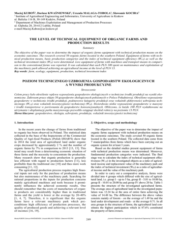 Maciej KUBOŃ1, Dariusz KWAŚNIEWSKI1, Urszula MALAGA-TOBOŁA1, Sławomir KOCIRA2 1 Institute of Agricultural Engineering and Informatics, University of Agriculture in Krakow ul. Balicka 116 B, 30-149 Kraków, Poland 2 Department of Machines Exploitation and Management of Production Processes ul. Głęboka 28, 20-612 Lublin, Poland e-mail:[email protected] THE LEVEL OF TECHNICAL EQUIPMENT OF ORGANIC FARMS AND PRODUCTION RESULTS Summary The objective of the paper was to determine the impact of organic farms equipment with technical production means on the economic outcomes. The research covered 50 organic farms located in the southern Poland. Equipment of farms with technical production means, basic production categories and the index of technical equipment efficiency (WUT) as well as the technical investment index (WIT) were determined. Low equipment of farms with machines and transport means in comparison to the conventional farms was reported. It was calculated that each PLN 100 spent on maintenance and exploitation of the machinery park allowed achieving an agricultural income at the level of PLN 13. Key words: farm, ecology, equipment, production, technical investment index POZIOM TECHNICZNEGO UZBROJENIA GOSPODARSTW EKOLOGICZNYCH A WYNIKI PRODUKCYJNE Streszczenie Celem pracy było określenie wpływu wyposażenia gospodarstw ekologicznych w techniczne środki produkcji na wyniki ekonomiczne. Zakresem pracy objęto 50 gospodarstw ekologicznych położonych w Polsce Południowej. Określono wyposażenie gospodarstw w techniczne środki produkcji, podstawowe kategorie produkcji oraz wskaźnik efektywności uzbrojenia technicznego (WUT) oraz wskaźnik inwestycyjności technicznej (WIT). Stwierdzono niskie wyposażenie gospodarstw w maszyny i środki transportowe w porównaniu do gospodarstw konwencjonalnych. Obliczono, że każde 100 PLN wydatkowane na utrzymanie i eksplantację parku maszynowego pozwoliło osiągnąć dochód rolniczy na poziomie 13 PLN. Słowa kluczowe: gospodarstwo, ekologia, uzbrojenie, produkcja, wskaźnik inwestycyjności technicznej 1. Introduction 2. Objective, scope and methodology In the recent years the change of farms from traditional to organic has been observed in Poland. The statistical data collected in the base of the Inspectorate of the Commercial Quality of Agri-food Products (Polish IJHAR'S) show that in 2014 the total area of agricultural land under organic crops decreased by approximately 2 % and the number of organic farms by 7% in comparison to 2013 [13, 15]. This trend may result from a deteriorating economic situation of these farms and the necessity to concentrate the production. Many research show that organic production is generally less efficient with regard to production factors [11], less profitable than the traditional one [10] and thus more work consuming [11, 12]. The agricultural production process requires high financial inputs not only for the purchase of production means but also maintenance of the machinery park. Searching for rational proportions in the inputs for production concerns mainly agricultural machines and tools because it prominently influences the achieved economic results. One should remember that the costs of manufacture of organic products are considerably higher than in traditional farms and the yield is lower at the average by 20-40% [1, 4, 7]. Therefore, it is significant that the organic farms have a relevant machinery park which preconditions high efficiency of production processes, the quality of produced goods and achieving a relevant level of incomes [16, 19]. The objective of the paper was to determine the impact of organic farms equipment with technical production means on the economic outcomes. The study covered 50 organic farms located in the southern Poland. The collected data came from 7 municipalities from farms which have been carrying out an organic system for at least 3 years. Based on the detailed studies present equipment of farms with technical production means was determined. Moreover, fundamental production categories were indicated. The final stage was to calculate the index of technical equipment effectiveness (WUT) in the investigated objects as a ratio of agricultural income and replacement value of the machinery park and the index of technical investment (WIT) as a ratio of agricultural income and the value of the machinery park. In order to carry out a comparative analysis, farms were divided into 4 groups which differed with the size of agricultural land, i.e. group I - up to 5 ha, group II - 5.01 to 10.00 ha, group II - 10.01 to 20.00 ha and group IV above 20 ha. Table 1 presents the structure of the investigated agricultural farms. The average area of agricultural land in the investigated population was 12.24 ha at the area of entire farm achieving the value of 14.48 ha. The difference between the above values consists mainly of forests - on the average of 1.49 ha and the land under development and roads - at the average 0.71. In all area groups in the structure of farms, the agricultural land constitutes the highest participation which in 87.6% constituted the property of farm owners. Maciej KUBOŃ, Dariusz KWAŚNIEWSKI, Urszula MALAGA-TOBOŁA, Sławomir KOCIRA 249 „Journal of Research and Applications in Agricultural Engineering” 2016, Vol. 61(3) were 1.72 items of tractors in the investigated farms. When comapring this saturation in the area groups system, one may note a logical increase in the number of these technical means (0.85-2.8 item·farm-1) per a statistical farm along with the increase of this area. It should be mentioned, however, that these tractors were old, worn and cooperate mainly with the equally old equipment (average age 20 years) which translates into the use of old and work consuming technologies in the investigated farms. As a result there is no innovativeness. Equipment of organic farms in delivery cars is very low. Since, on the average per a farm there 