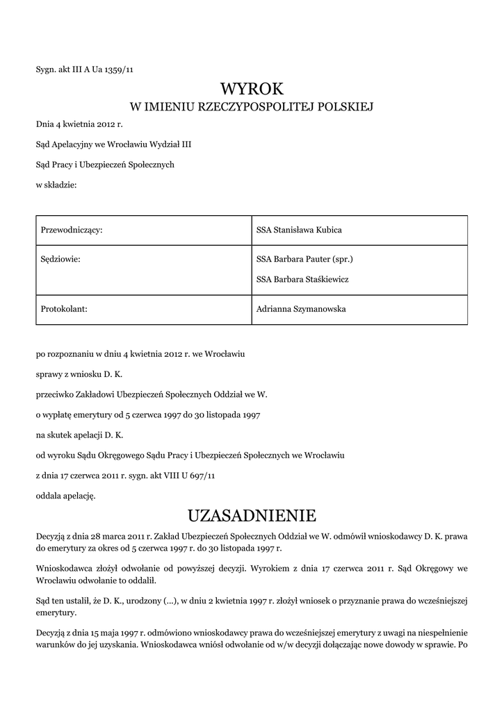 Sygn. akt III A Ua 1359/11 WYROK W IMIENIU RZECZYPOSPOLITEJ POLSKIEJ Dnia 4 kwietnia 2012 r. Sąd Apelacyjny we Wrocławiu Wydział III Sąd Pracy i Ubezpieczeń Społecznych w składzie: Przewodniczący: SSA Stanisława Kubica Sędziowie: SSA Barbara Pauter (spr.) SSA Barbara Staśkiewicz Protokolant: Adrianna Szymanowska po rozpoznaniu w dniu 4 kwietnia 2012 r. we Wrocławiu sprawy z wniosku D. K. przeciwko Zakładowi Ubezpieczeń Społecznych Oddział we W. o wypłatę emerytury od 5 czerwca 1997 do 30 listopada 1997 na skutek apelacji D. K. od wyroku Sądu Okręgowego Sądu Pracy i Ubezpieczeń Społecznych we Wrocławiu z dnia 17 czerwca 2011 r. sygn. akt VIII U 697/11 oddala apelację. UZASADNIENIE Decyzją z dnia 28 marca 2011 r. Zakład Ubezpieczeń Społecznych Oddział we W. odmówił wnioskodawcy D. K. prawa do emerytury za okres od 5 czerwca 1997 r. do 30 listopada 1997 r. Wnioskodawca złożył odwołanie od powyższej decyzji. Wyrokiem z dnia 17 czerwca 2011 r. Sąd Okręgowy we Wrocławiu odwołanie to oddalił. Sąd ten ustalił, że D. K., urodzony (...), w dniu 2 kwietnia 1997 r. złożył wniosek o przyznanie prawa do wcześniejszej emerytury. Decyzją z dnia 15 maja 1997 r. odmówiono wnioskodawcy prawa do wcześniejszej emerytury z uwagi na niespełnienie warunków do jej uzyskania. Wnioskodawca wniósł odwołanie od w/w decyzji dołączając nowe dowody w sprawie. Po przeprowadzeniu postępowania organ rentowy decyzją z dnia 30 czerwca 1997 r. odmówił wnioskodawcy prawa do wcześniejszej emerytury. W dniu 8 lipca 1997 r. D. K. złożył odwołanie od decyzji z dnia 30 czerwca 1997 r. do Sądu Okręgowego we Wrocławiu, wnosząc o zmianę zaskarżonej decyzji i przyznanie emerytury wcześniejszej oraz o zasądzenie odsetek ustawowych od kwoty należnej emerytury. Wyrokiem z dnia 3 sierpnia 2007 r. Sąd Okręgowy we Wrocławiu VIII Wydział Ubezpieczeń Społecznych oddalił odwołanie D. K. od decyzji organu rentowego z dnia 15 maja 1997 r. i 30 czerwca 1997 r. w sprawie o wcześniejszą emeryturę. Apelacja ubezpieczonego od wskazanego powyżej orzeczenia wyrokiem Sądu Apelacyjnego we Wrocławiu z dnia 24 kwietnia 2008 r. została oddalona. W dniu 31 grudnia 1997 r. do Zakładu Ubezpieczeń Społecznych wpłynęło pismo wnioskodawcy, w którym wnosi o wypłacenie emerytury na zasadach ogólnych wraz z zaległościami i ustawowymi odsetkami. Decyzją z dnia 20 grudnia 1998 r. organ rentowy przyznał ubezpieczonemu prawo do wnioskowanego świadczenia od dnia 1 grudnia 1997 r., tj. od miesiąca, w którym zgłoszono wniosek o emeryturę. W dniu 6 kwietnia 1998 r. ubezpieczony odwołał się od powyższej decyzji kwestionując datę przyznania świadczenia, okresy zatrudnienia skutkujące wysokością świadczenia oraz ustalenie wskaźnika i podstawy wymiaru świadczenia. Wyrokiem z dnia 18 lutego 2003 r. sygn. akt VIII U 4975/2001 Sąd Okręgowy we Wrocławiu oddalił odwołanie wnioskodawcy od decyzji organu rentowego z dnia 20 lutego 1998 r. Od powyższego orzeczenia wnioskodawca złożył apelację, która została rozpoznana przez Sad Apelacyjny we Wrocławiu. Sąd Apelacyjny wyrokiem z dnia z dnia 1 września 2004 r. oddalił apelację wnioskodawcy. W tak ustalonym stanie faktycznym Sąd Okręgowy uznał odwołanie za nieuzasadnione. D. K. wnioskiem z kwietnia 1997 r. ubiegał się o przyznanie mu prawa do wcześniejszej emerytury, natomiast dopiero w dniu 31 grudnia 1997 r. złożył wniosek o emeryturę na ogólnych warunkach, która została mu przyznana od dnia 1 grudnia 1997 r. Stąd też brak jest podstaw do przyznania wnioskodawcy prawa do emerytury od dnia 5 czerwca 1997 r. do 30 listopada 1997 r. Apelację od wyroku Sądu Okręgowego złożył wnioskodawca, zarzucając nieważność postępowania z uwagi na powagę rzeczy osądzonej, stronniczość Sądu, błędną wykładnię przepisów ustawy o emeryturach i rentach z FUS oraz nieuzasadnione zwolnienie organu rentowego z obowiązku wydania decyzji w sprawie emerytury od czerwca 1997 r. Wskazując na powyższe zarzuty wniósł o zmianę decyzji i uwzględnienie jego odwołania. Sąd Apelacyjny zważył: Apelacja wnioskodawcy nie zasługuje na uwzględnienie. Zgodnie z treścią art. 99 ustawy z dnia 14 grudnia 1982 r. o zaopatrzeniu emerytalnym pracowników i ich rodzin (Dz.U. Nr 40, poz. 267 z późn. zm.), świadczenia wypłaca się poczynając od dnia powstania prawa do tych świadczeń, nie wcześniej jednak niż od miesiąca, w którym zgłoszono wniosek lub wydano decyzję z urzędu. W rozpoznawanej sprawie wnioskodawca złożył wniosek o przyznanie prawa do emerytury w dniu 31 grudnia 1997 r. W tej sytuacji Zakład Ubezpieczeń Społecznych, mając na uwadze treść cytowanego powyżej przepisu, prawidłowo ustalił datę początkową świadczenia. Skoro bowiem wnioskodawca złożył wniosek w dniu 31 grudnia 1997 r., prawo do świadczenia emerytalnego na zasadach ogólnych należało mu przyznać od pierwszego dnia miesiąca, tj. 1.XII.1997 r. Decyzje z dnia 15.V.1997 r. i 30.VI.1997 r. dotyczyły prawa do emerytury wcześniejszej w oparciu o przepisy rozporządzenia Rady Ministrów z dnia 25.III.1997 r. w sprawie zasad wcześniejszego przechodzenia na emeryturę pracowników zwalnianych z pracy z przyczyn dotyczących zakładu pracy (Dz.U. Nr 29, poz. 159). Było to zatem inne rodzajowo świadczenie, dla uzyskania którego należało spełnić warunki określone w w/w rozporządzeniu. Wnioskiem o emeryturę wcześniejszą organ rentowy był związany. Wnioskodawca przed dniem 31.XII.1997 r. nie ubiegał się o emeryturę na zasadach ogólnych. O emeryturę w oparciu o przepisy ustawy z dnia 14.XII.1982 r. o zaopatrzeniu emerytalnym pracowników i ich rodzin (Dz.U. Nr 40, poz. 267 ze zmian.) w zw. z ustawą z dnia 17.X.1991 r. o rewaloryzacji emerytur i rent oraz o zmianie niektórych ustaw (Dz.U. Nr 104, poz. 450 ze zmian.) wystąpił dopiero 30.XII.1997 r. (data wpływu wniosku do ZUS-u 