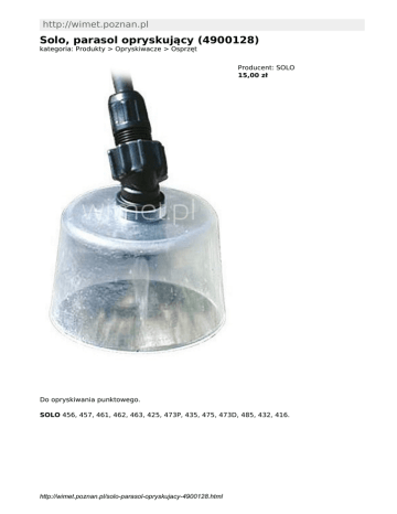http://wimet.poznan.pl Solo, parasol opryskujący (4900128) kategoria: Produkty > Opryskiwacze > Osprzęt Producent: SOLO 15,00 zł Do opryskiwania punktowego. SOLO 456, 457, 461, 462, 463, 425, 473P, 435, 475, 473D, 485, 432, 416. http://wimet.poznan.pl/solo-parasol-opryskujacy-4900128.html