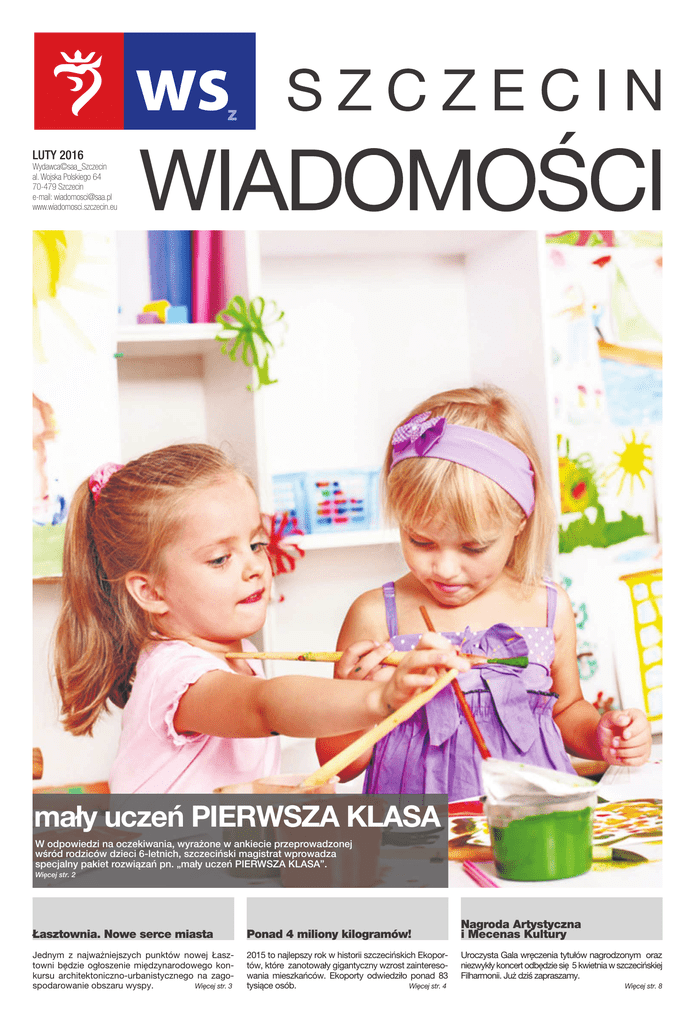 LUTY 2016 Wydawca©saa_Szczecin al. Wojska Polskiego 64 70-479 Szczecin e-mail: [email protected] www.wiadomosci.szczecin.eu mały uczeń PIERWSZA KLASA W odpowiedzi na oczekiwania, wyrażone w ankiecie przeprowadzonej wśród rodziców dzieci 6-letnich, szczeciński magistrat wprowadza specjalny pakiet rozwiązań pn. „mały uczeń PIERWSZA KLASA”. Więcej str. 2 Łasztownia. Nowe serce miasta Ponad 4 miliony kilogramów! Jednym z najważniejszych punktów nowej Łasztowni będzie ogłoszenie międzynarodowego konkursu architektoniczno-urbanistycznego na zagoWięcej str. 3 spodarowanie obszaru wyspy. 2015 to najlepszy rok w historii szczecińskich Ekoportów, które zanotowały gigantyczny wzrost zainteresowania mieszkańców. Ekoporty odwiedziło ponad 83 Więcej str. 4 tysiące osób. Nagroda Artystyczna i Mecenas Kultury Uroczysta Gala wręczenia tytułów nagrodzonym oraz niezwykły koncert odbędzie się 5 kwietnia w szczecińskiej Filharmonii. Już dziś zapraszamy. Więcej str. 8 2 SZCZECIN wzs luty 2016 www.wiadomosci.szczecin.eu Aktualności mały uczeń PIERWSZA KLASA W odpowiedzi na oczekiwania, wyrażone w ankiecie przeprowadzonej wśród rodziców dzieci 6-letnich, Urząd Miasta Szczecin wprowadza specjalny pakiet rozwiązań pn. „mały uczeń PIERWSZA KLASA”. Ostatnia reforma systemu oświaty w Polsce, zniosła obowiązek szkolny dla dzieci 6-letnich. Dziś, to właśnie rodzice podejmą decyzję, czy w zbliżającym się roku szkolnym 2016/2017 ich 6-letnie dziecko rozpocznie naukę w pierwszej klasie szkoły podstawowej, będzie uczęszczało do oddziału „0” działającego przy szkole czy też pozostanie na kolejny rok w przedszkolu. » Pakiet rozwiązań „mały uczeń PIERWSZA KLASA” to konkretne działania, które mają na celu podniesienie atrakcyjności szczecińskich szkół podstawowych. Wielu rodziców ma jednak wątpliwości dotyczące tego, jaka droga będzie najlepsza dla ich dziecka. Chcąc je rozwiać, Urząd Miasta przygotował specjalny pakiet rozwiązań. Dzięki niemu, rodzice najmłodszych mieszkańców Szczecina, będą mogli m.in. zapoznać się z opiniami specjalistów, zobaczyć jak funkcjonują szczecińskie szkoły podstawowe oraz sprawdzić jak jest sprawowana opieka nad najmłodszymi uczniami w szkole. Szczecińskie szkoły podstawowe są dobrze przygotowane na przyjęcie zarówno 6-, jak i 7-latków. Ten niewątpliwie ogromny atut, pozwala nam dziś śmiało zachęcać rodziców do tego aby swoje pociechy posyłali właśnie do I klasy. Jednocześnie szanujemy to, że jest to indywidualna decyzja każdego opiekuna dziecka 6-letniego – powiedział prezydent Piotr Krzystek. – Mamy świadomość, że rodzice będą podejmowali różne decyzje odnośnie ścieżki edukacyjnej ich dziecka. To właśnie dlatego jakiś czas temu podjęliśmy decyzję o przeprowadzeniu ankiet wśród rodziców. W odpowiedzi na obawy i oczekiwania w niej wyrażone przygotowaliśmy pakiet działań, który ma przede wszystkim pomóc w podjęciu tej ważnej decyzji – dodał prezydent miasta. Pakiet rozwiązań „mały uczeń PIERWSZA KLASA”, wprowadzony w odpowiedzi na obawy i oczekiwania, które wyrażali rodzice 6-latków, to konkretne działania, które mają na celu podniesienie atrakcyjności szczecińskich szkół podstawowych oraz zapewnienie najmłodszym mieszkańcom naszego miasta możliwie najlepszej opieki. W pakiecie znalazły się między innymi takie rozwiązania jak: • serwis www dedykowany rodzicom 6-latków, • materiały informacyjno-promocyjne, • Dni Przedszkolaka i Dni Otwarte organizowane w szkołach podstawowych, • spotkania ze specjalistami, • czat dla rodziców, • organizacja punktów konsultacyjnych w poradniach psychologiczno-pedagogicznych. Decyzją prezydenta Szczecina, w odpowiedzi na oczekiwania rodziców, wyrażone w ankiecie przeprowadzonej w dn. 29 I – 5 II br., wprowadzone zostają również: • całodzienne wychowanie i opieka dla dzieci 6- i 7-letnich w formie oddzielnych świetlic, • opieka organizowana podczas dni wolnych od zajęć (ferie, wakacje), • zajęcia korekcyjno-kompensacyjne dla uczniów klas pierwszych, • pakiet nieodpłatnych dodatkowych zajęć dla najmłodszych (10 godzin/ tyg.na każdy oddział kl. I), • pakiet adaptacyjny dla uczniów klas pierwszych, • Serwis 6-latka, • Zwiększenie zatrudnienia specjalistów: pedagogów i logopedów. Wszelkie szczegółowe informacje dotyczące pakietu rozwiązań „mały uczeń PIERWSZA KLASA”, w tym m.in.: wyniki ankiet, harmonogram dni otwartych szkół podstawowych oraz odpowiedzi na najczęściej zadawane pytania, znajdują się na łamach serwisu: www.6latki.szczecin.pl Stypendia prezydenta – XII edycja Do 10 marca można składać wnioski o stypendium dla najzdolniejszych studentów i doktorantów. Program stypendialny prezydenta Szczecina to jeden z instrumentów realizacji Polityki wspierania rozwoju nauki i szkolnictwa wyższego. Ma za zadanie nieść pomoc w pozyskaniu dla miasta i szczecińskiego śro- dowiska naukowego kadr naukowych oraz zapobiegać odpływowi z jego terenu młodych ludzi. Program funkcjonuje od października 2010 roku. Stypendia otrzymało ponad 190 studentów i doktorantów, reprezentujących preferowane dyscypliny naukowe, dziedziny sztuki i kierunki kształcenia absolwentów szkół wyższych i naukowców. Wysokość stypendium dla studenta wynosi: 1 000 zł brutto w pierwszym roku pobierania stypendium, 1 200 zł – w drugim i 1 400 zł – w trzecim. Natomiast stypendium dla doktoranta to 3 000 zł brutto. Wnioski o stypendium naukowe należy składać w Urzędzie Miasta Szczecin, w Biurze Strategii, pok. 407, pl. Armii Krajowej 1 (IV piętro, skrzydło Urzędu Miasta przy ul. Odrowąża). Program stypendialny wpisuje się w działania związane z projektem Akademicki Szczecin realizowanym przez Miasto Szczecin wspólnie z uczelniami wyższymi. Celem projektu jest wsparcie działań na rzecz