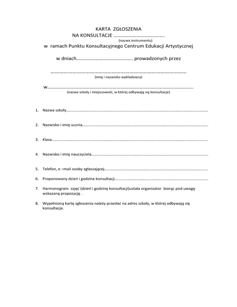 KARTA ZGŁOSZENIA NA KONSULTACJE …………………………………. (nazwa instrumentu) w ramach Punktu Konsultacyjnego Centrum Edukacji Artystycznej w dniach…………………………………….. prowadzonych przez ………………………………………………………………………………… (imię i nazwisko wykładowcy) w…………………………………………………………………………………………………… (nazwa szkoły i miejscowość, w której odbywają się konsultacje) 1. Nazwa szkoły…………………………………………………………………………………………………………………………… 2. Nazwisko i imię ucznia…………………………………………………………………………………………………………….. 3. Klasa……………………………………………………………………………………………………………………………………….. 4. Nazwisko i imię nauczyciela…………………………………………………………………………………………………….. 5. Telefon, e –mail osoby zgłaszającej…………………………………………………………………………………………. 6. Proponowany dzień i godzina konsultacji………………………………………………………………………………… 7. Harmonogram zajęć (dzień i godzinę konsultacji)ustala organizator biorąc pod uwagę wskazaną propozycję . 8. Wypełnioną kartę zgłoszenia należy przesłać na adres szkoły, w której odbywają się konsultacje.