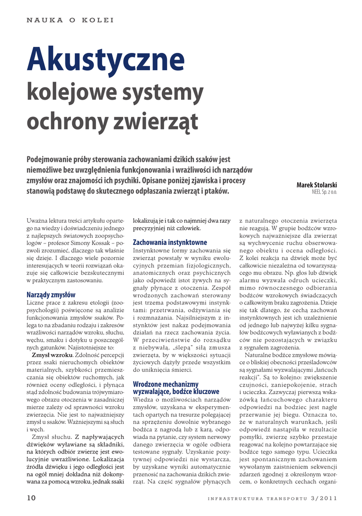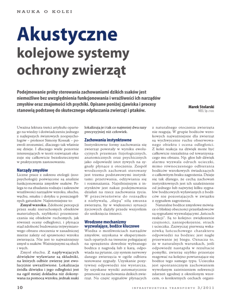 nauka o kolei Akustyczne kolejowe systemy ochrony zwierząt Podejmowanie próby sterowania zachowaniami dzikich ssaków jest niemożliwe bez uwzględnienia funkcjonowania i wrażliwości ich narządów zmysłów oraz znajomości ich psychiki. Opisane poniżej zjawiska i procesy stanowią podstawę do skutecznego odpłaszania zwierząt i ptaków. Uważna lektura treści artykułu opartego na wiedzy i doświadczeniu jednego z najlepszych światowych zoopsychologów – profesor Simony Kossak – pozwoli zrozumieć, dlaczego tak właśnie się dzieje. I dlaczego wiele pozornie interesujących w teorii rozwiązań okazuje się całkowicie bezskutecznymi w praktycznym zastosowaniu. Narządy zmysłów Liczne prace z zakresu etologii (zoopsychologii) poświęcone są analizie funkcjonowania zmysłów ssaków. Polega to na zbadaniu rodzaju i zakresów wrażliwości narządów wzroku, słuchu, węchu, smaku i dotyku u poszczególnych gatunków. Najistotniejsze to: Zmysł wzroku. Zdolność percepcji przez ssaki nieruchomych obiektów materialnych, szybkości przemieszczania się obiektów ruchomych, jak również oceny odległości, i płynąca stąd zdolność budowania trójwymiarowego obrazu otoczenia w zasadniczej mierze zależy od sprawności wzroku zwierzęcia. Nie jest to najważniejszy zmysł u ssaków. Ważniejszymi są słuch i węch. Zmysł słuchu. Z napływających dźwięków wyławiane są składniki, na których odbiór zwierzę jest ewolucyjnie uwrażliwione. Lokalizacja źródła dźwięku i jego odległości jest na ogół mniej dokładna niż dokonywana za pomocą wzroku, jednak ssaki 10 lokalizują je i tak co najmniej dwa razy precyzyjniej niż człowiek. Zachowania instynktowne Instynktowne formy zachowania się zwierząt powstały w wyniku ewolucyjnych przemian fizjologicznych, anatomicznych oraz psychicznych jako odpowiedź istot żywych na sygnały płynące z otoczenia. Zespół wrodzonych zachowań sterowany jest trzema podstawowymi instynktami: przetrwania, odżywiania się i rozmnażania. Najsilniejszym z instynktów jest nakaz podejmowania działań na rzecz zachowania życia. W przeciwieństwie do rozsądku z niebywałą, „ślepą” siłą zmusza zwierzęta, by w większości sytuacji życiowych dążyły przede wszystkim do uniknięcia śmierci. Wrodzone mechanizmy wyzwalające, bodźce kluczowe Wiedza o możliwościach narządów zmysłów, uzyskana w eksperymentach opartych na tresurze polegającej na sprzężeniu dowolnie wybranego bodźca z nagrodą lub z karą, odpowiada na pytanie, czy system nerwowy danego zwierzęcia w ogóle odbiera testowane sygnały. Uzyskanie pozytywnej odpowiedzi nie wystarcza, by uzyskane wyniki automatycznie przenosić na zachowania dzikich zwierząt. Na część sygnałów płynących Marek Stolarski NEEL Sp. z o.o. z naturalnego otoczenia zwierzęta nie reagują. W grupie bodźców wzrokowych najważniejsze dla zwierząt są wychwycenie ruchu obserwowanego obiektu i ocena odległości. Z kolei reakcja na dźwięk może być całkowicie niezależna od towarzyszącego mu obrazu. Np. głos lub dźwięk alarmu wyzwala odruch ucieczki, mimo równoczesnego odbierania bodźców wzrokowych świadczących o całkowitym braku zagrożenia. Dzieje się tak dlatego, że cechą zachowań instynktownych jest ich uzależnienie od jednego lub najwyżej kilku sygnałów bodźcowych wyławianych z bodźców nie pozostających w związku z sygnałem zagrożenia. Naturalne bodźce zmysłowe mówiące o bliskiej obecności prześladowców są sygnałami wyzwalającymi „łańcuch reakcji”. Są to kolejno: zwiększenie czujności, zaniepokojenie, strach i ucieczka. Zazwyczaj pierwszą wskazówką łańcuchowego charakteru odpowiedzi na bodziec jest nagłe przerwanie jej biegu. Oznacza to, że w naturalnych warunkach, jeśli odpowiedź nastąpiła w rezultacie pomyłki, zwierzę szybko przestaje reagować na kolejno powtarzające się bodźce tego samego typu. Ucieczka jest spontanicznym zachowaniem wywołanym zaistnieniem sekwencji zdarzeń zgodnej z określonym wzorcem, o konkretnych cechach organi- infrastruktura transportu 3/2011 nauka zacyjnych (np. naprzemienna seria dźwięków, obrazów, zapachów, drgań itp. towarzyszących nadejściu wroga lub katastrofy naturalnej). I w taki właśnie sposób musi działać na zwierzęta wytworzona przez człowieka symulacja rzeczywistego zagrożenia. Wyzwalacze socjalne i międzygatunkowe Całościowo rozumiany odbiór bodźców nie tylko wyzwala reakcję, ale także ukierunkowuje ją w zależności od charakterystyki otoczenia. W przypadku odruchu ucieczki na otwartej przestrzeni zawsze jest to oddalanie się od źródła sygnałów, a w przypadku zwierząt leśnych szybkie – opuszczenie otwartej przestrzeni i dążenie do ukrycia się pod osłoną roślinności. Wiele reakcji wrodzonych wyzwalanych jest bodźcami o walorze ostrzegawczym wysyłanymi przez bardziej doświadczone, najczujniejsze lub wrażliwsze osobniki. Wiele gatunków zwierząt wydaje różne okrzyki alarmu: jeden na widok drapieżnika, który jeszcze nie atakuje, ale stanowi potencjalne zagrożenie, drugi w przypadku nagłego ataku. Reakcją grupową na pierwszy jest podwyższenie czujności, reakcją na drugi –szybkie oddalenie się wszystkich osobników od źródła zagrożenia lub szukanie dogodnego schronienia. Podsumowując, należy stwierdzić, że sygnał stanowiący wyzwalacz socjalny lub międzygatunkowy podany przez najbardziej spostrzegawcze zwierzę wyzwala reakcję kolejnych osobników tego samego lub innego gatunku. „Nadnormalne” bodźce kluczowe Badając wartości wyzwalające, jakie niesie każdy bodziec zmysłowy, mamy do czynienia z występowaniem jego zmiennych wartości progowych. Zmienność ta wynika: –ze zmiany intensywności innych bodźców zewnętrznych, –ze zmiany intensywności działania czynników wewnętrznych, –z obu czynników łącznie. Jedynym zachowaniem instynktownym, które nie ma z