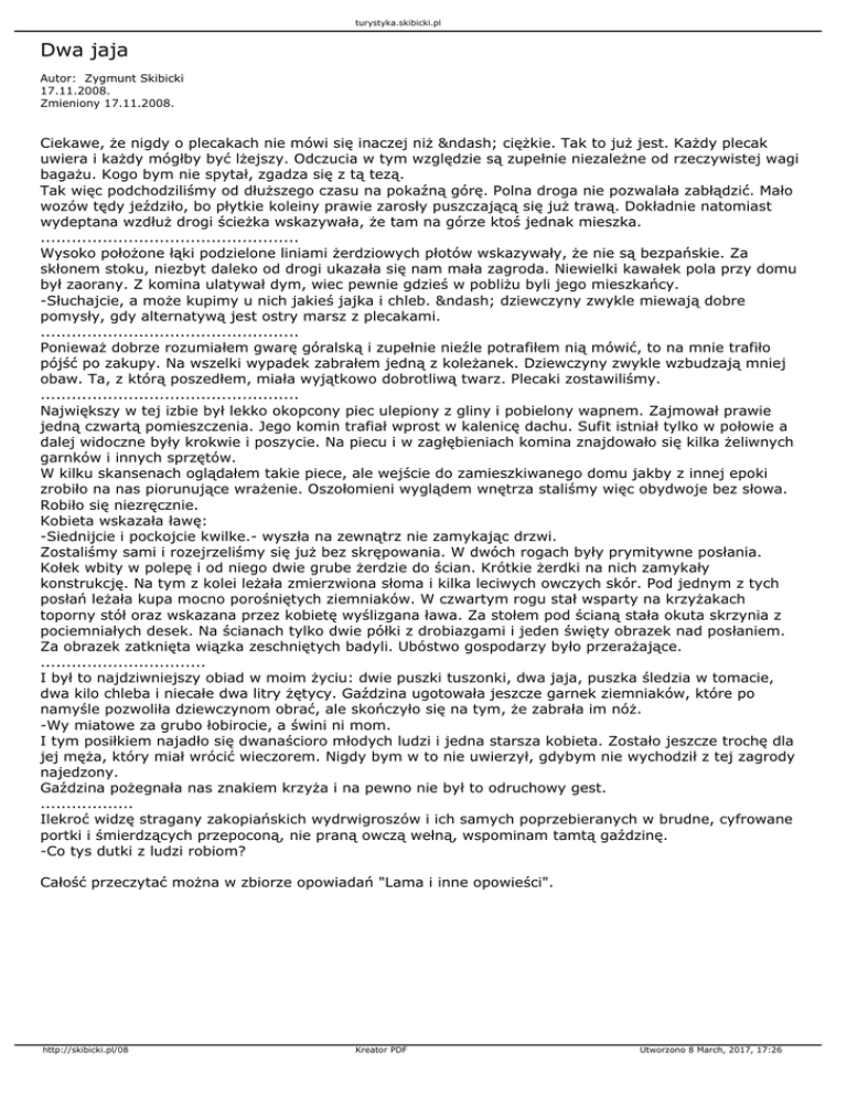 turystyka.skibicki.pl Dwa jaja Autor: Zygmunt Skibicki 17.11.2008. Zmieniony 17.11.2008. Ciekawe, że nigdy o plecakach nie mówi się inaczej niż – ciężkie. Tak to już jest. Każdy plecak uwiera i każdy mógłby być lżejszy. Odczucia w tym względzie są zupełnie niezależne od rzeczywistej wagi bagażu. Kogo bym nie spytał, zgadza się z tą tezą. Tak więc podchodziliśmy od dłuższego czasu na pokaźną górę. Polna droga nie pozwalała zabłądzić. Mało wozów tędy jeździło, bo płytkie koleiny prawie zarosły puszczającą się już trawą. Dokładnie natomiast wydeptana wzdłuż drogi ścieżka wskazywała, że tam na górze ktoś jednak mieszka. .................................................. Wysoko położone łąki podzielone liniami żerdziowych płotów wskazywały, że nie są bezpańskie. Za skłonem stoku, niezbyt daleko od drogi ukazała się nam mała zagroda. Niewielki kawałek pola przy domu był zaorany. Z komina ulatywał dym, wiec pewnie gdzieś w pobliżu byli jego mieszkańcy. -Słuchajcie, a może kupimy u nich jakieś jajka i chleb. – dziewczyny zwykle miewają dobre pomysły, gdy alternatywą jest ostry marsz z plecakami. .................................................. Ponieważ dobrze rozumiałem gwarę góralską i zupełnie nieźle potrafiłem nią mówić, to na mnie trafiło pójść po zakupy. Na wszelki wypadek zabrałem jedną z koleżanek. Dziewczyny zwykle wzbudzają mniej obaw. Ta, z którą poszedłem, miała wyjątkowo dobrotliwą twarz. Plecaki zostawiliśmy. .................................................. Największy w tej izbie był lekko okopcony piec ulepiony z gliny i pobielony wapnem. Zajmował prawie jedną czwartą pomieszczenia. Jego komin trafiał wprost w kalenicę dachu. Sufit istniał tylko w połowie a dalej widoczne były krokwie i poszycie. Na piecu i w zagłębieniach komina znajdowało się kilka żeliwnych garnków i innych sprzętów. W kilku skansenach oglądałem takie piece, ale wejście do zamieszkiwanego domu jakby z innej epoki zrobiło na nas piorunujące wrażenie. Oszołomieni wyglądem wnętrza staliśmy więc obydwoje bez słowa. Robiło się niezręcznie. Kobieta wskazała ławę: -Siednijcie i pockojcie kwilke.- wyszła na zewnątrz nie zamykając drzwi. Zostaliśmy sami i rozejrzeliśmy się już bez skrępowania. W dwóch rogach były prymitywne posłania. Kołek wbity w polepę i od niego dwie grube żerdzie do ścian. Krótkie żerdki na nich zamykały konstrukcję. Na tym z kolei leżała zmierzwiona słoma i kilka leciwych owczych skór. Pod jednym z tych posłań leżała kupa mocno porośniętych ziemniaków. W czwartym rogu stał wsparty na krzyżakach toporny stół oraz wskazana przez kobietę wyślizgana ława. Za stołem pod ścianą stała okuta skrzynia z pociemniałych desek. Na ścianach tylko dwie półki z drobiazgami i jeden święty obrazek nad posłaniem. Za obrazek zatknięta wiązka zeschniętych badyli. Ubóstwo gospodarzy było przerażające. ................................ I był to najdziwniejszy obiad w moim życiu: dwie puszki tuszonki, dwa jaja, puszka śledzia w tomacie, dwa kilo chleba i niecałe dwa litry żętycy. Gaździna ugotowała jeszcze garnek ziemniaków, które po namyśle pozwoliła dziewczynom obrać, ale skończyło się na tym, że zabrała im nóż. -Wy miatowe za grubo łobirocie, a świni ni mom. I tym posiłkiem najadło się dwanaścioro młodych ludzi i jedna starsza kobieta. Zostało jeszcze trochę dla jej męża, który miał wrócić wieczorem. Nigdy bym w to nie uwierzył, gdybym nie wychodził z tej zagrody najedzony. Gaździna pożegnała nas znakiem krzyża i na pewno nie był to odruchowy gest. .................. Ilekroć widzę stragany zakopiańskich wydrwigroszów i ich samych poprzebieranych w brudne, cyfrowane portki i śmierdzących przepoconą, nie praną owczą wełną, wspominam tamtą gaździnę. -Co tys dutki z ludzi robiom? Całość przeczytać można w zbiorze opowiadań "Lama i inne opowieści". http://skibicki.pl/08 Kreator PDF Utworzono 8 March, 2017, 17:26