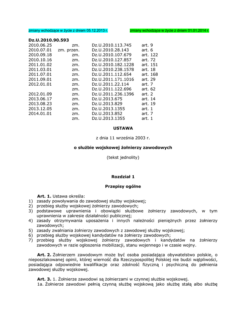 zmiany wchodzące w życie z dniem 05.12.2013 r. Dz.U.2010.90.593 2010.06.25 zm. 2010.07.01 zm. przen. 2010.09.18 zm. 2010.10.16 zm. 2011.01.02 zm. 2011.03.01 zm. 2011.07.01 zm. 2011.09.01 zm. 2012.01.01 zm. zm. 2012.01.09 zm. 2013.06.17 zm. 2013.08.23 zm. 2013.12.05 zm. 2014.01.01 zm. zm. zmiany wchodzące w życie z dniem 01.01.2014 r. Dz.U.2010.113.745 Dz.U.2010.28.143 Dz.U.2010.107.679 Dz.U.2010.127.857 Dz.U.2010.182.1228 Dz.U.2010.238.1578 Dz.U.2011.112.654 Dz.U.2011.171.1016 Dz.U.2011.22.114 Dz.U.2011.122.696 Dz.U.2011.236.1396 Dz.U.2013.675 Dz.U.2013.829 Dz.U.2013.1355 Dz.U.2013.852 Dz.U.2013.1355 art. art. art. art. art. art. art. art. art. art. art. art. art. art. art. art. 9 6 122 72 151 18 168 29 7 62 2 14 19 1 7 1 USTAWA z dnia 11 września 2003 r. o służbie wojskowej żołnierzy zawodowych (tekst jednolity) Rozdział 1 Przepisy ogólne Art. 1. Ustawa określa: 1) zasady powoływania do zawodowej służby wojskowej; 2) przebieg służby wojskowej żołnierzy zawodowych; 3) podstawowe uprawnienia i obowiązki służbowe żołnierzy zawodowych, w tym uprawnienia w zakresie działalności publicznej; 4) zasady otrzymywania uposażenia i innych należności pieniężnych przez żołnierzy zawodowych; 5) zasady zwalniania żołnierzy zawodowych z zawodowej służby wojskowej; 6) przebieg służby wojskowej kandydatów na żołnierzy zawodowych; 7) przebieg służby wojskowej żołnierzy zawodowych i kandydatów na żołnierzy zawodowych w razie ogłoszenia mobilizacji, stanu wojennego i w czasie wojny. Art. 2. Żołnierzem zawodowym może być osoba posiadająca obywatelstwo polskie, o nieposzlakowanej opinii, której wierność dla Rzeczypospolitej Polskiej nie budzi wątpliwości, posiadająca odpowiednie kwalifikacje oraz zdolność fizyczną i psychiczną do pełnienia zawodowej służby wojskowej. Art. 3. 1. Żołnierze zawodowi są żołnierzami w czynnej służbie wojskowej. 1a. Żołnierze zawodowi pełnią czynną służbę wojskową jako służbę stałą albo służbę kontraktową. 2. Żołnierze zawodowi pełnią zawodową służbę wojskową dla dobra Rzeczypospolitej Polskiej. Służba ta wymaga zdyscyplinowania, lojalności i poświęcenia. 3. Państwo zapewnia żołnierzom zawodowym godne warunki życia, umożliwiające oddanie się służbie Narodowi i Ojczyźnie, rekompensując odpowiednio trud, ograniczenia i wyrzeczenia związane z pełnieniem zawodowej służby wojskowej. Art. 4. 1. Żołnierze zawodowi stanowią kadrę zawodową Sił Zbrojnych Rzeczypospolitej Polskiej, zwanych dalej "Siłami Zbrojnymi". 2. (1) Kadra zawodowa Sił Zbrojnych dzieli się na: 1) korpus oficerów zawodowych;, do którego zalicza się: a) oficerów młodszych, b) oficerów starszych, c) generałów i admirałów; 2) korpus podoficerów zawodowych, do którego zalicza się: a) podoficerów młodszych, b) podoficerów, 2) korpus podoficerów zawodowych; c) podoficerów starszych; 3) korpus szeregowych zawodowych. 3. Korpusy oficerów zawodowych, podoficerów zawodowych i szeregowych zawodowych dzielą się na korpusy osobowe. Korpusy osobowe dzielą się na grupy osobowe, w których występuje podział na specjalności wojskowe. 4. Rada Ministrów określi, w drodze rozporządzenia, liczbę stanowisk służbowych w poszczególnych korpusach kadry zawodowej Sił Zbrojnych, uwzględniając strukturę Sił Zbrojnych. 4. (2) (uchylony). 5. Minister Obrony Narodowej, w drodze rozporządzenia, tworzy i znosi korpusy osobowe, ustala ich podział na grupy osobowe i specjalności wojskowe, zapewniając zaspokojenie potrzeb Sił Zbrojnych. 6. (uchylony). Art. 5. 1. Zdolność fizyczną i psychiczną do pełnienia zawodowej służby wojskowej ustala wojskowa komisja lekarska, która wydaje w tej sprawie orzeczenie. Orzeczenie wojskowej komisji lekarskiej jest decyzją. 1a. (3) Od orzeczenia wojskowej komisji lekarskiej przysługuje odwołanie do wojskowej komisji lekarskiej wyższego stopnia. 1b. (4) Członek składu orzekającego wojskowej komisji lekarskiej może zgłosić na piśmie sprzeciw wobec projektu orzeczenia wojskowej komisji lekarskiej. 2. Do wojskowej komisji lekarskiej kieruje się: 1) żołnierza zawodowego - z urzędu albo na jego wniosek; 2) żołnierza i inną osobę, która zgłosiła chęć pełnienia zawodowej służby wojskowej - z urzędu. 3. Do wojskowej komisji lekarskiej kieruje się z urzędu żołnierzy zawodowych: 1) gdy nie wykonują zadań służbowych z powodu choroby trwającej nieprzerwanie przez trzy miesiące; 2) jeżeli w ich stanie zdrowia nastąpiło pogorszenie uniemożliwiające lub utrudniające wykonywanie zadań służbowych; 3) gdy ulegli wypadkom pozostającym w związku z pełnieniem zawodowej służby wojskowej lub u których została stwierdzona choroba powstała w związku ze szczególnymi właściwościami lub warunkami służby wojskowej; 4) w celu przeprowadzenia okresowych lub okolicznościowych badań lekarskich - jeżeli zaliczeni zostali do określonych grup osobowych; 5) przed skierowaniem do pełnienia zawodowej służby wojskowej poza granicami państwa oraz po powrocie do kraju; 6) jeżeli orzeczenie wojskowej komisji lekarskiej jest niezbędne w postępowaniu karnym lub w sprawach o wykroczenia; 7) (uchylony). 3a. (5) Przepisu ust. 3 pkt 1 nie stosuje się do żołnierzy - kobiet ciężarnych. 4. Do wojskowej komisji lekarskiej można skierować z urzędu żołnierza zawodowego również w innych niż wymienione w ust. 3 przypadkach uzasadnionych potrzebami Sił Zbrojnych, w tym w szczególności: 1) przed wyznaczeniem na stanowisko służbowe; 2) w związku z przeniesieniem do innego korpusu osobowego albo innej grupy osobowej; 3) przed zwolnieniem z zawodowej służby wojskowej z przyczyn innych niż ze względu na stan zdrowia; 4) gdy nie przystąpił w nakazanym terminie do sprawdzianu sprawności fizycznej lub gdy otrzymał ze sprawdzianu sprawności fizycznej ocenę niedostateczną. 5. Do wojskowej komisji lekarskiej kieru