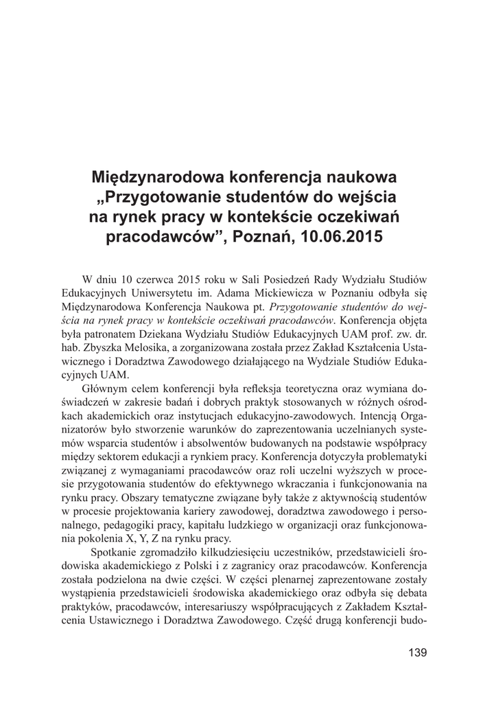 Międzynarodowa konferencja naukowa „Przygotowanie studentów… Międzynarodowa konferencja naukowa „Przygotowanie studentów do wejścia na rynek pracy w kontekście oczekiwań pracodawców”, Poznań, 10.06.2015 W dniu 10 czerwca 2015 roku w Sali Posiedzeń Rady Wydziału Studiów Edukacyjnych Uniwersytetu im. Adama Mickiewicza w Poznaniu odbyła się Międzynarodowa Konferencja Naukowa pt. Przygotowanie studentów do wejścia na rynek pracy w kontekście oczekiwań pracodawców. Konferencja objęta była patronatem Dziekana Wydziału Studiów Edukacyjnych UAM prof. zw. dr. hab. Zbyszka Melosika, a zorganizowana została przez Zakład Kształcenia Ustawicznego i Doradztwa Zawodowego działającego na Wydziale Studiów Edukacyjnych UAM. Głównym celem konferencji była refleksja teoretyczna oraz wymiana doświadczeń w zakresie badań i dobrych praktyk stosowanych w różnych ośrodkach akademickich oraz instytucjach edukacyjno-zawodowych. Intencją Organizatorów było stworzenie warunków do zaprezentowania uczelnianych systemów wsparcia studentów i absolwentów budowanych na podstawie współpracy między sektorem edukacji a rynkiem pracy. Konferencja dotyczyła problematyki związanej z wymaganiami pracodawców oraz roli uczelni wyższych w procesie przygotowania studentów do efektywnego wkraczania i funkcjonowania na rynku pracy. Obszary tematyczne związane były także z aktywnością studentów w procesie projektowania kariery zawodowej, doradztwa zawodowego i personalnego, pedagogiki pracy, kapitału ludzkiego w organizacji oraz funkcjonowania pokolenia X, Y, Z na rynku pracy. Spotkanie zgromadziło kilkudziesięciu uczestników, przedstawicieli środowiska akademickiego z Polski i z zagranicy oraz pracodawców. Konferencja została podzielona na dwie części. W części plenarnej zaprezentowane zostały wystąpienia przedstawicieli środowiska akademickiego oraz odbyła się debata praktyków, pracodawców, interesariuszy współpracujących z Zakładem Kształcenia Ustawicznego i Doradztwa Zawodowego. Część drugą konferencji budo139 SPRAWOZDANIA I INFORMACJE wały cztery sekcje tematyczne, zatytułowane następująco: Rynek pracy, Student, Uniwersytet – absolwent oraz Pracodawca a orientacje zawodowe studentów. Gości przywitała prof. zw. dr hab. Ewa Solarczyk-Ambrozik, podkreślając aktualność oraz wagę podejmowanej tematyki. Zwróciła uwagę na duże znaczenie organizacji konferencji skupiającej wokół siebie jednocześnie środowisko akademickie i pracodawców, gdyż umożliwia to podjęcie autentycznego dialogu oraz budowanie partnerstwa i poszerzanie zakresów współdziałania. Przybliżyła również kluczowe sukcesy odnoszące się do przebiegu dotychczasowej współpracy Zakładu Kształcenia Ustawicznego i Doradztwa Zawodowego z lokalnymi pracodawcami, dziękując im tym samym za wykazywaną otwartość i zaangażowanie. Następnie konferencję otworzył Dziekan WSE UAM prof. zw. dr hab. Zbyszko Melosik, który zwrócił uwagę na potrzebę planowania kariery zawodowej w kontekście dynamicznie zmieniającej się i niejednoznacznej rzeczywistości, zwłaszcza przez osoby młode, kończące edukację i wkraczające na rynek z małym doświadczeniem zawodowym. Pan Dziekan podkreślił również aktualność i wagę podejmowanej tematyki, zwłaszcza w odniesieniu do roli uczelni, która przygotowuje absolwentów do wchodzenia nie tylko w role zawodowe, ale także społeczne i rodzinne, jako samodzielne, świadome jednostki, zdolne do pogłębionej refleksyjności i odpowiedzialności za podjęte decyzje. W pierwszej części plenarnej moderowanej przez dr Monikę Bartkowiak prelegenci skupili się na tematyce związanej z kategoriami szans i możliwościami planowania kariery w kontekście teorii rozwoju zawodowego oraz praktyki poradniczej. Dokonano także próby analizy oczekiwań pracodawców względem absolwentów uczelni wyższych, opierając się na analizie przeprowadzonych wywiadów i doświadczeń przedsiębiorców. Podkreślano kwestie wielogeneracyjnego środowiska zawodowego, wskazując na cechy pracowników i postawy wobec pracy pokolenia X, Y, Z. W tym obszarze zwrócono szczególną uwagę na cechy pokolenia Z przejawiające się w postawach roszczeniowych, narcystycznych, nastawionych na realizowanie własnych celów oraz dobre, jakościowe konsumowanie czasu wolnego. Zarysowano profil nowego typu pracownika skupionego na sobie, silnie zindywidualizowanego, który wyznaczać będzie nowe trendy w zakresie planowania i realizacji kariery zawodowej. W końcowej części obrad plenarnych zaprezentowano wyniki analizy losów absolwentów Uniwersytetu Ekonomicznego w Poznaniu, w których wyraźnie zarysowano tendencję do odraczania momentu zakładania rodziny, pozostawanie w związkach nieformalnych, wydłużanie czasu na zdobywanie doświadczenia i odpowiedniej pozycji zawodowej oraz nadal stosunkowo niskiej mobilności zawodowej. Część druga obrad planarnych moderowana była przez dr Magdalenę Barańską i oscylowała wokół tematów związanych z sytuacją studentów i absolwentów na rynku pracy. Prelegenci skupiali się na obszarach związanych z kształ140 Międzynarodowa konferencja naukowa „Przygotowanie studentów… towaniem postaw przedsiębiorczych wśród studentów w kontekście nie tylko efektywnego wchodzenia na rynek pracy, ale przygotowania do funkcjonowania w dynamicznie zmieniającej się rzeczywistości. Zwrócono uwagę na rolę wykładowcy w procesie kształcenia młodego pokolenia oraz konieczność wprowadzenia zmian do programów nauczania na uczelniach wyższych. W tej części obrad podkreślono także znaczenie umiejętności związanych z kreowaniem swojego miejsca pracy, wykorzystywaniem nadarzających się pozytywnych okazji oraz inwestowania w rozwój zarówno zawodowy, jak i osobisty. Po zaprezentowanych referatach odbyła się dyskusja, w której brali udział głównie prelegenci sesji ple