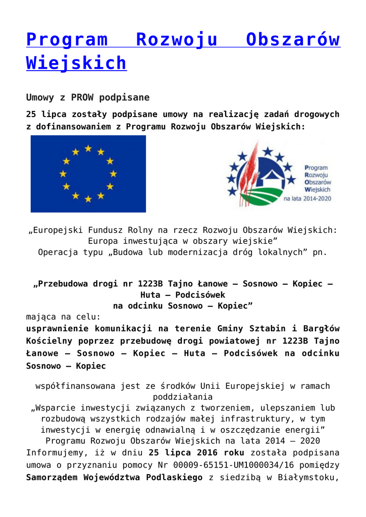 Program Rozwoju Wiejskich Obszarów Umowy z PROW podpisane 25 lipca zostały podpisane umowy na realizację zadań drogowych z dofinansowaniem z Programu Rozwoju Obszarów Wiejskich: „Europejski Fundusz Rolny na rzecz Rozwoju Obszarów Wiejskich: Europa inwestująca w obszary wiejskie” Operacja typu „Budowa lub modernizacja dróg lokalnych” pn. „Przebudowa drogi nr 1223B Tajno Łanowe – Sosnowo – Kopiec – Huta – Podcisówek na odcinku Sosnowo – Kopiec” mająca na celu: usprawnienie komunikacji na terenie Gminy Sztabin i Bargłów Kościelny poprzez przebudowę drogi powiatowej nr 1223B Tajno Łanowe – Sosnowo – Kopiec – Huta – Podcisówek na odcinku Sosnowo – Kopiec współfinansowana jest ze środków Unii Europejskiej w ramach poddziałania „Wsparcie inwestycji związanych z tworzeniem, ulepszaniem lub rozbudową wszystkich rodzajów małej infrastruktury, w tym inwestycji w energię odnawialną i w oszczędzanie energii” Programu Rozwoju Obszarów Wiejskich na lata 2014 – 2020 Informujemy, iż w dniu 25 lipca 2016 roku została podpisana umowa o przyznaniu pomocy Nr 00009-65151-UM1000034/16 pomiędzy Samorządem Województwa Podlaskiego z siedzibą w Białymstoku, 15-888, ul. Kardynała Stefana Wyszyńskiego 1 a Powiatem Augustowskim z siedzibą w Augustowie, 16-300, ul. 3 Maja 29, na realizację zadania: „Przebudowa drogi nr 1223B Tajno Łanowe – Sosnowo – Kopiec – Huta – Podcisówek na odcinku Sosnowo – Kopiec”, w wyniku którego zostanie osiągnięty następujący cel operacji: usprawnienie komunikacji na terenie Gminy Sztabin i Bargłów Kościelny poprzez przebudowę drogi powiatowej nr 1223B Tajno Łanowe – Sosnowo – Kopiec – Huta – Podcisówek na odcinku Sosnowo – Kopiec. Wartość wskaźników, których osiągnięcie jest zakładane w wyniku realizacji operacji (km): Przebudowa drogi – 3,48 km Operacja zostanie zrealizowana w: województwie podlaskim, powiat augustowski, gmina Sztabin, miejscowości: Kopiec, Jaziewo. Wartość przyznanej pomocy ze środków „EFRROW” w formie refundacji: 1 526 958 zł (słownie złotych: jeden milion pięćset dwadzieścia sześć tysięcy dziewięćset pięćdziesiąt osiem), tj. 63,63% poniesionych kosztów kwalifikowalnych operacji. Materiał opracowany przez Powiat Augustowski Instytucja Zarządzająca PROW 2014-2020 – Minister Rolnictwa i Rozwoju Wsi „Europejski Fundusz Rolny na rzecz Rozwoju Obszarów Wiejskich: Europa inwestująca w obszary wiejskie” Operacja typu „Budowa lub modernizacja dróg lokalnych” pn. „Przebudowa odcinka ulicy miejskiej powiatowej nr 2569B ul. Kościelna w Lipsku – od ul. Batorego w stronę Sztabina” mająca na celu: usprawnienie komunikacji na terenie miejscowości Lipsk poprzez przebudowę odcinka ulicy miejskiej powiatowej Nr 2569B ul. Kościelna w Lipsku współfinansowana jest ze środków Unii Europejskiej w ramach poddziałania „Wsparcie inwestycji związanych z tworzeniem, ulepszaniem lub rozbudową wszystkich rodzajów małej infrastruktury, w tym inwestycji w energię odnawialną i w oszczędzanie energii” Programu Rozwoju Obszarów Wiejskich na lata 2014 – 2020 Informujemy, iż w dniu 25 lipca 2016 roku została podpisana umowa o przyznaniu pomocy Nr 00062-65151-UM1000036/16 pomiędzy Samorządem Województwa Podlaskiego z siedzibą w Białymstoku, 15-888, ul. Kardynała Stefana Wyszyńskiego 1 a Powiatem Augustowskim z siedzibą w Augustowie, 16-300, ul. 3 Maja 29, na realizację zadania: „Przebudowa odcinka ulicy miejskiej powiatowej nr 2569B ul. Kościelna w Lipsku – od ul. Batorego w stronę Sztabina”, w wyniku której zostanie osiągnięty następujący cel operacji: usprawnienie komunikacji na terenie miejscowości Lipsk poprzez przebudowę odcinka ulicy miejskiej powiatowej Nr 2569B ul. Kościelna w Lipsku. Wartość wskaźników, których osiągnięcie jest zakładane w wyniku realizacji operacji (km): Przebudowa drogi – 0,33 km Operacja zostanie zrealizowana w: województwie podlaskim, powiat augustowski, Gmina Lipsk, miejscowości: Lipsk Wartość przyznanej pomocy ze środków „EFRROW” w formie refundacji: 380 632 zł (słownie złotych: trzysta osiemdziesiąt tysięcy sześćset trzydzieści dwa), tj. 63,63% poniesionych kosztów kwalifikowalnych operacji. Materiał opracowany przez Powiat Augustowski Instytucja Zarządzająca PROW 2014-2020 – Minister Rolnictwa i Rozwoju Wsi Umowy z PROW podpisane W poniedziałek 25 lipca odbyło się uroczyste podpisanie umów na realizację zadań drogowych z dofinansowaniem z Programu Rozwoju Obszarów Wiejskich pomiędzy samorządem Województwa Podlaskiego a samorządami z północno – wschodniej części województwa podlaskiego: Powiatem Augustowskim, Powiatem Sejneńskim, Gminą Augustów, Miastem i Gminą Lipsk oraz Gminą Krasnopol. W imieniu Zarządu Województwa Podlaskiego umowy podpisali Członkowie Zarządu: Stefan Krajewski i Bogdan Dyjuk. – Realizacja zadań drogowych, na które podpisujemy dzisiaj umowy, z pewnością wpłynie na poprawę sieci dróg i komunikację w regionie – powiedział Bogdan Dyjuk. – Jestem przekonany, że zgodnie z hasłem „Zmieniamy Podlaskie” wspólnie uda się nam zmienić województwo w region bogaty w infrastrukturę, służącą mieszkańcom i przyjezdnym. – Potrzeby modernizacji i budowy dróg lokalnych są bardzo duże – przyznał Stefan Krajewski. – Z pewnością będziemy chcieli uruchomić jeszcze jeden nabór wniosków w ramach PROW, jest to jednak uzależnione od oszczędności powstałych przy wydatkowaniu właśnie przyznanych środków. Powiat Augustowski otrzymał dofinansowanie na realizację dwóch zadań: „Przebudowa drogi nr 1223B Tajno Łanowe – Sosnowo – Kopiec – Huta – Podcisówek na odcinku Sosnowo – Kopiec” oraz „Przebudowa odcinka ulicy miejskiej powiatowej nr 2569B ul. Kościelna w Lipsku – od ul. Batorego w stronę Sztabina”. Umowy w imieniu Powiat