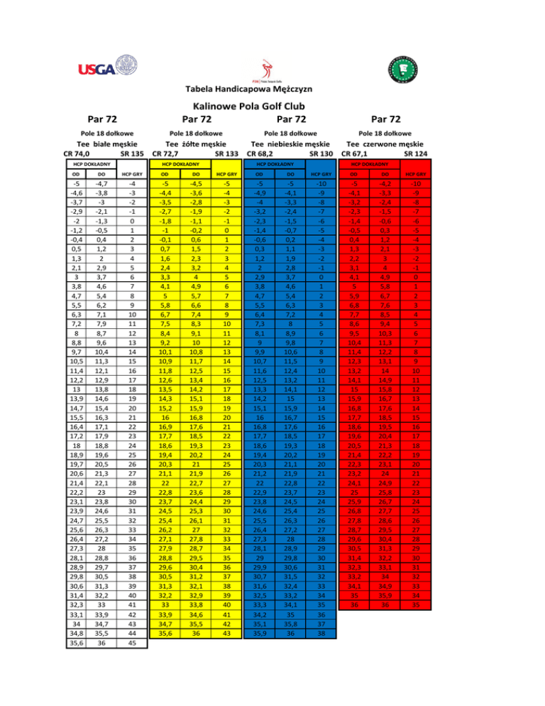 Tabela Handicapowa Mężczyzn Kalinowe Pola Golf Club Par 72 Par 72 Par 72 Pole 18 dołkowe Pole 18 dołkowe Par 72 Pole 18 dołkowe Pole 18 dołkowe Tee białe męskie Tee żółte męskie Tee niebieskie męskie Tee czerwone męskie CR 74,0 SR 135 CR 72,7 SR 133 CR 68,2 SR 130 CR 67,1 SR 124 HCP DOKŁADNY HCP DOKŁADNY HCP DOKŁADNY HCP DOKŁADNY OD DO HCP GRY OD DO HCP GRY OD DO HCP GRY OD DO HCP GRY -5 -4,6 -3,7 -2,9 -2 -1,2 -0,4 0,5 1,3 2,1 3 3,8 4,7 5,5 6,3 7,2 8 8,8 9,7 10,5 11,4 12,2 13 13,9 14,7 15,5 16,4 17,2 18 18,9 19,7 20,6 21,4 22,2 23,1 23,9 24,7 25,6 26,4 27,3 28,1 28,9 29,8 30,6 31,4 32,3 33,1 34 34,8 35,6 -4,7 -3,8 -3 -2,1 -1,3 -0,5 0,4 1,2 2 2,9 3,7 4,6 5,4 6,2 7,1 7,9 8,7 9,6 10,4 11,3 12,1 12,9 13,8 14,6 15,4 16,3 17,1 17,9 18,8 19,6 20,5 21,3 22,1 23 23,8 24,6 25,5 26,3 27,2 28 28,8 29,7 30,5 31,3 32,2 33 33,9 34,7 35,5 36 -4 -3 -2 -1 0 1 2 3 4 5 6 7 8 9 10 11 12 13 14 15 16 17 18 19 20 21 22 23 24 25 26 27 28 29 30 31 32 33 34 35 36 37 38 39 40 41 42 43 44 45 -5 -4,4 -3,5 -2,7 -1,8 -1 -0,1 0,7 1,6 2,4 3,3 4,1 5 5,8 6,7 7,5 8,4 9,2 10,1 10,9 11,8 12,6 13,5 14,3 15,2 16 16,9 17,7 18,6 19,4 20,3 21,1 22 22,8 23,7 24,5 25,4 26,2 27,1 27,9 28,8 29,6 30,5 31,3 32,2 33 33,9 34,7 35,6 -4,5 -3,6 -2,8 -1,9 -1,1 -0,2 0,6 1,5 2,3 3,2 4 4,9 5,7 6,6 7,4 8,3 9,1 10 10,8 11,7 12,5 13,4 14,2 15,1 15,9 16,8 17,6 18,5 19,3 20,2 21 21,9 22,7 23,6 24,4 25,3 26,1 27 27,8 28,7 29,5 30,4 31,2 32,1 32,9 33,8 34,6 35,5 36 -5 -4 -3 -2 -1 0 1 2 3 4 5 6 7 8 9 10 11 12 13 14 15 16 17 18 19 20 21 22 23 24 25 26 27 28 29 30 31 32 33 34 35 36 37 38 39 40 41 42 43 -5 -4,9 -4 -3,2 -2,3 -1,4 -0,6 0,3 1,2 2 2,9 3,8 4,7 5,5 6,4 7,3 8,1 9 9,9 10,7 11,6 12,5 13,3 14,2 15,1 16 16,8 17,7 18,6 19,4 20,3 21,2 22 22,9 23,8 24,6 25,5 26,4 27,3 28,1 29 29,9 30,7 31,6 32,5 33,3 34,2 35,1 35,9 -5 -4,1 -3,3 -2,4 -1,5 -0,7 0,2 1,1 1,9 2,8 3,7 4,6 5,4 6,3 7,2 8 8,9 9,8 10,6 11,5 12,4 13,2 14,1 15 15,9 16,7 17,6 18,5 19,3 20,2 21,1 21,9 22,8 23,7 24,5 25,4 26,3 27,2 28 28,9 29,8 30,6 31,5 32,4 33,2 34,1 35 35,8 36 -10 -9 -8 -7 -6 -5 -4 -3 -2 -1 0 1 2 3 4 5 6 7 8 9 10 11 12 13 14 15 16 17 18 19 20 21 22 23 24 25 26 27 28 29 30 31 32 33 34 35 36 37 38 -5 -4,1 -3,2 -2,3 -1,4 -0,5 0,4 1,3 2,2 3,1 4,1 5 5,9 6,8 7,7 8,6 9,5 10,4 11,4 12,3 13,2 14,1 15 15,9 16,8 17,7 18,6 19,6 20,5 21,4 22,3 23,2 24,1 25 25,9 26,8 27,8 28,7 29,6 30,5 31,4 32,3 33,2 34,1 35 36 -4,2 -3,3 -2,4 -1,5 -0,6 0,3 1,2 2,1 3 4 4,9 5,8 6,7 7,6 8,5 9,4 10,3 11,3 12,2 13,1 14 14,9 15,8 16,7 17,6 18,5 19,5 20,4 21,3 22,2 23,1 24 24,9 25,8 26,7 27,7 28,6 29,5 30,4 31,3 32,2 33,1 34 34,9 35,9 36 -10 -9 -8 -7 -6 -5 -4 -3 -2 -1 0 1 2 3 4 5 6 7 8 9 10 11 12 13 14 15 16 17 18 19 20 21 22 23 24 25 26 27 28 29 30 31 32 33 34 35