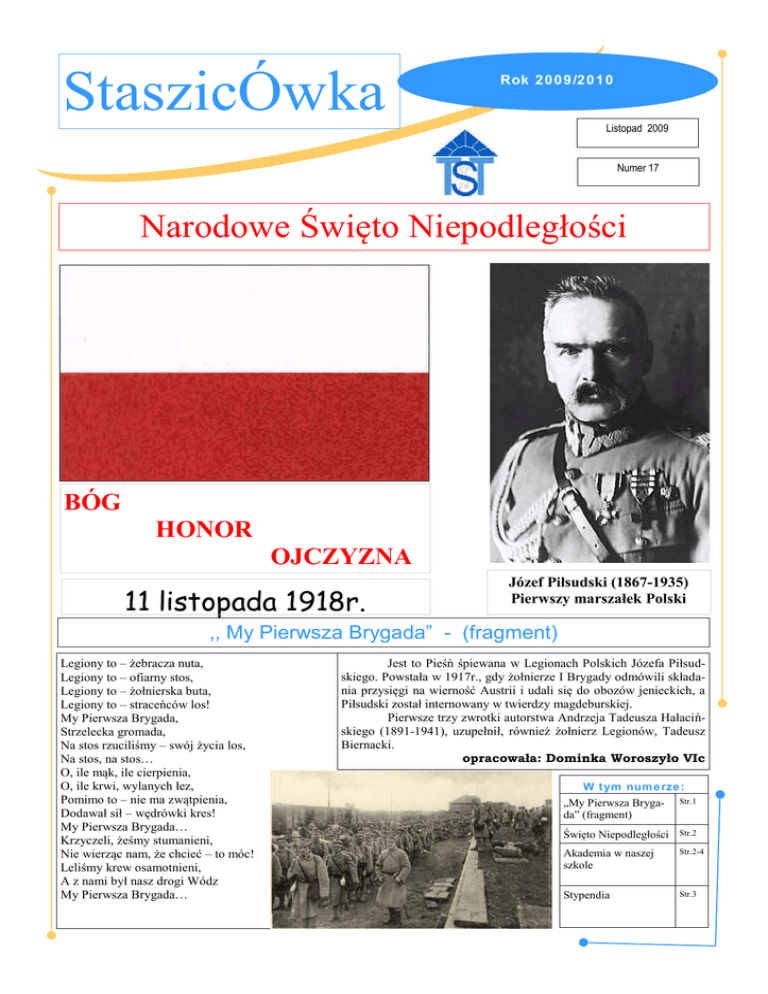 StaszicÓwka Rok 2009/2010 Listopad 2009 Numer 17 Narodowe Święto Niepodległości BÓG HONOR OJCZYZNA 11 listopada 1918r. Józef Piłsudski (1867-1935) Pierwszy marszałek Polski ,, My Pierwsza Brygada” - (fragment) Legiony to – żebracza nuta, Legiony to – ofiarny stos, Legiony to – żołnierska buta, Legiony to – straceńców los! My Pierwsza Brygada, Strzelecka gromada, Na stos rzuciliśmy – swój życia los, Na stos, na stos… O, ile mąk, ile cierpienia, O, ile krwi, wylanych łez, Pomimo to – nie ma zwątpienia, Dodawał sił – wędrówki kres! My Pierwsza Brygada… Krzyczeli, żeśmy stumanieni, Nie wierząc nam, że chcieć – to móc! Leliśmy krew osamotnieni, A z nami był nasz drogi Wódz My Pierwsza Brygada… Jest to Pieśń śpiewana w Legionach Polskich Józefa Piłsudskiego. Powstała w 1917r., gdy żołnierze I Brygady odmówili składania przysięgi na wierność Austrii i udali się do obozów jenieckich, a Piłsudski został internowany w twierdzy magdeburskiej. Pierwsze trzy zwrotki autorstwa Andrzeja Tadeusza Hałacińskiego (1891-1941), uzupełnił, również żołnierz Legionów, Tadeusz Biernacki. opracowała: Dominka Woroszyło VIc W tym numerze: „My Pierwsza Bryga- Str.1 da” (fragment) Święto Niepodległości Str.2 Akademia w naszej szkole Str.2-4 Stypendia Str.3 11 listopada to Narodowe Święto Niepodległości obchodzone co roku, na pamiątkę odzyskania przez Polskę niepodległości w 1918 roku po 123 latach rozbiorów. Jesienią 1918 r. dobiegała końca I wojna światowa, która przyniosła klęskę wszystkim trzem zaborcom. Dla Polaków była to jedyna i niepowtarzalna szansa, aby móc odzyskać niepodległość. Widząc klęskę zaborców, Polacy zaczęli przejmować władzę wojskową i cywilną tworząc podstawy przyszłego państwa. 11 listopada 1918 roku podpisano akt kapitulacji Niemiec, kończący I wojnę światową. Przywódca ruchu niepodległościowego Józef Piłsudski, uwolniony z więzienia w Magdeburgu, przyjechał do Warszawy 10 listopada. Dzień później Rada Regencyjna przekazała Piłsudskiemu naczelne dowództwo nad siłami zbrojnymi, 14 listopada przejął on władzę cywilną, a 16 listopada Piłsudski ogłosił powstanie niepodległego państwa polskiego obejmującego wszystkie wyzwolone ziemie polskie. Dzień 11 listopada, dla uczczenia powstania suwerennego ośrodka władzy odrodzonej Polski, został w 1937 roku oficjalnie ogłoszony świętem narodowym. Jednak dzień ten był już od 1919 roku obchodzony jako Święto Niepodległości. Od tego czasu jest jednym z najważniejszych świąt obchodzonych przez Polaków w kraju i zagranicą. Po II wojnie światowej władze Polski Ludowej usunęły Święto Niepodległości z kalendarza i w czasach komunizmu nie wolno go było obchodzić. Święto zostało przywrócone przez Sejm PRL IX kadencji ustawą z 15 lutego 1989 roku. Dzień ten jest wolny od pracy. Główne obchody, z udziałem najwyższych władz państwowych, odbywają się w Warszawie na placu Józefa Piłsudskiego przy Grobie Nieznanego Żołnierza. Dominka Woroszyło kl. VIc 1918 rok; Legiony Polskie; zaprzysiężenie wojska (reprodukcja:Piotr Mecik) Józef Piłsudski - powitanie na dworcu kolejowym w Warszawie 11 listopada 1918 roku (reprodukcja: Piotr Mecik) 10 listopada 2009 roku w naszej szkole odbyła się uroczysta akademia z okazji Święta Niepodległości. O godzinie 950 uczniowie klas IV - VI, a także klas II zeszli na salę gimnastyczną. Akademię rozpoczęła pani dyrektor Alicja Kruczkowska. Wręczyła ona stypendia przyznane najlepszym uczniom z naszej szkoły. Najmłodszy stypendysta, Piotr Sural, jest uczniem klasy 5a. Inni – to uczniowie klas szóstych. Stypendia zostały przyznane za osiągnięcia naukowe i sportowe. Dumni uczniowie wrócili na swoje miejsca i rozpoczęła się część artystyczna. Wzięły w niej udział dwie śpiewające klasy (2a i 4a), chór szkolny i uczniowie klas czwartych i drugich. Pierwszą zaśpiewaną pieśnią patriotyczną był utwór pt. „Przybyli ułani”. Oprócz uczniów szkoły, święto organizowały pani Joanna Nazarkiewicz, pani Krystyna Gozdecka, pani Małgorzata Aponiewicz, pani Anna Kowalska – Aleksiejuk, pani Jolanta Filipiuk, pani Anna Gudalewska, pani Barbara Żukowska oraz pani Marzena Mielańczuk. Następnie czwartoklasiści zaczęli opowiadać o ojczyźnie. Chór i śpiewające klasy śpiewały prześliczne pieśni patriotyczne i piosenki o naszym kraju. Panie Nauczycielki nie występowały na apelu, ale zrobiły film z klasą 4c o ojczyźnie. Klaudia Pugacewicz 5a Str. 2 StaszicÓwka Rozpoczynamy akademię. Stypendia otrzymali: Rafał Kakareka 6d Paulina Szulborska 6d Aleksandra Sztabkowska 6c Marta Małaszkiewicz 6c Aleksandra Zielinko 6c Dominika Woroszyło 6c Karol Krawczyk 6c Paweł Pietraszko 6b Alan Ahmad 6b Michał Świrydowicz 6b Magdalena Kozłowska 6b Mateusz Wyszyński 6a Jakub Michalski 6a Filip Adamski 6a Kamil Smoluk 6a oraz jeden piątoklasista: Piotr Sural 5a Wszystkim serdecznie gratulujemy! Marta Małaszkiewicz 6c Pani dyrektor-Alicja Kruczkowska-wręcza stypendia wyróżniającym się uczniom (w nauce i sporcie). Wszyscy nagrodzeni. Numer 17 Str. 3 StaszicÓwka Rok 2009/2010 Szkoła Podstawowa Nr 26 im. Stanisława Staszica w Białymstoku „Pierwszą kadrową” klasa IIa nie tylko zaśpiewała, ale i zagrała. „Kto ty jesteś?... – wiersz K. Bełzy jest nadal znany i popularny. Mówią go: Szymon i Klaudia Uczniowie klas czwartych na akademii wystąpili w podwójnej roli – recytowali wiersze i śpiewali pieśni legionowe „Nasza najpiękniejsza...” - piosenka w wykonaniu klasy IIa Barwy ojczyste w wierszu i w rękach Julii Zespół redakcyjny: Natalia Kostecka, Magdalena Mróz, Klaudia Rybołowicz, Klaudia Pugacewicz, Paulina Szulborska, Maciej Luty, Dominika Lasota, Patrycja Wasilewska, Anna Drewnowska Str. 4 „Rotę” M. Konopnickiej i F. Nowowiejskiego zaśpiewaliśmy z należnym 