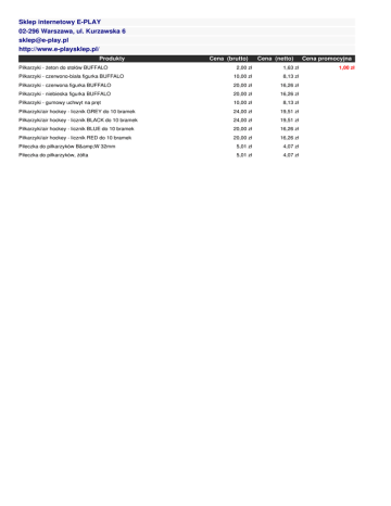 Sklep internetowy E-PLAY 02-296 Warszawa, ul. Kurzawska 6 [email protected] http://www.e-playsklep.pl/ Produkty Piłkarzyki - żeton do stołów BUFFALO Cena (brutto) Cena (netto) 2,00 zł 1,63 zł Piłkarzyki - czerwono-biała figurka BUFFALO 10,00 zł 8,13 zł Piłkarzyki - czerwona figurka BUFFALO 20,00 zł 16,26 zł Piłkarzyki - niebieska figurka BUFFALO 20,00 zł 16,26 zł Piłkarzyki - gumowy uchwyt na pręt 10,00 zł 8,13 zł Piłkarzyki/air hockey - licznik GREY do 10 bramek 24,00 zł 19,51 zł Piłkarzyki/air hockey - licznik BLACK do 10 bramek 24,00 zł 19,51 zł Piłkarzyki/air hockey - licznik BLUE do 10 bramek 20,00 zł 16,26 zł Piłkarzyki/air hockey - licznik RED do 10 bramek 20,00 zł 16,26 zł Piłeczka do piłkarzyków B&W 32mm 5,01 zł 4,07 zł Piłeczka do piłkarzyków, żółta 5,01 zł 4,07 zł Cena promocyjna 1,00 zł