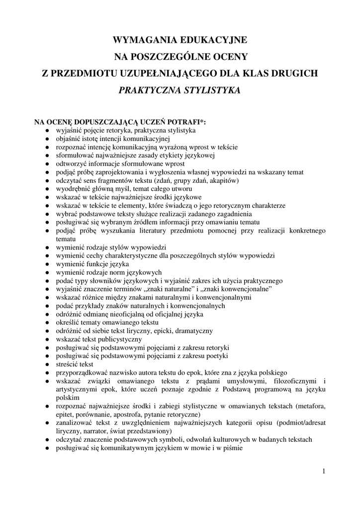 WYMAGANIA EDUKACYJNE NA POSZCZEGÓLNE OCENY Z PRZEDMIOTU UZUPEŁNIAJĄCEGO DLA KLAS DRUGICH PRAKTYCZNA STYLISTYKA NA OCENĘ DOPUSZCZAJĄCĄ UCZEŃ POTRAFI*: wyjaśnić pojęcie retoryka, praktyczna stylistyka objaśnić istotę intencji komunikacyjnej rozpoznać intencję komunikacyjną wyraŜoną wprost w tekście sformułować najwaŜniejsze zasady etykiety językowej odtworzyć informacje sformułowane wprost podjąć próbę zaprojektowania i wygłoszenia własnej wypowiedzi na wskazany temat odczytać sens fragmentów tekstu (zdań, grupy zdań, akapitów) wyodrębnić główną myśl, temat całego utworu wskazać w tekście najwaŜniejsze środki językowe wskazać w tekście te elementy, które świadczą o jego retorycznym charakterze wybrać podstawowe teksty słuŜące realizacji zadanego zagadnienia posługiwać się wybranym źródłem informacji przy omawianiu tematu podjąć próbę wyszukania literatury przedmiotu pomocnej przy realizacji konkretnego tematu wymienić rodzaje stylów wypowiedzi wymienić cechy charakterystyczne dla poszczególnych stylów wypowiedzi wymienić funkcje języka wymienić rodzaje norm językowych podać typy słowników językowych i wyjaśnić zakres ich uŜycia praktycznego wyjaśnić znaczenie terminów „znaki naturalne” i „znaki konwencjonalne” wskazać róŜnice między znakami naturalnymi i konwencjonalnymi podać przykłady znaków naturalnych i konwencjonalnych odróŜnić odmianę nieoficjalną od oficjalnej języka określić tematy omawianego tekstu odróŜnić od siebie tekst liryczny, epicki, dramatyczny wskazać tekst publicystyczny posługiwać się podstawowymi pojęciami z zakresu retoryki posługiwać się podstawowymi pojęciami z zakresu poetyki streścić tekst przyporządkować nazwisko autora tekstu do epok, które zna z języka polskiego wskazać związki omawianego tekstu z prądami umysłowymi, filozoficznymi i artystycznymi epok, które uczeń poznaje zgodnie z Podstawą programową na języku polskim rozpoznać najwaŜniejsze środki i zabiegi stylistyczne w omawianych tekstach (metafora, epitet, porównanie, apostrofa, pytanie retoryczne) zanalizować tekst z uwzględnieniem najwaŜniejszych kategorii opisu (podmiot/adresat liryczny, narrator, świat przedstawiony) odczytać znaczenie podstawowych symboli, odwołań kulturowych w badanych tekstach posługiwać się komunikatywnym językiem w mowie i w piśmie 1 wypowiadać się w mowie i w piśmie na zadany temat, w sposób świadczący o co najmniej częściowym zrozumieniu tematu odnieść się w wypowiedzi do tekstów literackich podjąć próbę skomponowania wypowiedzi składającej się ze wstępu, rozwinięcia i zakończenia samodzielnie prowadzić zeszyt przedmiotowy realizować przynajmniej połowę obowiązkowych zadań przewidzianych przez nauczyciela * przy wskazanych umiejętnościach i zakresie wiedzy dopuszczalne są: stereotypowość wypowiedzi, uboga treść, streszczanie tekstu zamiast analizy i interpretacji, drobne błędy rzeczowe, błędy kompozycyjne, błędy stylistyczne, składniowe, frazeologiczne, fleksyjne, interpunkcyjne i ortograficzne). NA OCENĘ DOSTATECZNĄ UCZEŃ POTRAFI TO, CO NA DOPUSZCZAJĄCĄ, A PONADTO: wskazać genezę i zakres działania retoryki wskazać cechy charakterystyczne dla tzw. tekstów retorycznych określić funkcję środków językowych w tekście retorycznym sformułować tezę tekstu bądź fragmentu tekstu podać argumenty na rzecz tezy odróŜnić argumenty od przykładów oraz tezę od hipotezy oddzielić informację od opinii wskazać związki przyczynowo-skutkowe w tekście rozpoznać relacje kompozycyjne między poszczególnymi fragmentami tekstu wyszukać podstawowe pozycje z literatury przedmiotu słuŜącej realizacji omawianego zagadnienia korzystać samodzielnie ze słowników i leksykonów wyjaśniać róŜnice pomiędzy stylem artystycznym a stylami funkcjonalnymi przytoczyć przykłady ilustrujące róŜne rodzaje norm językowych wyjaśnić terminy: symptomy, ikony, kod, akt komunikacji, komunikat językowy, konwencja językowa wymienić elementy budujące akt komunikacyjny przedstawić funkcje języka i podać przykłady je obrazujące wymienić przyczyny powstawania języków środowiskowych i zawodowych określić tematykę wszystkich omawianych tekstów rozpoznać w wypowiedziach zawartych w badanym tekście intencję komunikacyjną wyartykułowaną wprost i w sposób niejednoznaczny podać najwaŜniejsze cechy rodzajowe badanych tekstów lirycznych, epickich, dramatycznych scharakteryzować, podając najwaŜniejsze wyróŜniki, omawiane i realizowane na lekcjach teksty (np. recenzję, rozprawkę, wypowiedź argumentacyjną, wywiad itp.) wymienić cechy specyficzne dla tekstów publicystycznych wyjaśnić róŜnicę między literaturą a publicystyką oraz literaturą a retoryką powiązać fakty opisywane w omawianych tekstach z kontekstem historycznoliterackim wskazać i opisać motywy i tematy literackie obecne w omawianych tekstach wykorzystać podstawowe konteksty do analizy i interpretacji badanych tekstów odczytać nawiązania kulturowe obecne w tekstach zinterpretować znaczenie podstawowych symboli uŜytych w omawianych tekstach 2 zaprojektować szkicowo temat i plan oraz przygotować na jego podstawie wypowiedź ustną bądź pisemną zbudować wypowiedź zawierającą wstęp, rozwinięcie i zakończenie podjąć próbę wygłoszenia przygotowanego tekstu samodzielnie analizować tekst i na tej podstawie formułować wnioski interpretacyjne wyodrębniać cytaty uŜyteczne do argumentacji i posługiwać się nimi w funkcji argumentacyjnej posługiwać się na ogół poprawną polszczyzną (w zakresie wymowy, fleksji, leksyki, frazeologii, składni) zabierać głos w dyskusji wykonywać bez pomocy nauczyciela większość ćwiczeń i zadań realizowanych na zajęciach NA OCENĘ DOBRĄ UCZEŃ POTRAFI TO, CO NA OCENĘ DOSTATECZNĄ, A PONADTO: wyjaśnić praktyczne oddziaływa