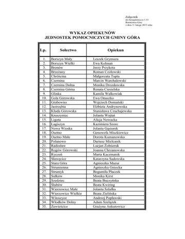 Załącznik do Zarządzenia nr 1/15 Burmistrza Góry z dnia 11 lutego 2015 roku WYKAZ OPIEKUNÓW JEDNOSTEK POMOCNICZYCH GMINY GÓRA Lp. 1. 2. 3. 4. 5. 6. 7. 8. 9. 10. 11. 12. 13. 14. 15. 16. 17. 18. 19. 20. 21. 22. 23. 24. 25. 26. 27. 28. 29. 30. 31. 32. 33. 34. 35. Sołectwo Borszyn Mały Borszyn Wielki Bronów BrzeŜany Chróścina Czernina Czernina Dolna Czernina Górna Glinka Gola Górowska Grabowno Jastrzębia Kłoda Górowska Kruszyniec Ligota Łagiszyn Nowa Wioska Osetno Osetno Małe Polanowo Radosław Rogów Górowski Ryczeń Sławęcice Stara Góra Strumienna Strumyk Sułków Szedziec Ślubów Wierzowice Małe Wierzowice Wielkie Witoszyce Włodków Dolny Zawieścice Opiekun Leszek Grymuza Ewa Kolman Jerzy Przykota Roman Czołowski Małgorzata Tupta Marcin Warchalewski Monika Drozdowska Renata Ciesielska Kamila Walkowiak Ewa Onuszko Wojciech Domański ElŜbieta Andrynowska Stanisława Czuchajewska Jolanta Wojtaś Alicja Nowacka Kazimiera Szorc Jolanta Gąsiorek Genowefa Miszkiewicz Dorota Kumanowska Dariusz Mielcarek Lucjan śołnieruk Joanna Chrzanowska Marta Kaczmarek Katarzyna Sadowska Agnieszka Mazur Agnieszka Gniecka Bogumiła Płaczek Monika Kirst Beata Buczyńska Beata Kwiring Jolanta Szlafka Beata Zielińska Andrzej Popławski Adam SzeląŜek GraŜyna Ankutowicz