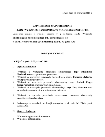 Łódź, dnia 11 czerwca 2015 r. ZAPROSZENIE NA POSIEDZENIE RADY WYDZIAŁU EKONOMICZNO-SOCJOLOGICZNEGO UŁ Uprzejmie proszę o wzięcie udziału w posiedzeniu Rady Wydziału Ekonomiczno-Socjologicznego UŁ, które odbędzie się w dniu 15 czerwca 2015 (poniedziałek) 2015 r. od godz. 9.30 PORZĄDEK OBRAD I CZĘŚĆ – godz. 9.30, sala C 140 I. Sprawy naukowe 1. Wniosek o wszczęcie przewodu doktorskiego mgr Khaliunaa Erdenekhuu oraz powołanie promotora. Wniosek o wszczęcie przewodu doktorskiego mgra Tomasza Jakubca oraz powołanie promotora. Wniosek o wszczęcie przewodu doktorskiego mgr Izabeli KopySzczurkowskiej oraz powołanie promotora. Wniosek o wszczęcie przewodu doktorskiego mgr Ewy Stawasz oraz powołanie promotora i promotora pomocniczego. 2. 3. 4. 5. Wniosek w sprawie powołania recenzentów rozprawy doktorskiej mgr Edyty Łaszkiewicz. 6. Informacja o zasadach punktacji czasopism – dr hab. M. Plich, prof. nadzw. UŁ II. Sprawy kadrowe 1. 2. Wnioski o ogłoszenie konkursów. Wnioski o zatrudnienie. III. Sprawy finansowe 1. Sprawy finansowe – propozycja podziału premii i nagród za rok 2014 IV. Sprawy programowo-organizacyjne 2. Zatwierdzenie tematów prac dyplomowych w roku akademickim 2014/2015. Wniosek w sprawie zniesienia indeksów na studiach doktoranckich. V. Sprawy współpracy z zagranicą 1. Wniosek o zawarcie porozumienia ramowego o współpracy pomiędzy Uniwersytetem Łódzkim a Universidad Autonoma Del Estado de Mexico Facultad de Economia, Meksyk. Wniosek o zawarcie porozumienia ramowego o współpracy pomiędzy Uniwersytetem Łódzkim a Lviv Academy of Commerce (LAC), Ukraina. Wniosek o zawarcie porozumienia ramowego o współpracy pomiędzy Uniwersytetem Łódzkim a Henan University, Chiny. 1. 2. 3. II CZĘŚĆ – godz. 12.00, sala T 401 Kolokwium habilitacyjne dr Beaty Pawłowskiej. Dziekan Wydziału Ekonomiczno-Socjologicznego UŁ dr hab. Paweł Starosta, prof. nadzw. UŁ
